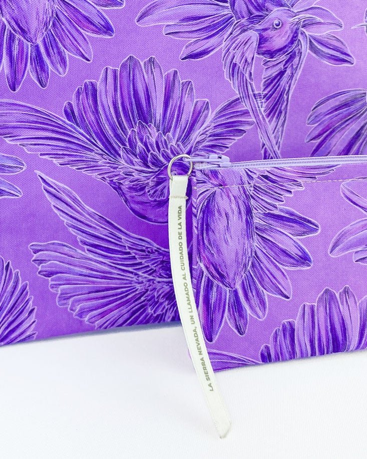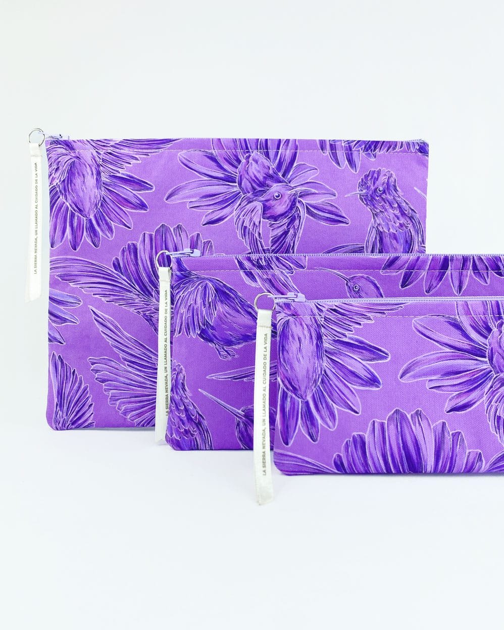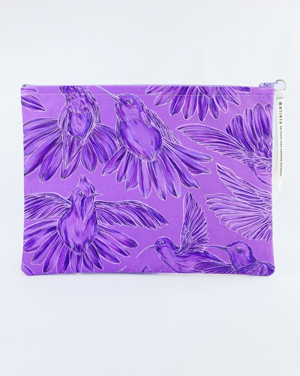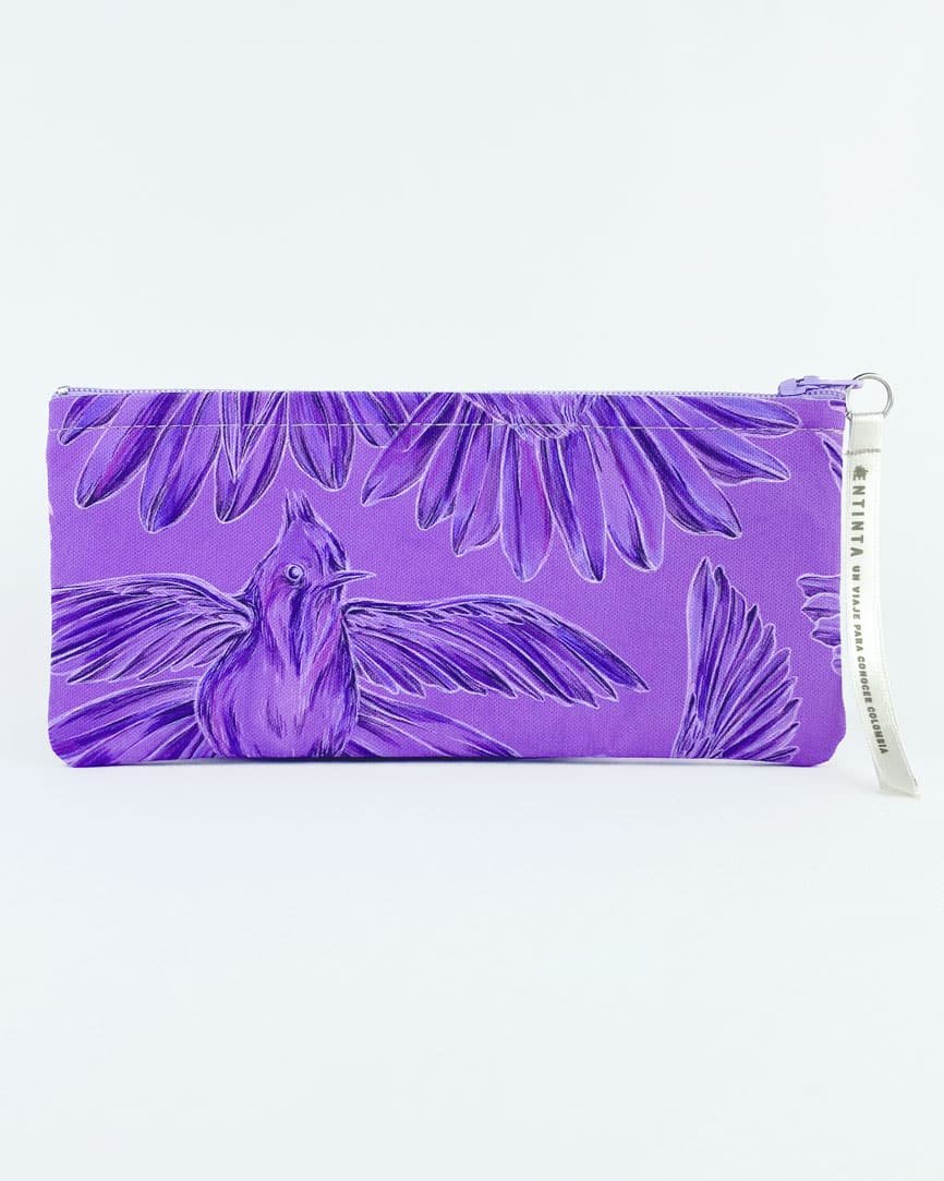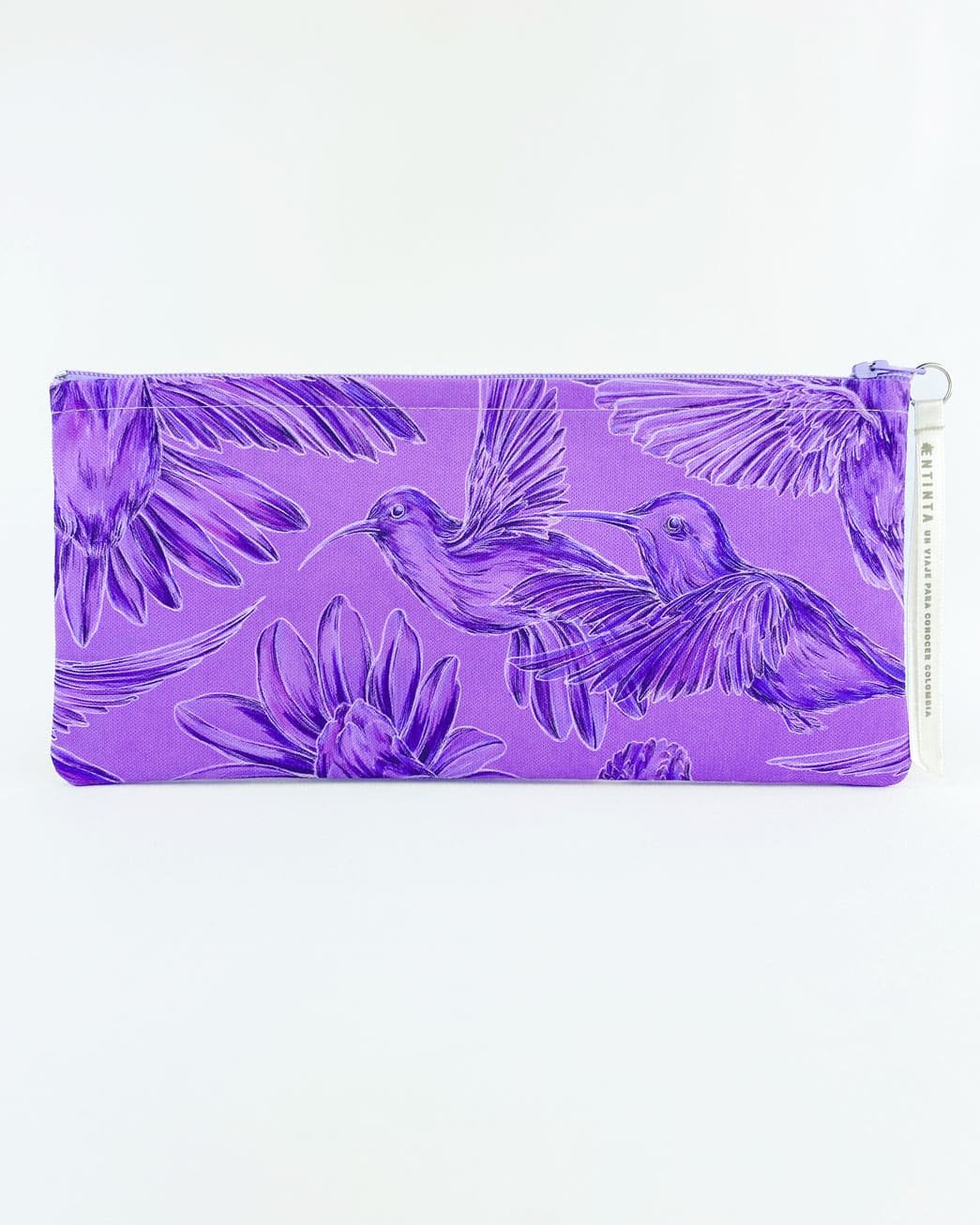 Cartuchera con nuestro estampado “Colibríes, mensajeros del mundo natural y espiritual – Con sus alas desplegadas y plumajes vistosos los colibríes vuelan y bailan por La Sierra Nevada. Con sus cantos relatan los secretos de la montaña y propagan los mensajes de la naturaleza, pronosticando las lluvias y sequías, y anunciando los tiempos de siembra y cosecha.”