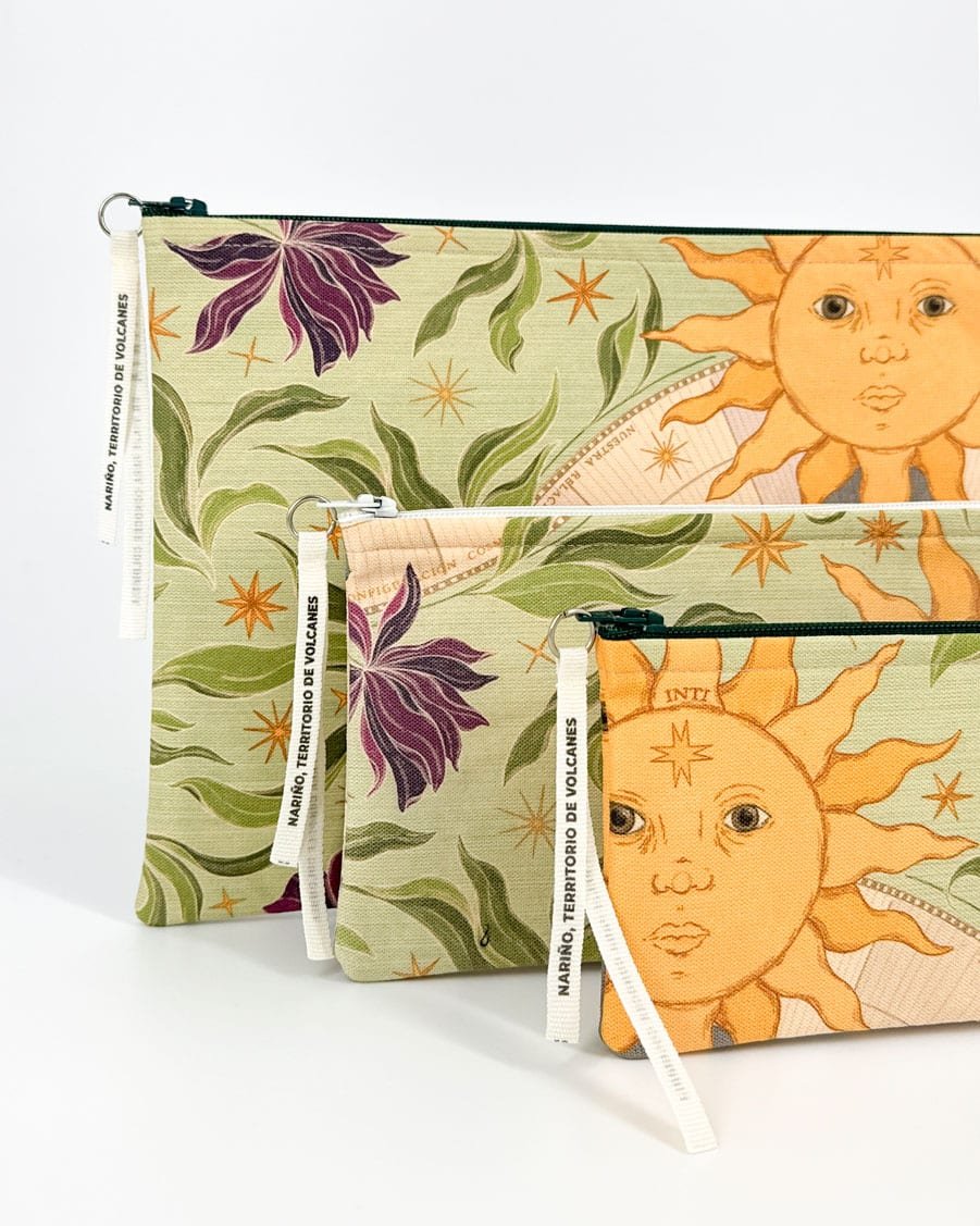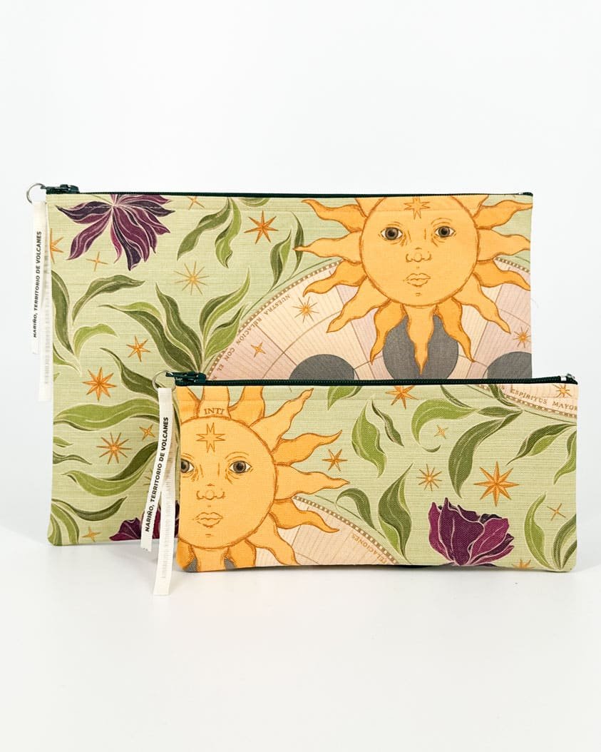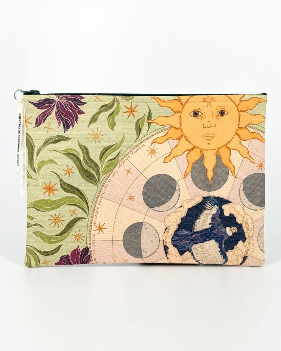 Cartuchera con nuestro estampado “El Mundo Celeste, manifestación cíclica de la naturaleza – El Dios Sol Inti, la Diosa Luna Quilla y las Estrellas, deidades celestes que influyen, conforme a sus ciclos y ritmos, en la vida humana, la naturaleza y el equilibrio armónico del universo.”