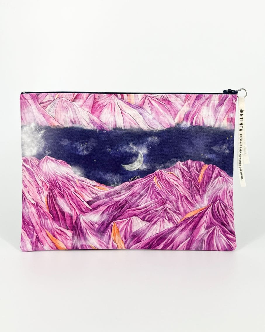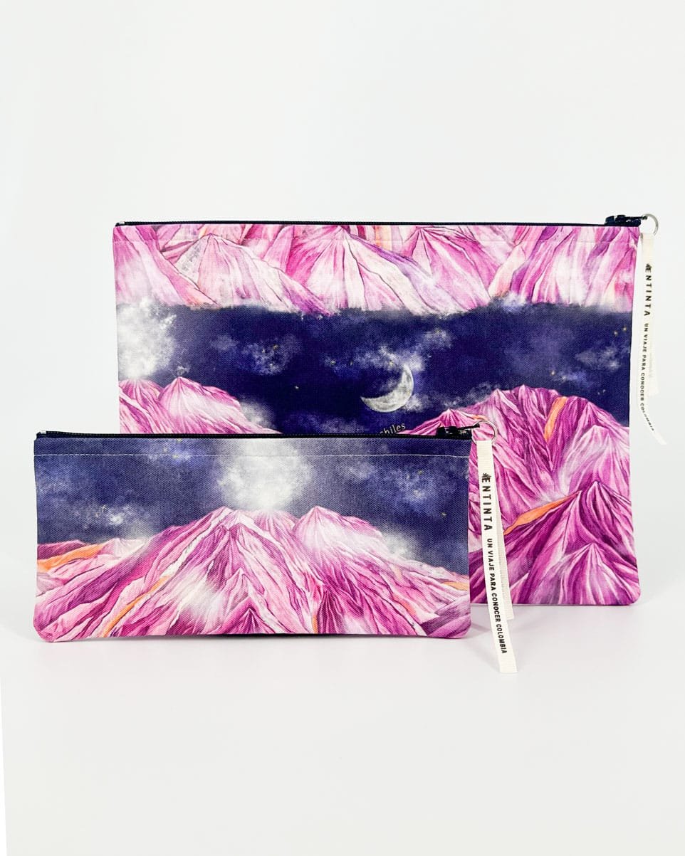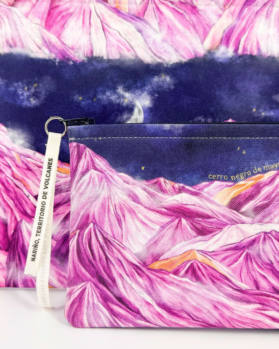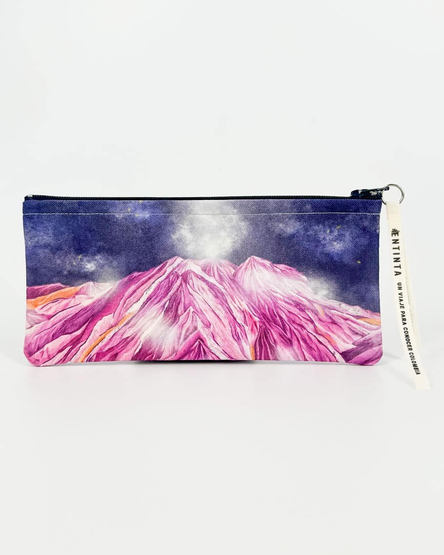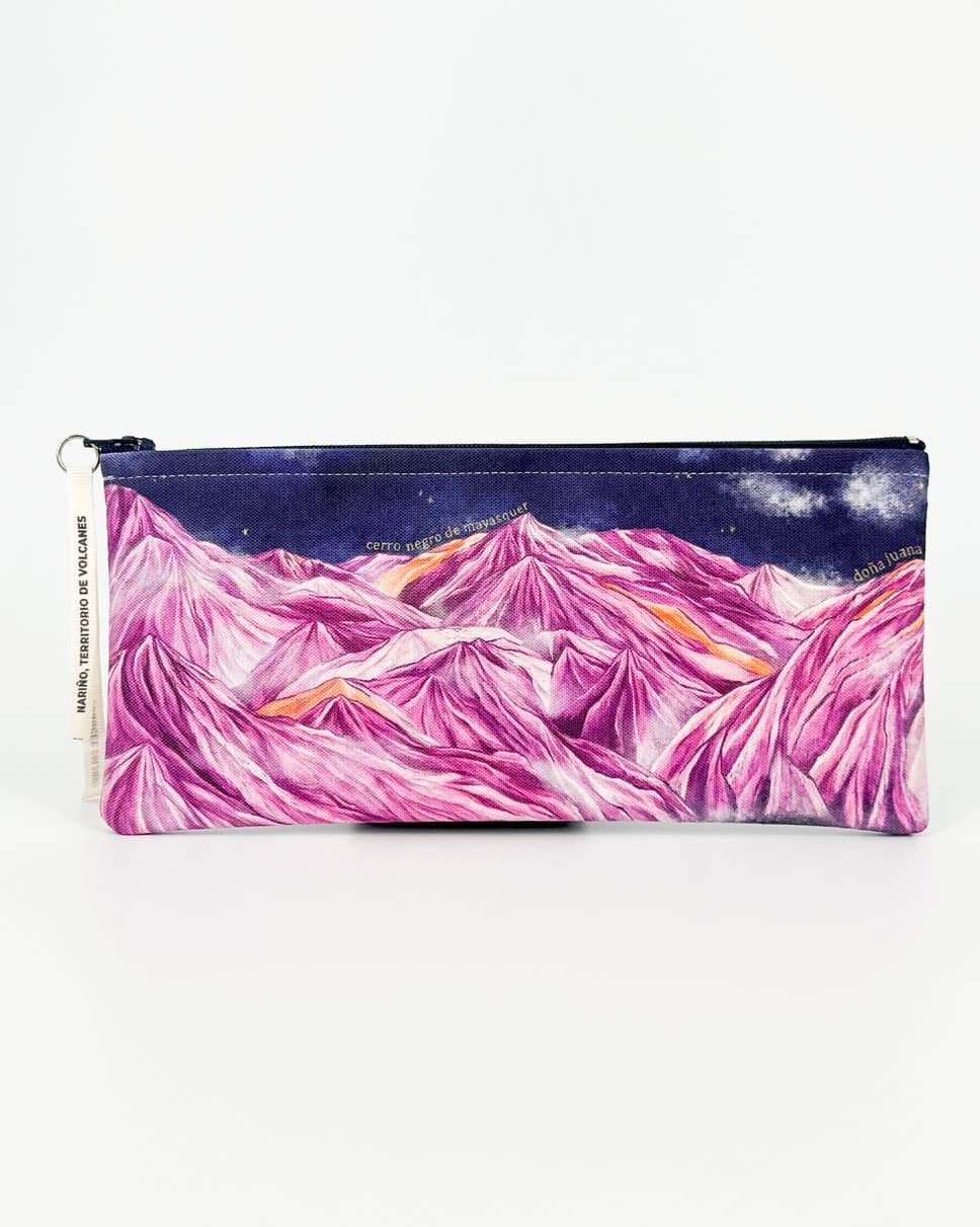 Cartuchera con nuestro estampado  “La Ruta del Fuego de Nariño – La geografía sagrada de Nariño se eleva con la imponencia de sus volcanes, montañas de fuego que ponen en manifiesto la fuerza de la naturaleza. Guardianes milenarios, símbolos de poder y fertilidad, lugar donde el territorio respira liberando su energía a través de cráteres.”