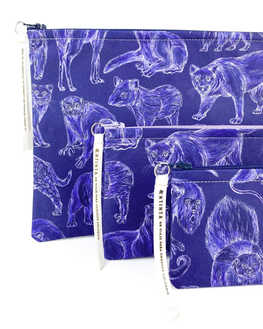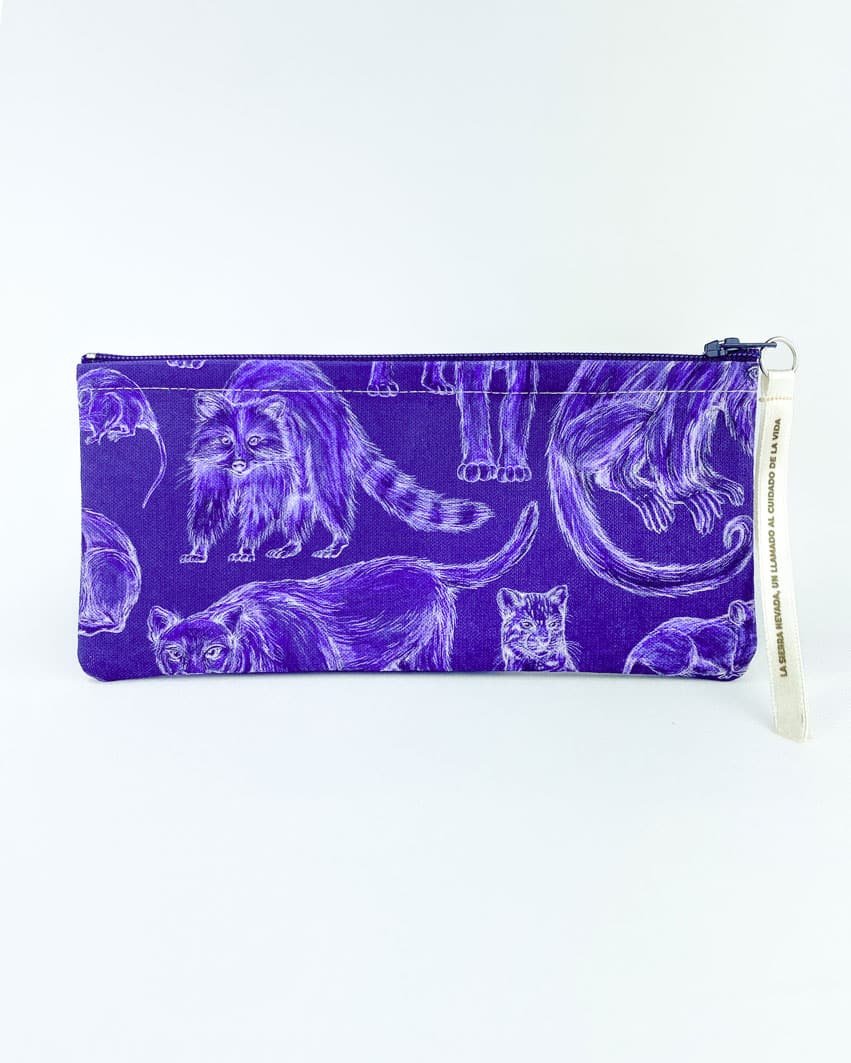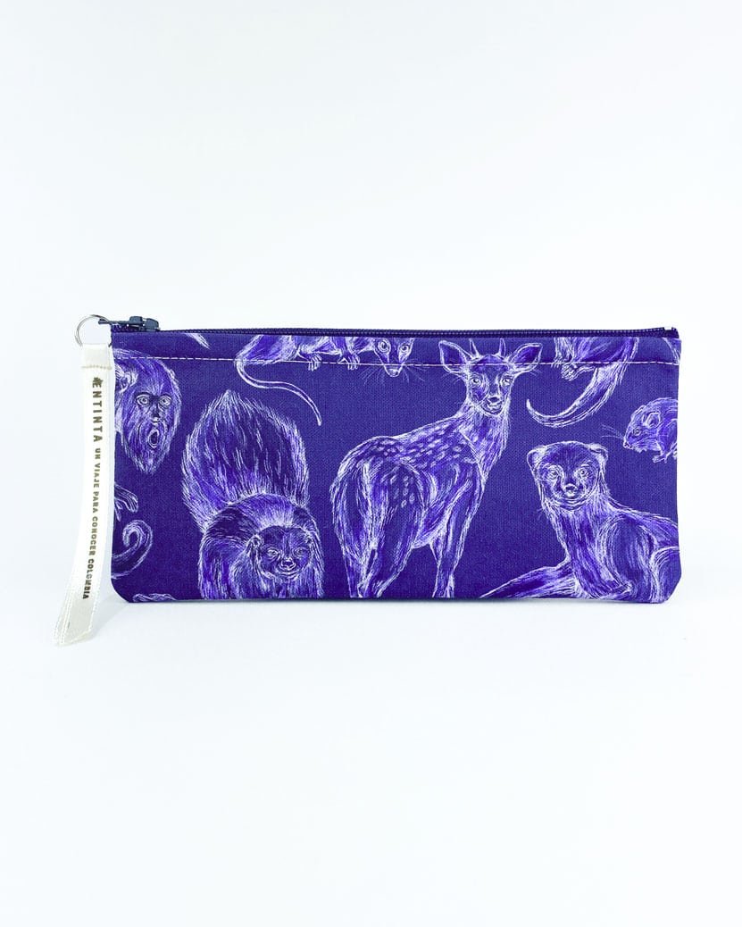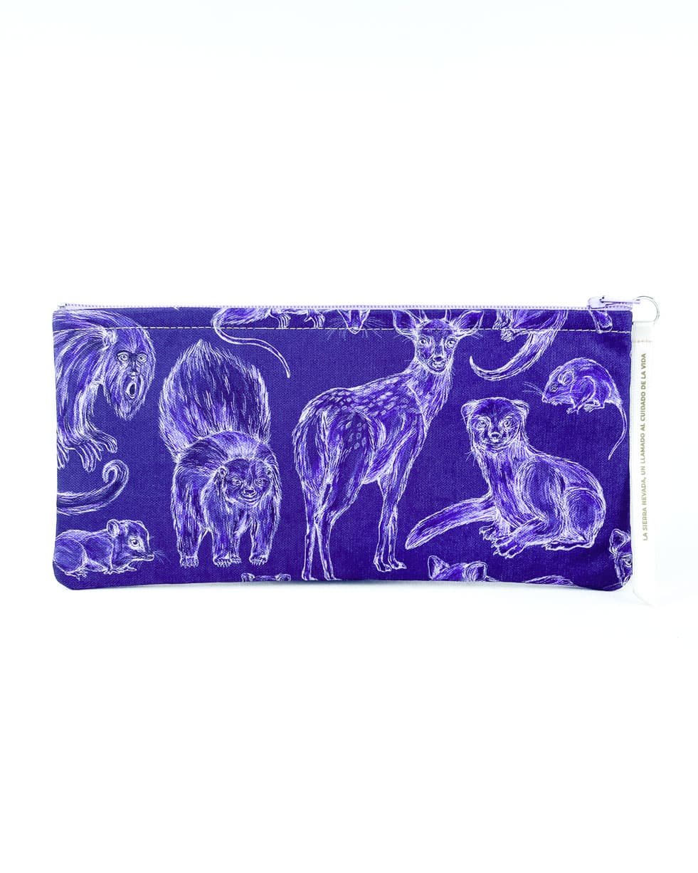 Cartuchera con nuestro estampado “Mamíferos de La Sierra, cuidadores de la armonía – Desde los más pequeños hasta los más grandes, los mamíferos de La Sierra son seres vivos y espirituales, autoridades y guardianes del territorio. Protegen y cuidan la conectividad de La Sierra participando en la dinámica natural de los ecosistemas.”.