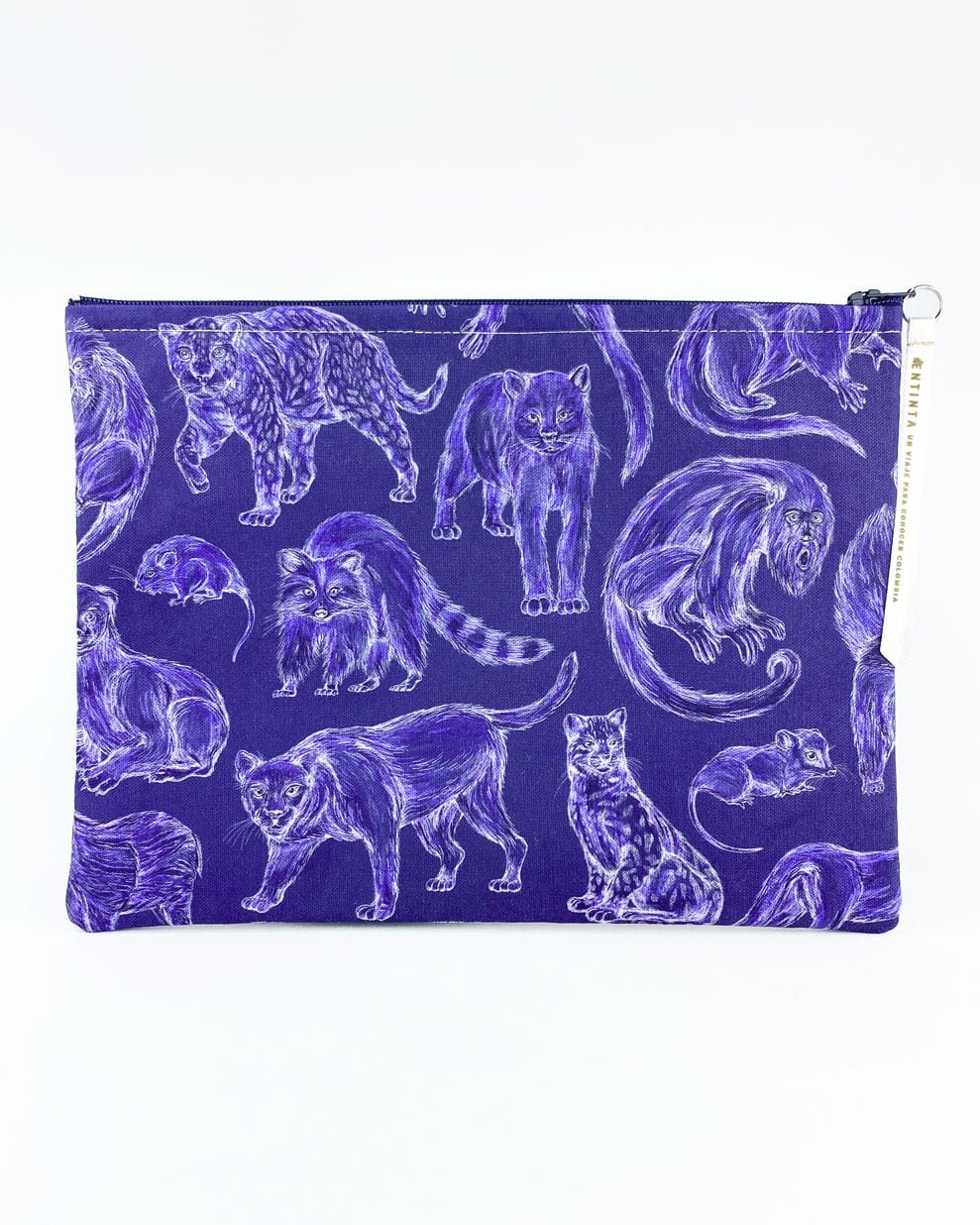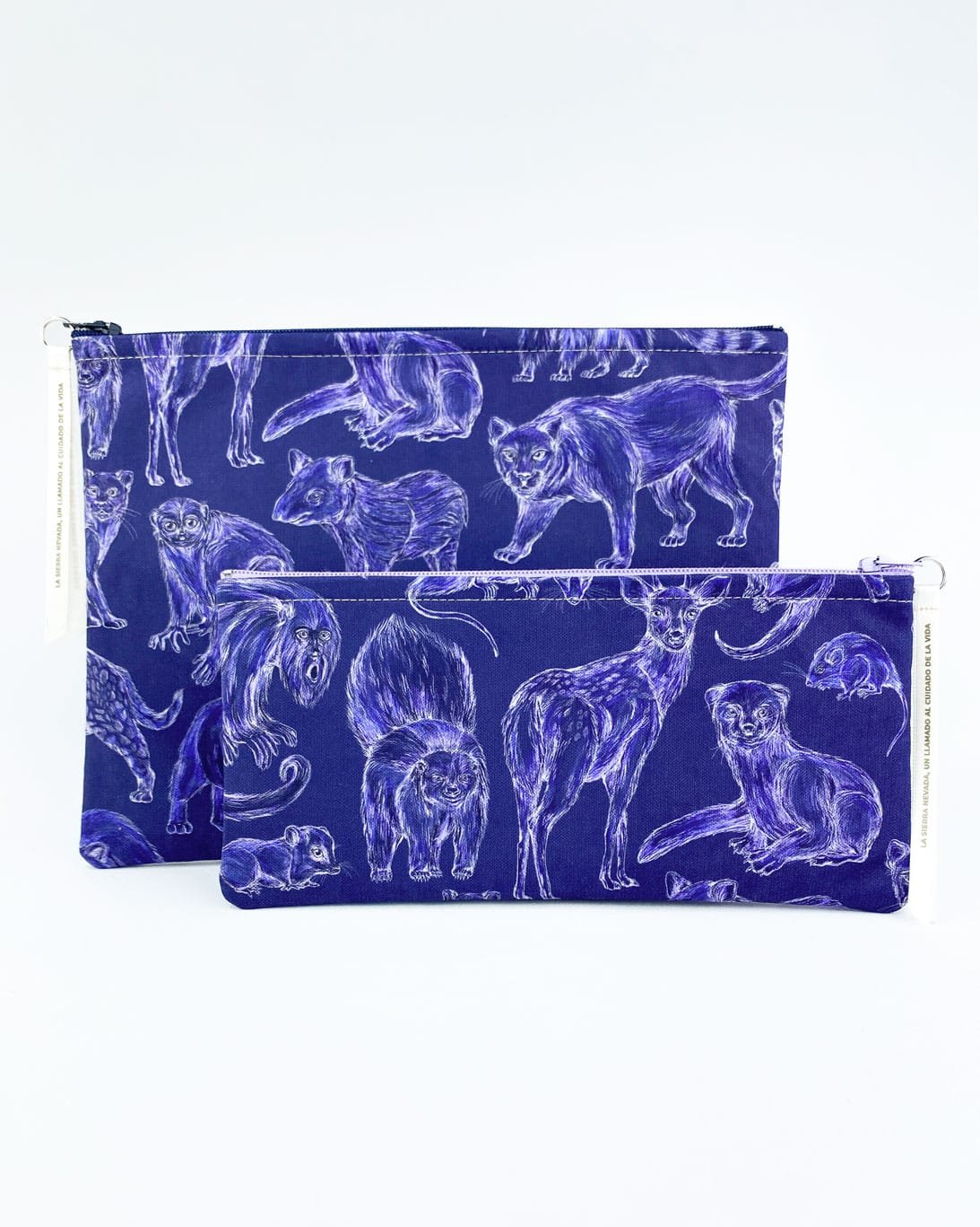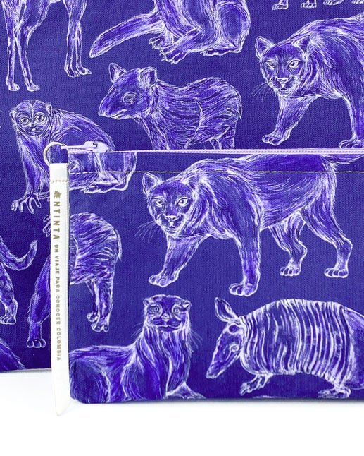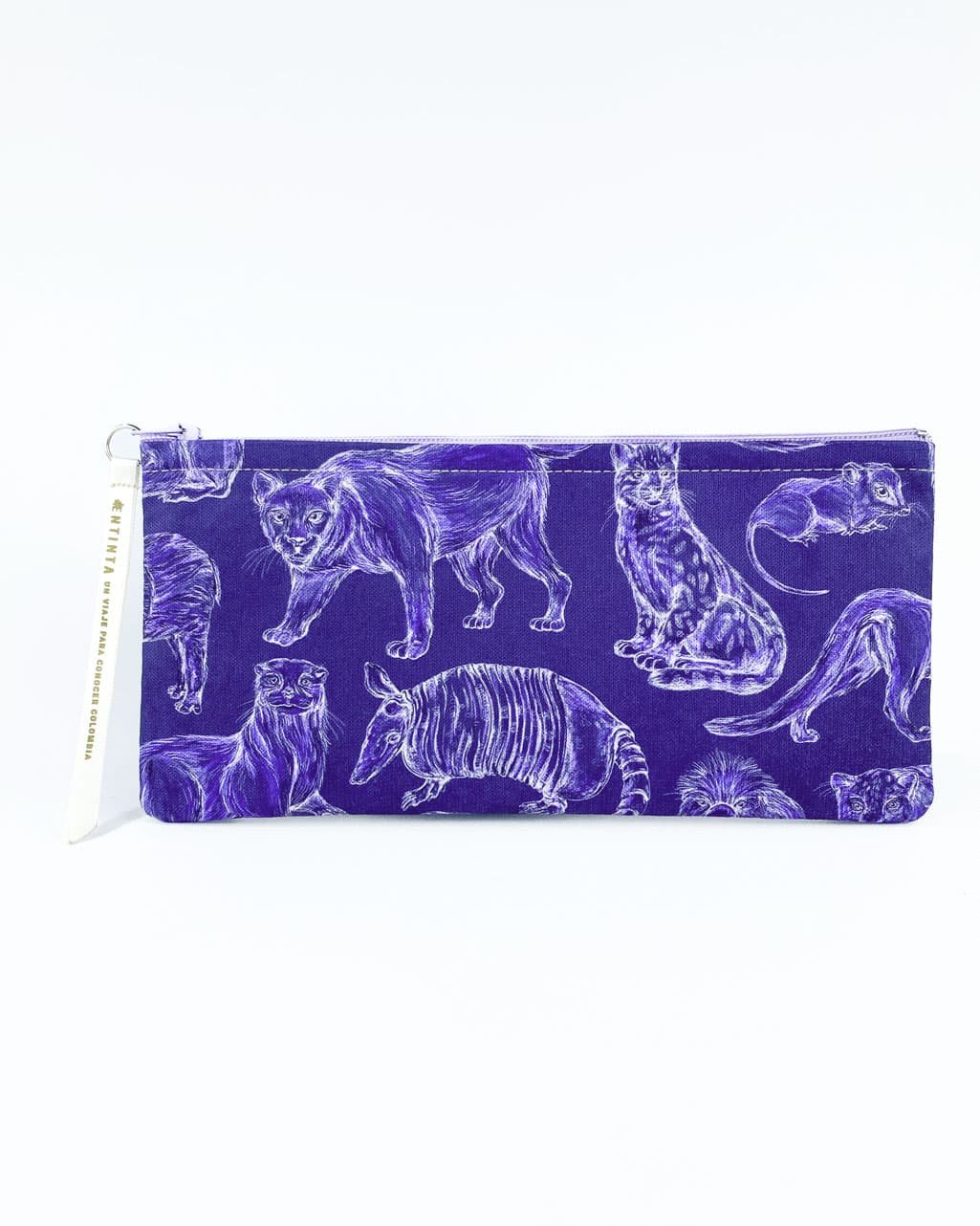 Cartuchera con nuestro estampado “Mamíferos de La Sierra, cuidadores de la armonía – Desde los más pequeños hasta los más grandes, los mamíferos de La Sierra son seres vivos y espirituales, autoridades y guardianes del territorio. Protegen y cuidan la conectividad de La Sierra participando en la dinámica natural de los ecosistemas.”.