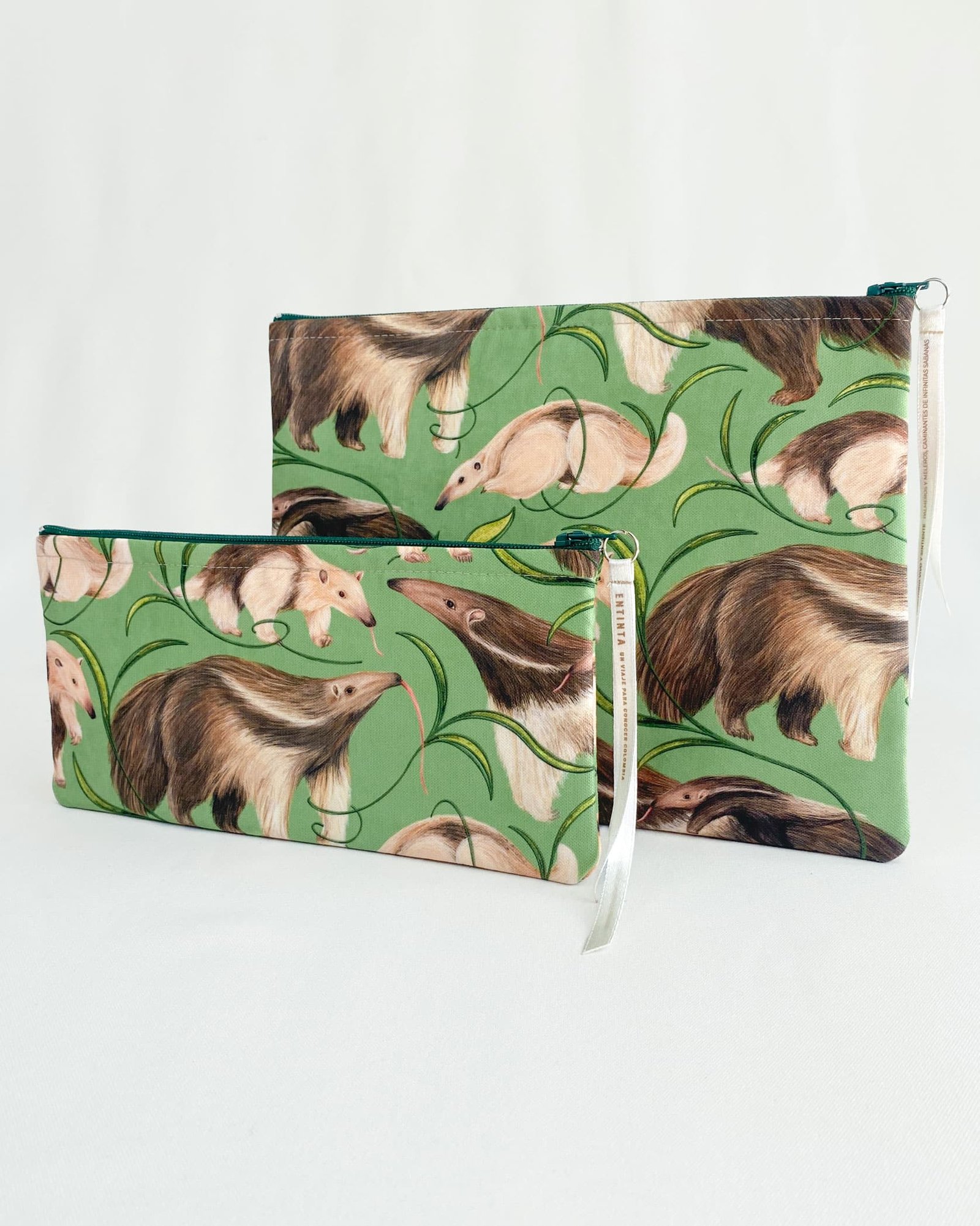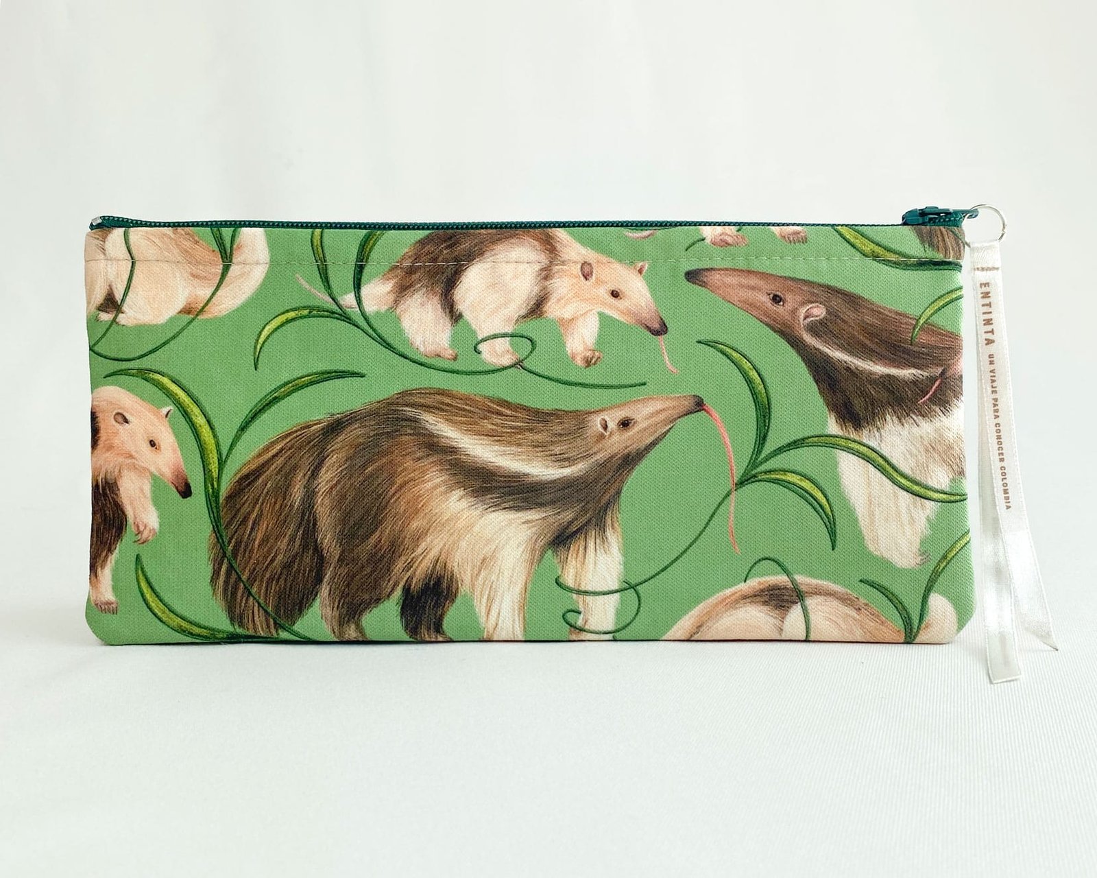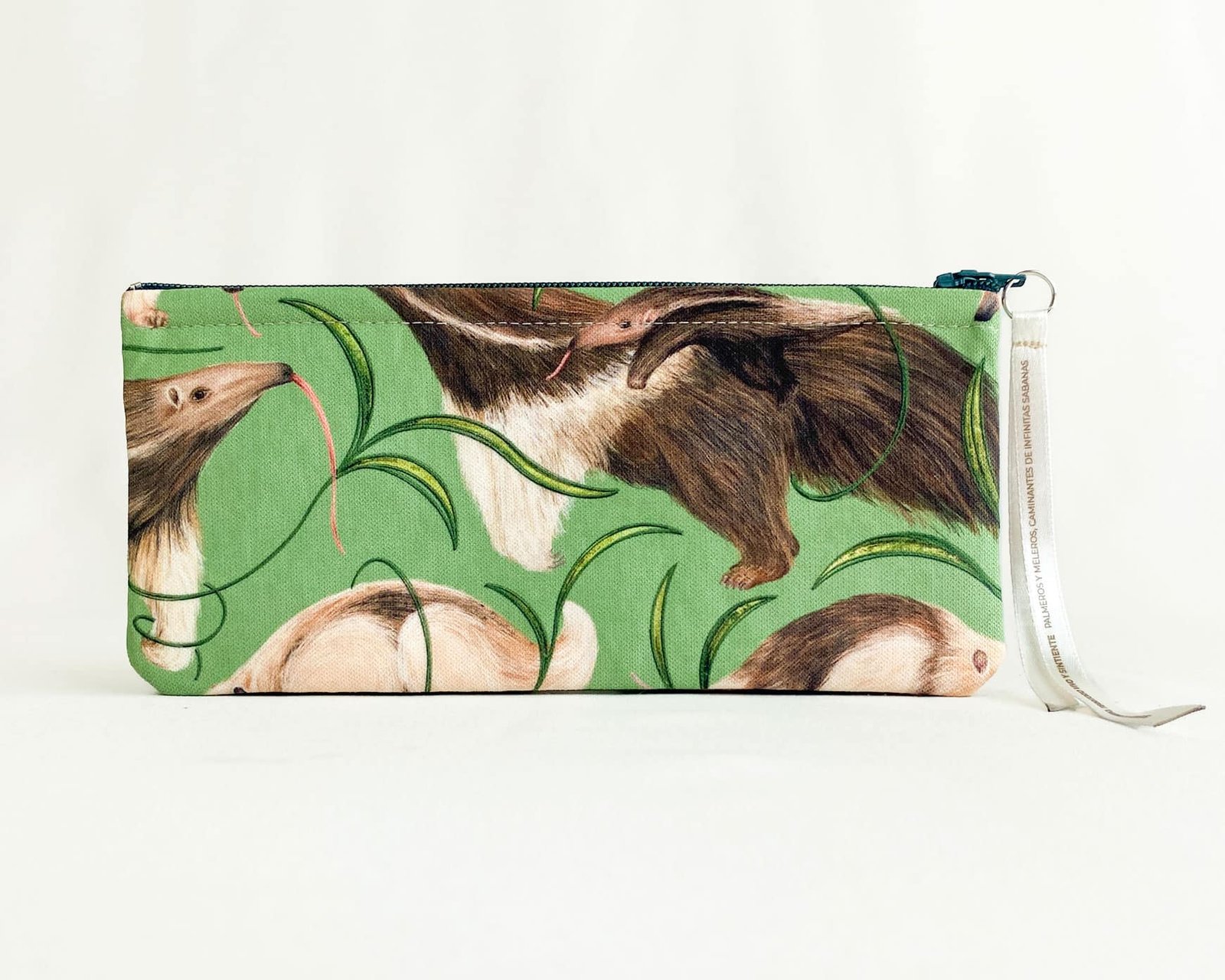 Cartuchera con nuestro estampado “Palmeros y Meleros, Caminantes de Infinitas Sabanas – Escondiéndose entre los pastizales de las llanuras caminan silenciosamente los osos palmeros y meleros, en búsqueda de insectos que atrapan con su lengua larga y pegajosa”.
