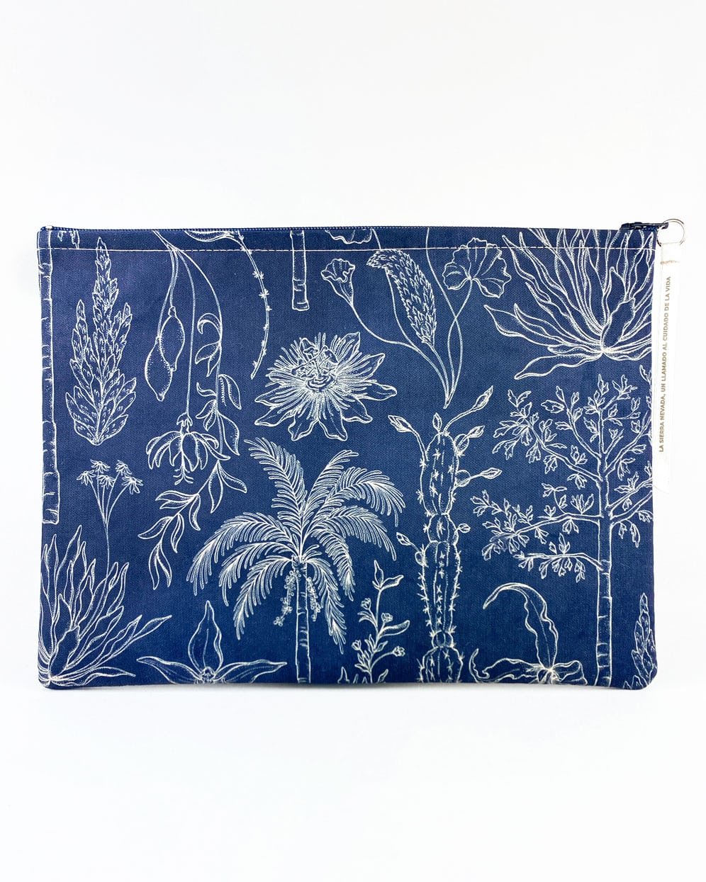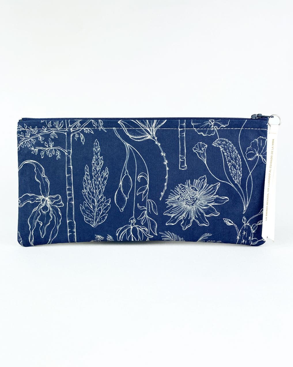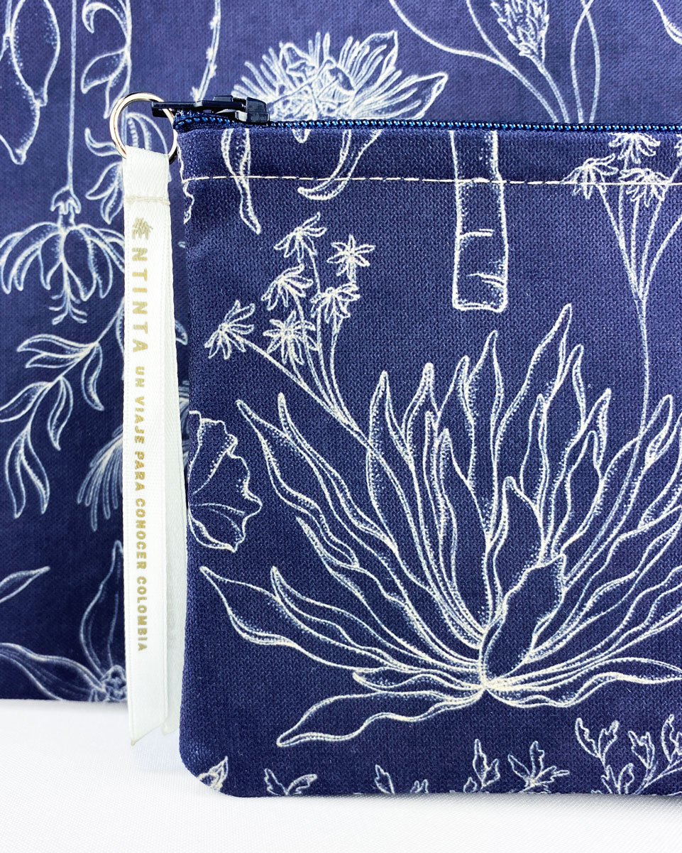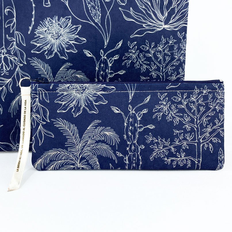 Cartuchera con nuestro estampado “Vegetación de La Sierra, heterogénea, relacional y vital – Un panorama de colores, tamaños y formas que cambia cada paso hacia arriba. Desde el mar caribe hasta los picos nevados, a cada planta de La Sierra se le asignó una función ecológica y espiritual que cumplir en el tejido de la vida. Hay plantas medicinales, comestibles, de uso ceremonial, para construir y tinturar.”.