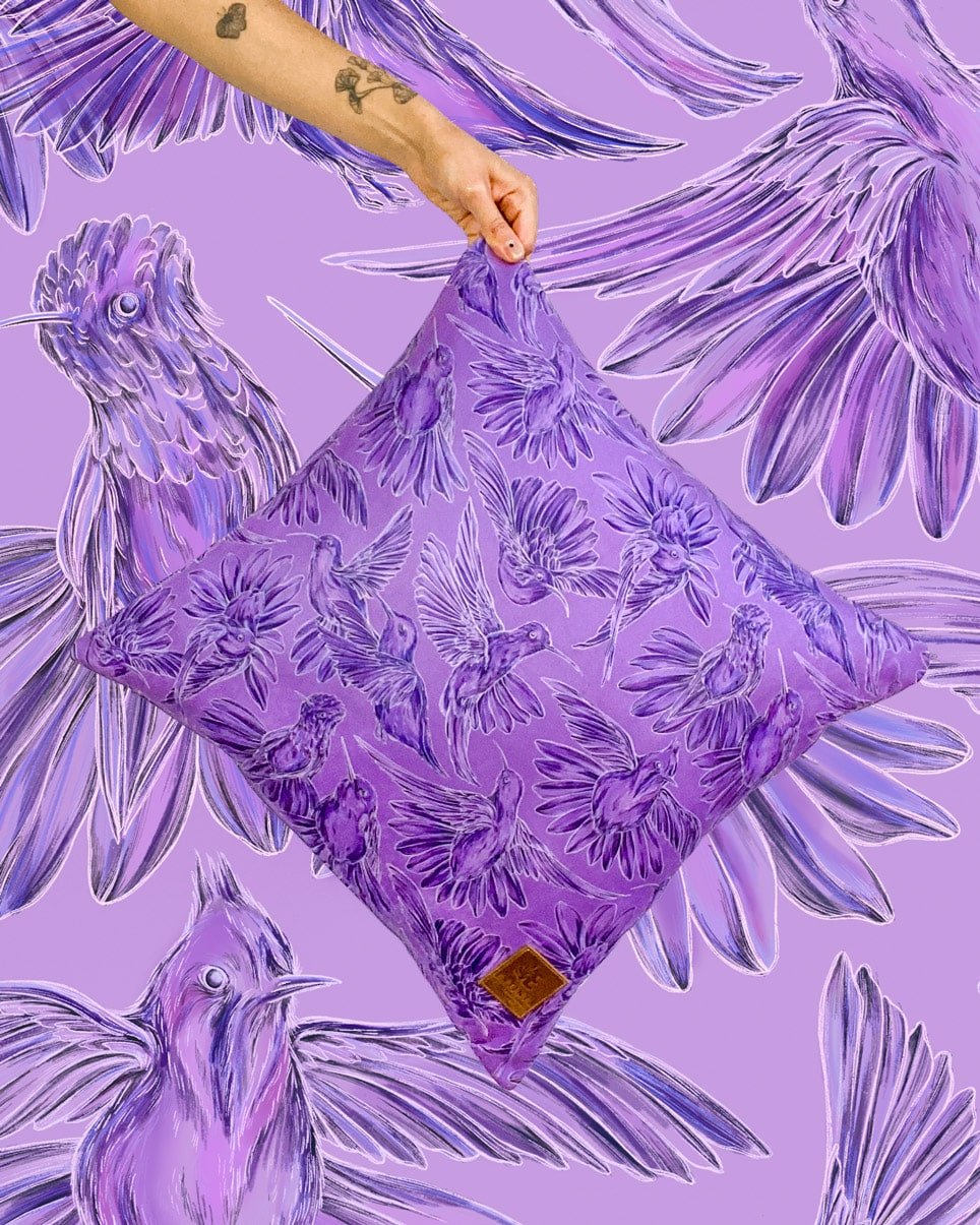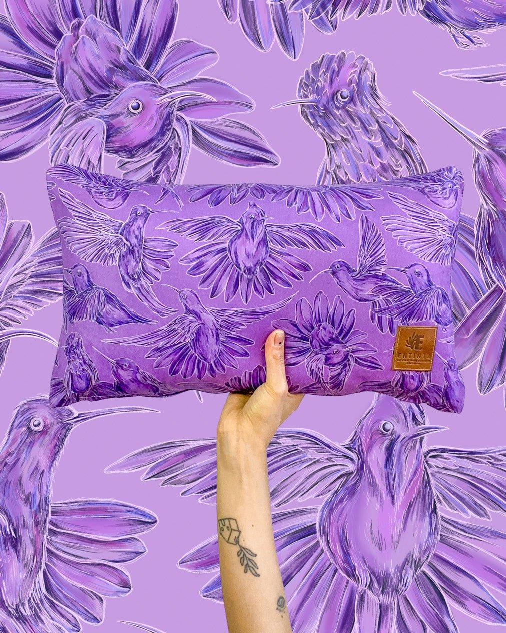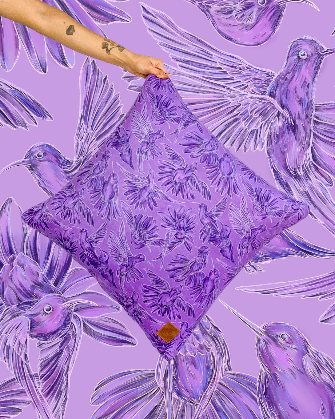 Cojines con nuestro estampado “Colibríes, mensajeros del mundo natural y espiritual – Con sus alas desplegadas y plumajes vistosos los colibríes vuelan y bailan por La Sierra Nevada. Con sus cantos relatan los secretos de la montaña y propagan los mensajes de la naturaleza, pronosticando las lluvias y sequías, y anunciando los tiempos de siembra y cosecha.”