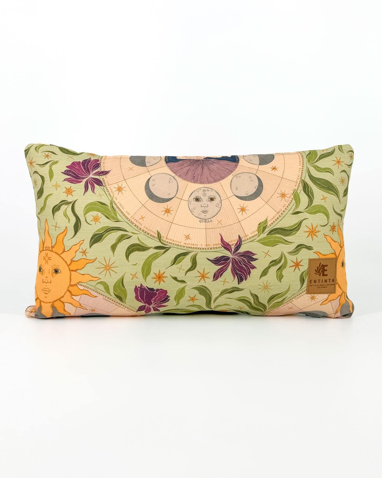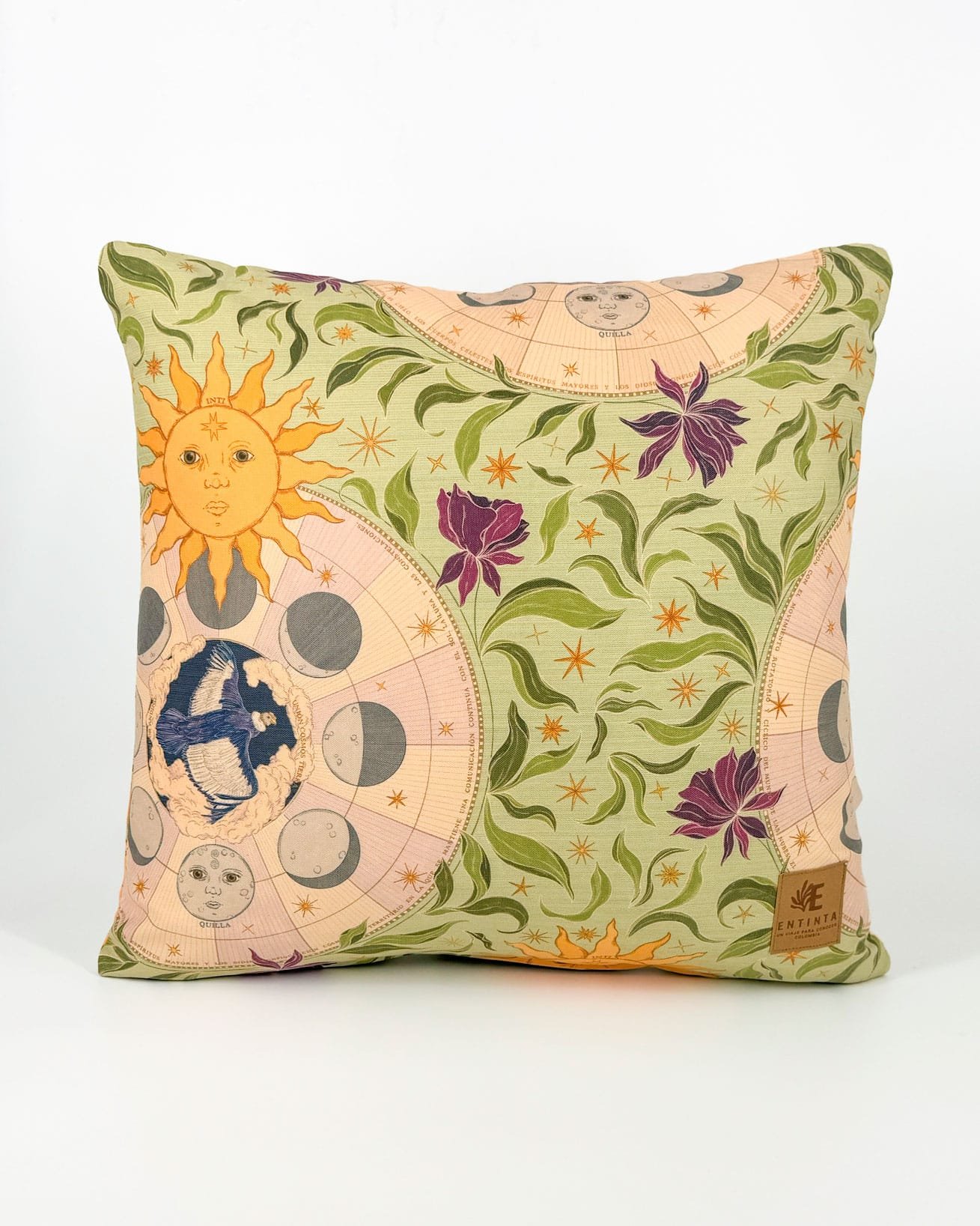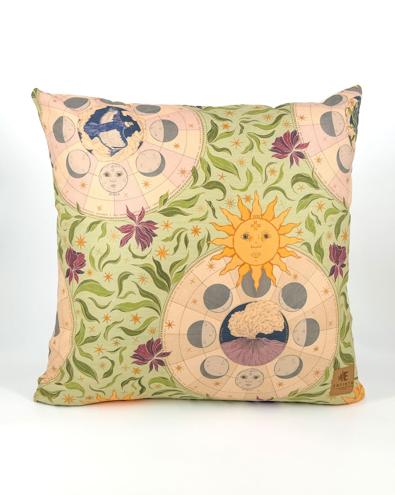 Cojines con nuestro estampado  “El Mundo Celeste, manifestación cíclica de la naturaleza – El Dios Sol Inti, la Diosa Luna Quilla y las Estrellas, deidades celestes que influyen, conforme a sus ciclos y ritmos, en la vida humana, la naturaleza y el equilibrio armónico del universo.”
