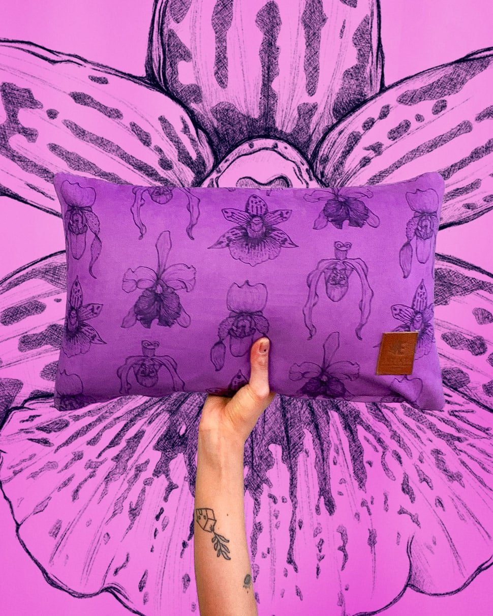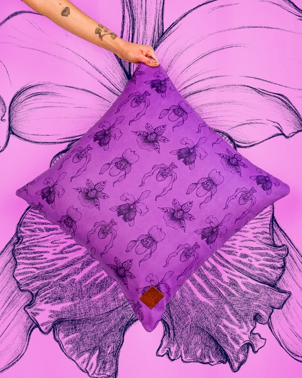 Cojines con nuestro estampado “La Magia de las Orquídeas – Flores complejas y simétricas que evocan la exuberancia de los bosques”.