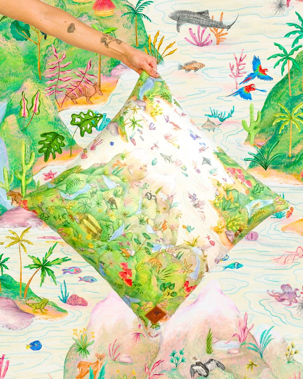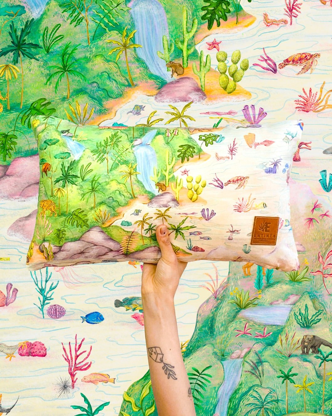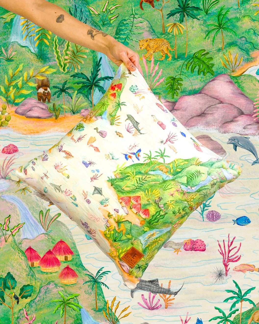Cojines con nuestro estampado “La Sierra Nevada, un ecosistema de vidas en conexión – De agudas pendientes y abarcando todos los pisos térmicos, La Sierra es un espacio de intercambio de vitalidad. Un escenario natural único que nos pone en manifiesto que el convivir en reciprocidad es lo que garantiza la vida.”
