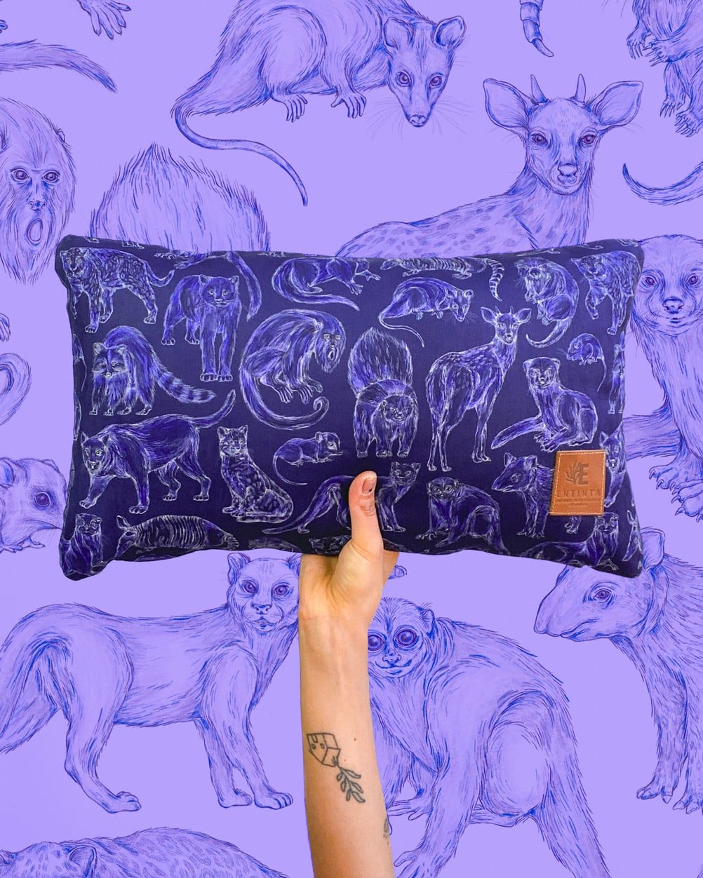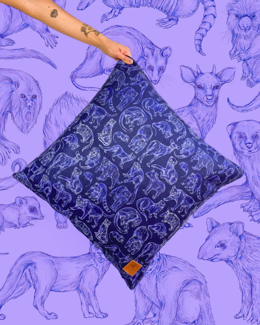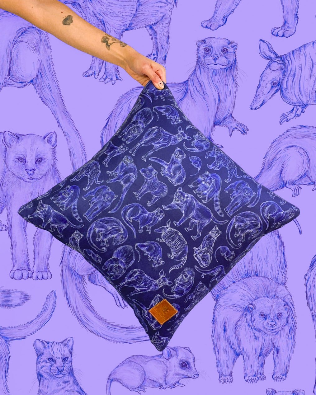 Cojines con nuestro estampado “Mamíferos de La Sierra, cuidadores de la armonía – Desde los más pequeños hasta los más grandes, los mamíferos de La Sierra son seres vivos y espirituales, autoridades y guardianes del territorio. Protegen y cuidan la conectividad de La Sierra participando en la dinámica natural de los ecosistemas.”.