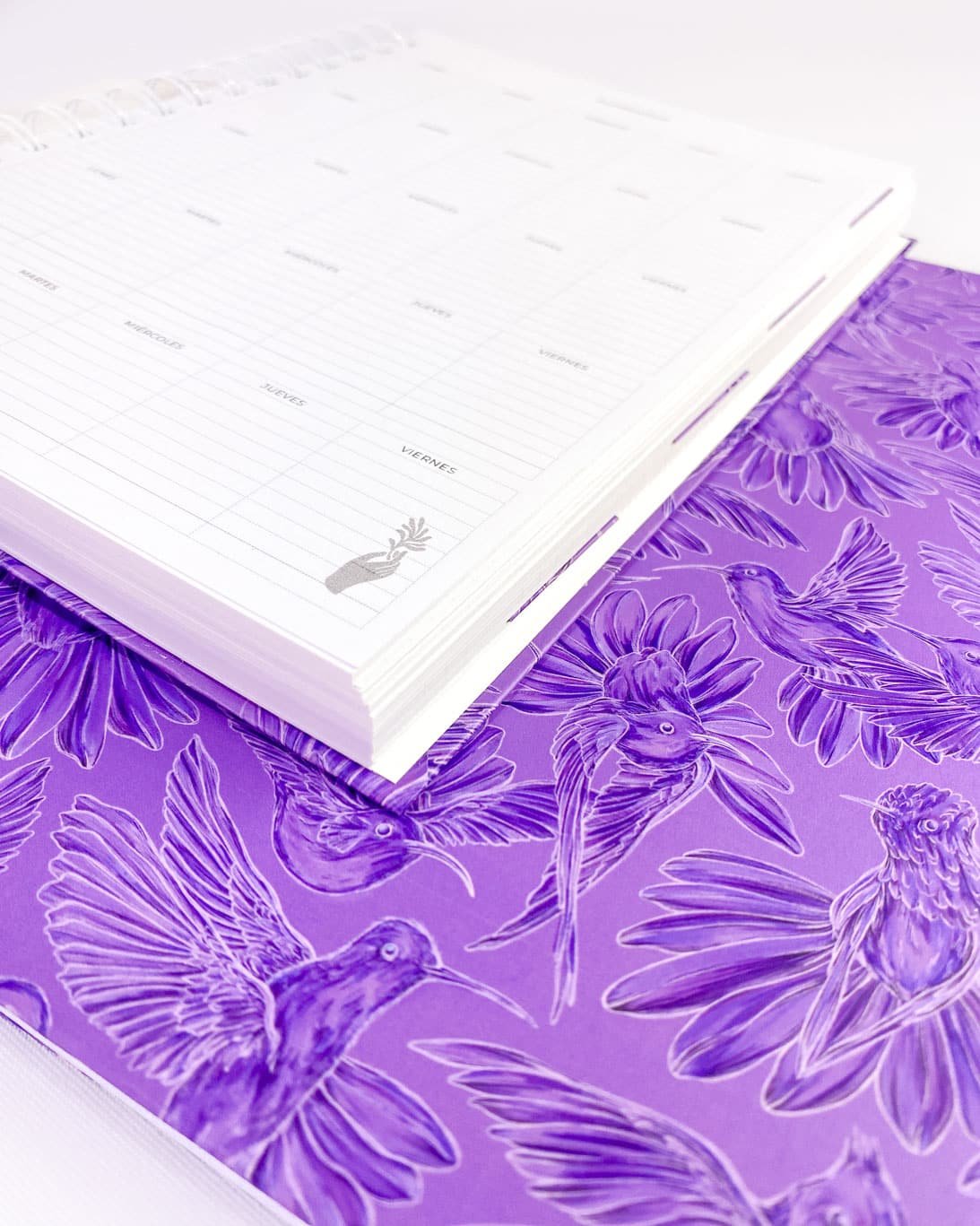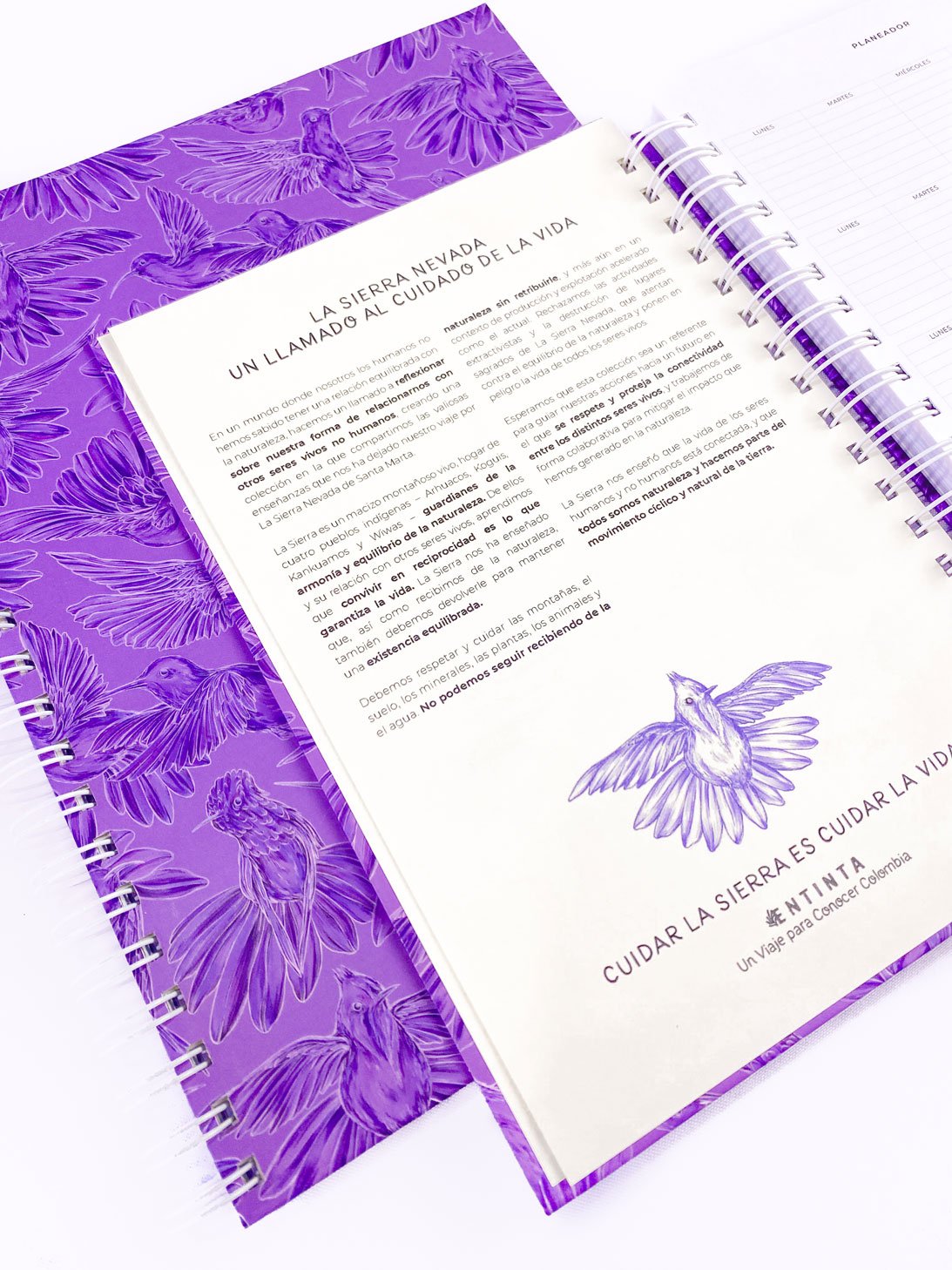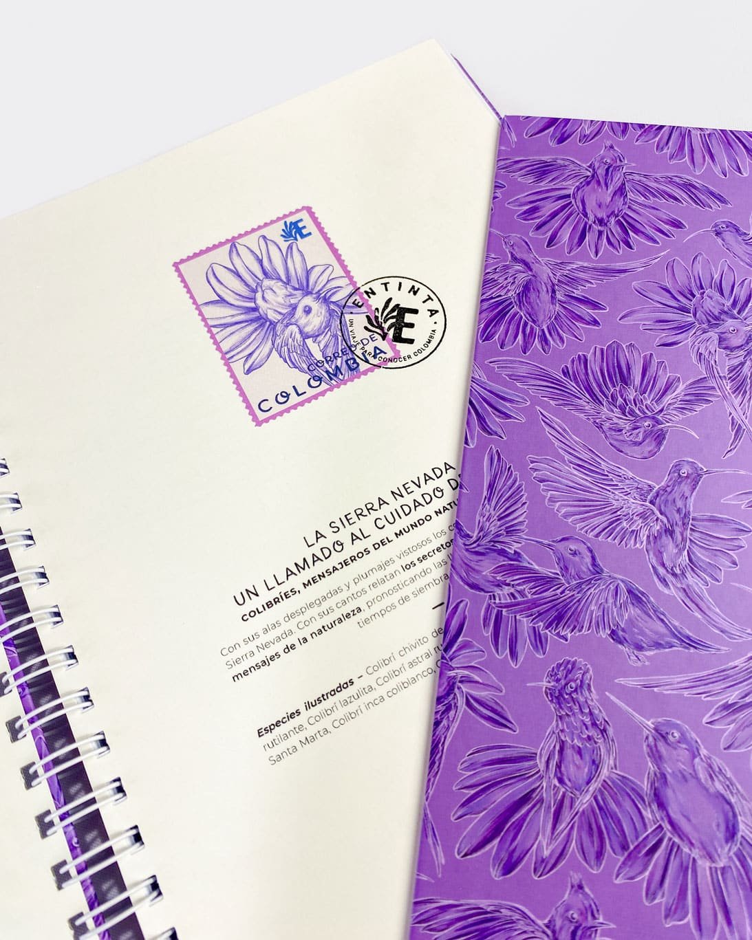 Cuaderno 4 materias de 160 hojas con nuestro estampado “Colibríes, mensajeros del mundo natural y espiritual – Con sus alas desplegadas y plumajes vistosos los colibríes vuelan y bailan por La Sierra Nevada. Con sus cantos relatan los secretos de la montaña y propagan los mensajes de la naturaleza, pronosticando las lluvias y sequías, y anunciando los tiempos de siembra y cosecha.”