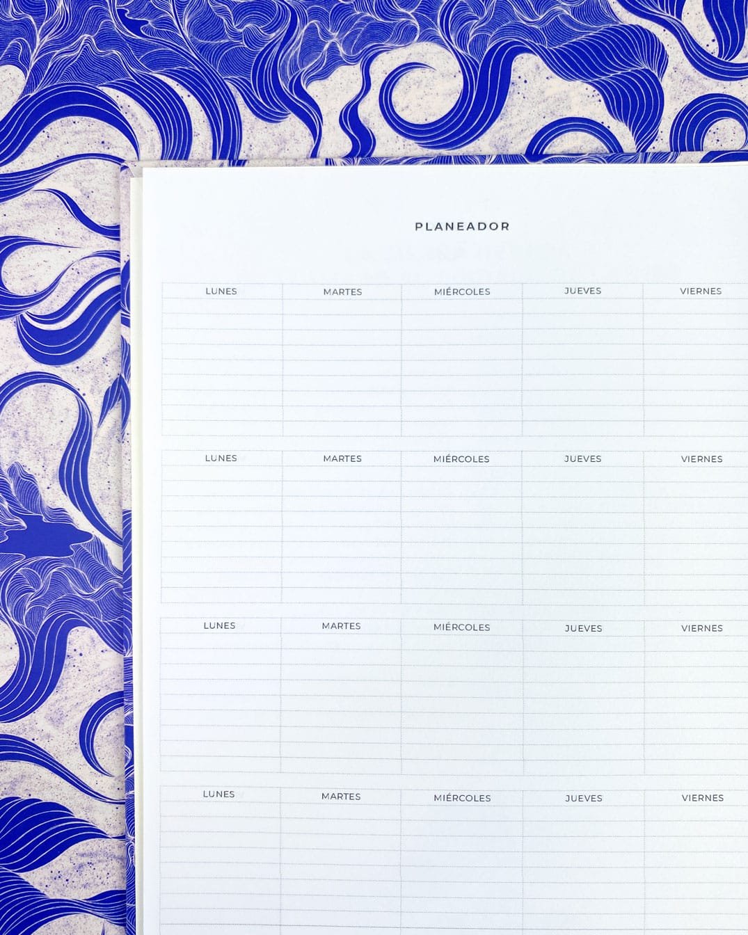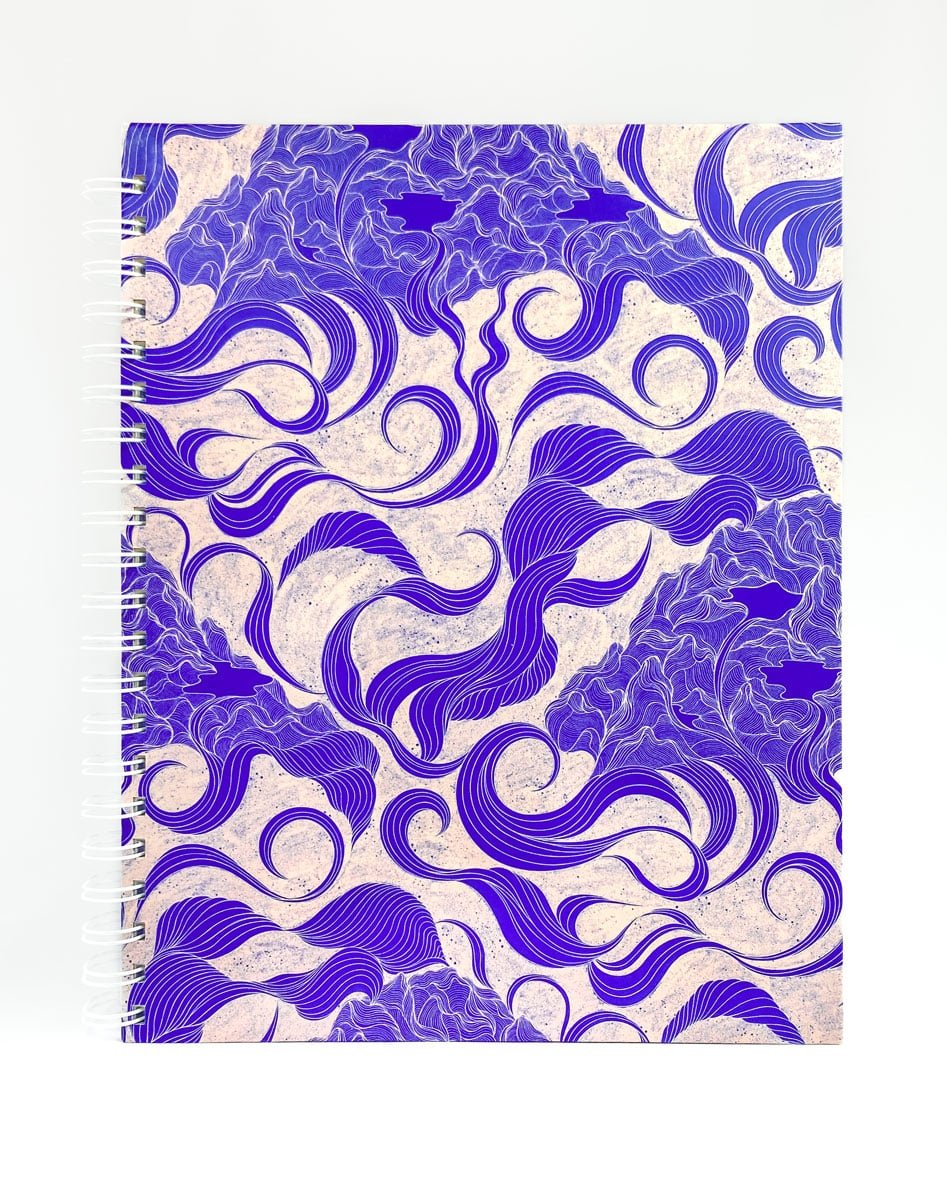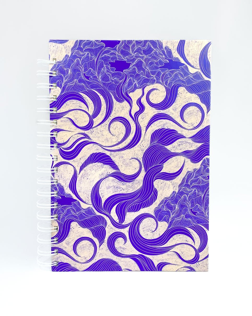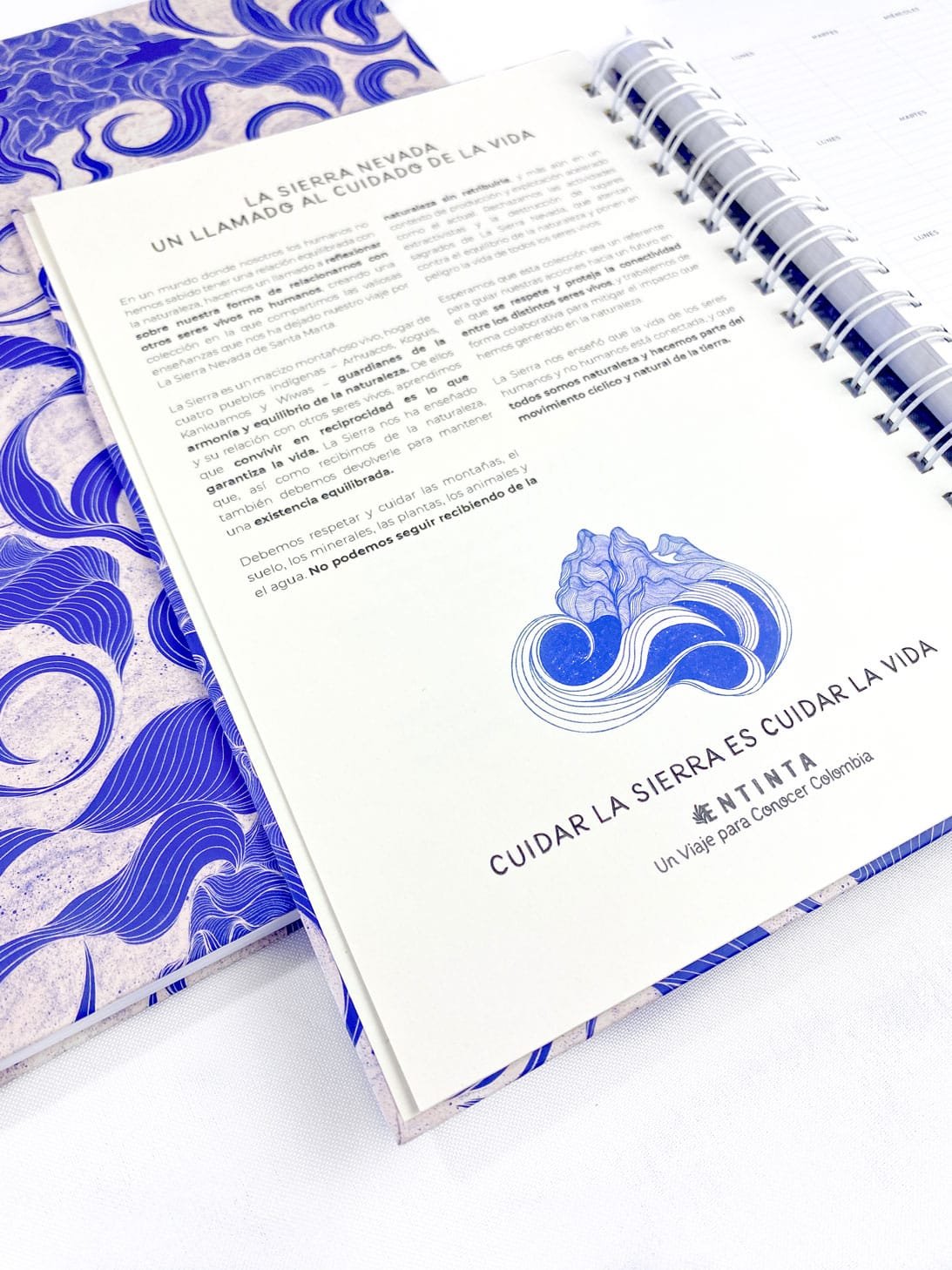 Cuaderno 4 materias de 160 hojas con nuestro estampado  El Fluir natural del Agua, movimiento cíclico y vital  El movimiento armónico y natural del agua, un ciclo que posibilita la vida de todo lo que está en la naturaleza. Fuerza vital y espiritual que fluye desde las lagunas y baja por los ríos para alimentar el mar, y se eleva de nuevo a la cima de La Sierra en forma de vapor y nubes, para cubrir de nuevo la montaña de nieve.”