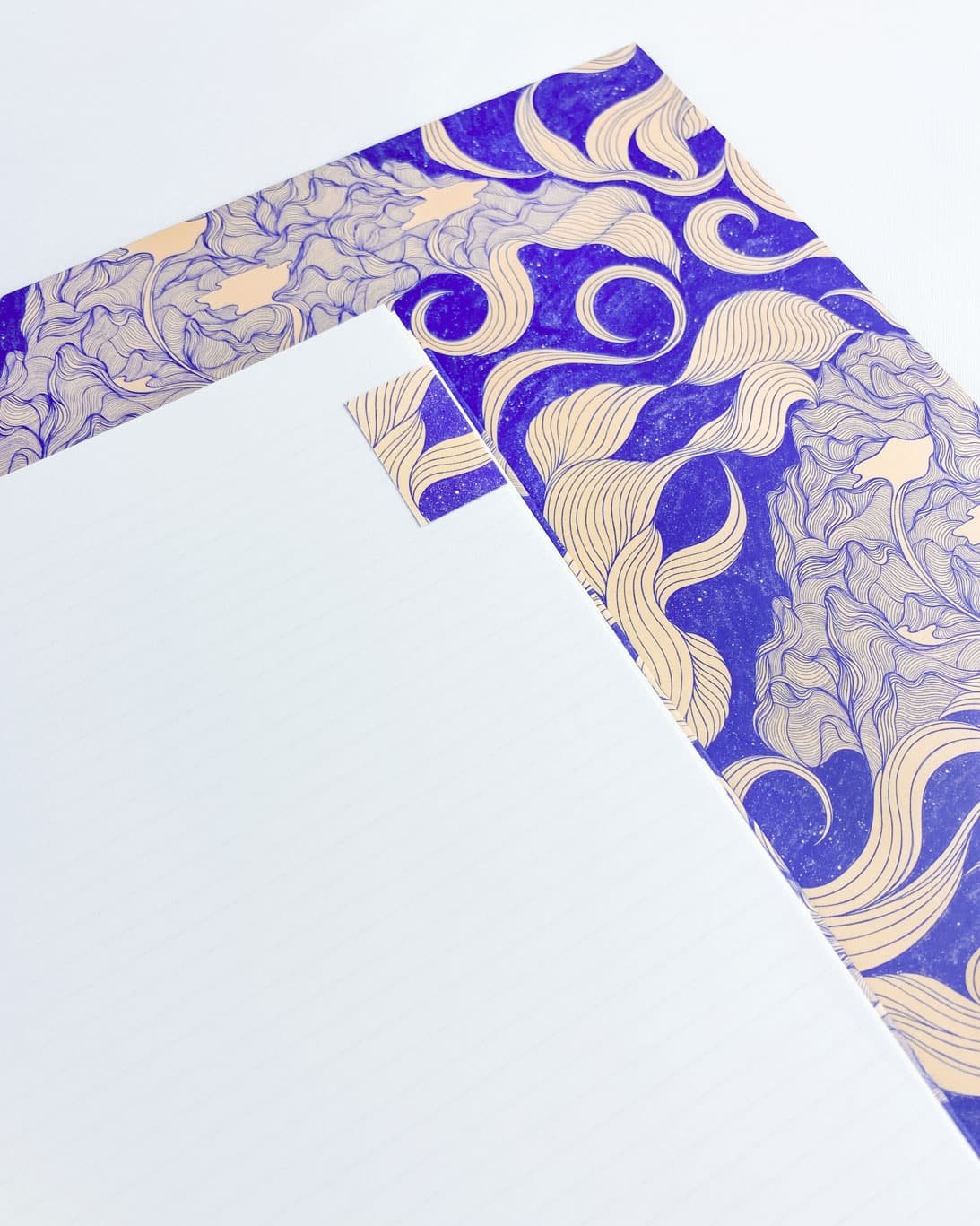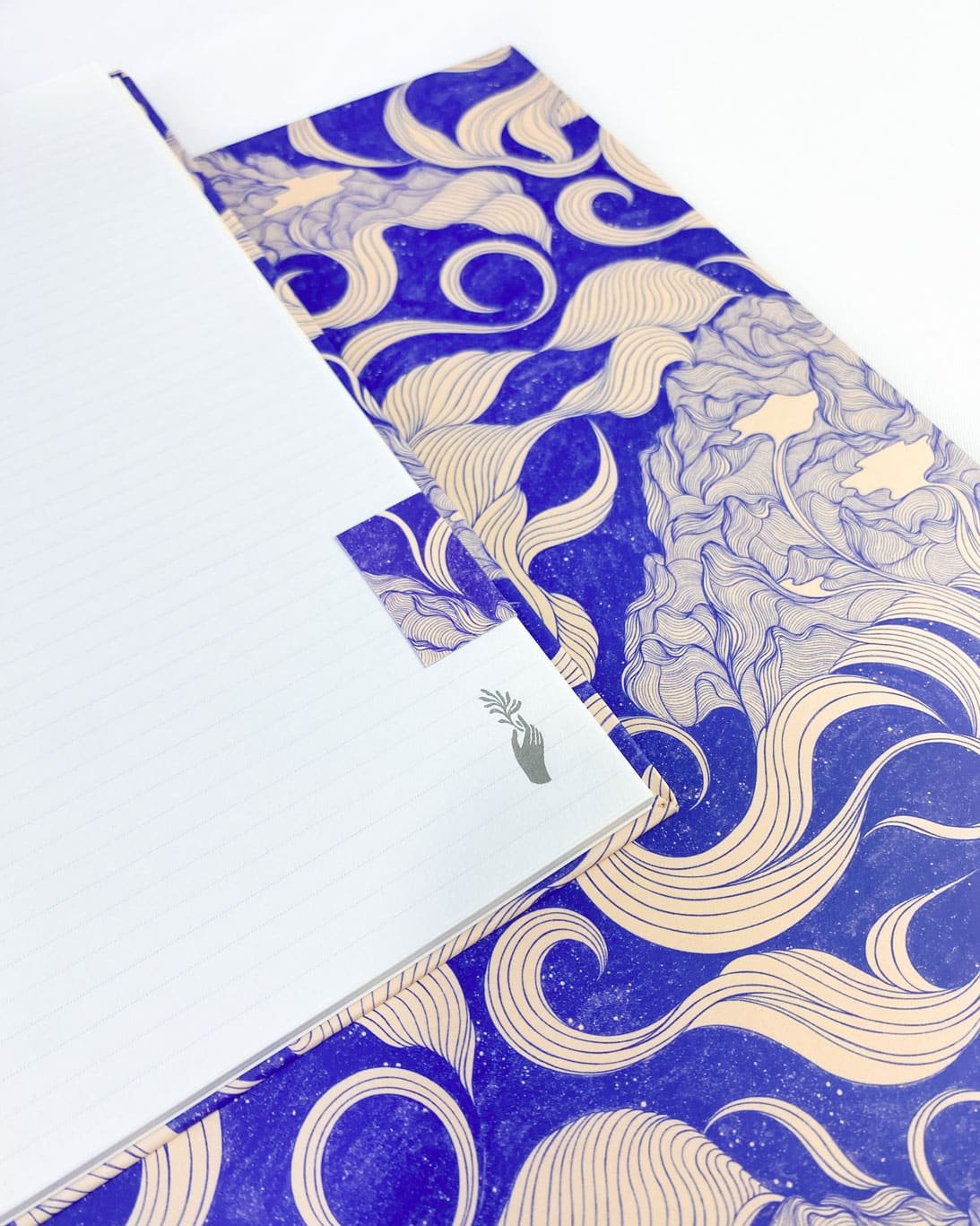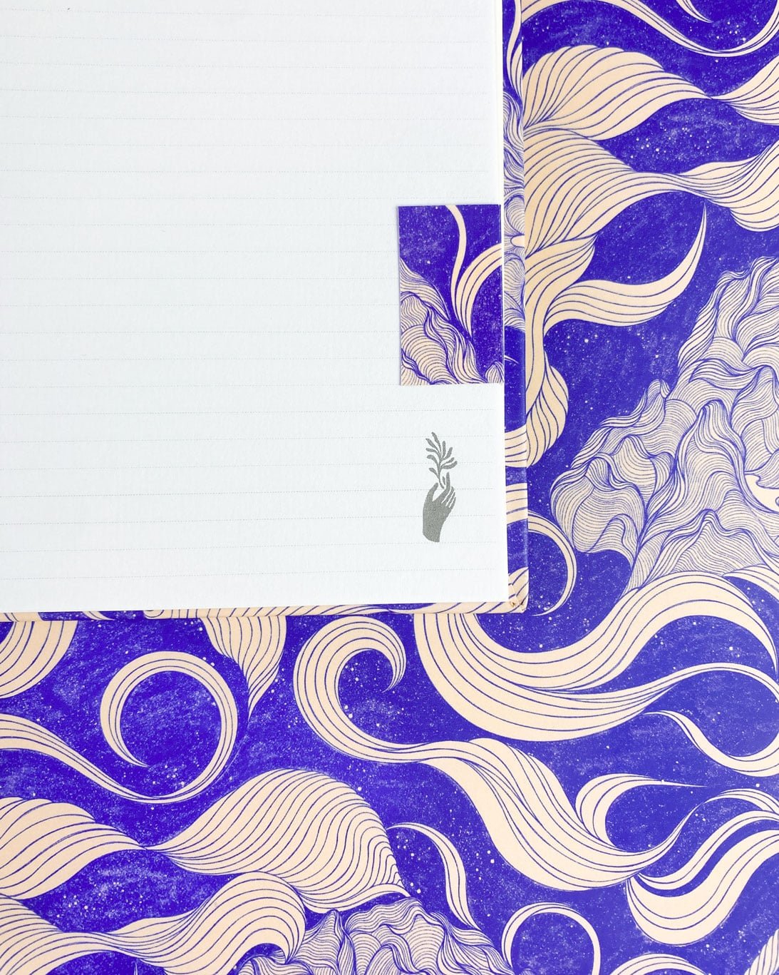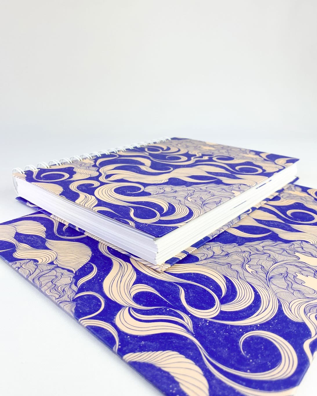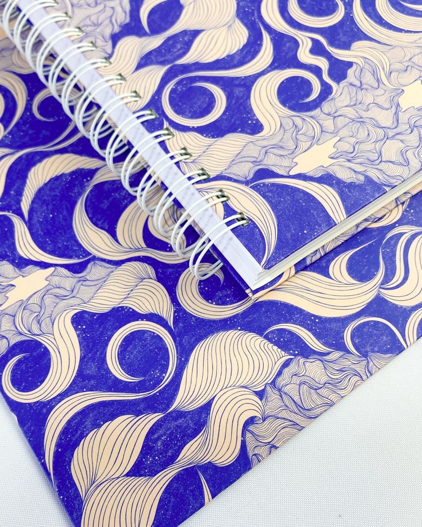 Cuaderno 4 materias de 160 hojas con nuestro estampado  El Fluir natural del Agua, movimiento cíclico y vital  El movimiento armónico y natural del agua, un ciclo que posibilita la vida de todo lo que está en la naturaleza. Fuerza vital y espiritual que fluye desde las lagunas y baja por los ríos para alimentar el mar, y se eleva de nuevo a la cima de La Sierra en forma de vapor y nubes, para cubrir de nuevo la montaña de nieve.”