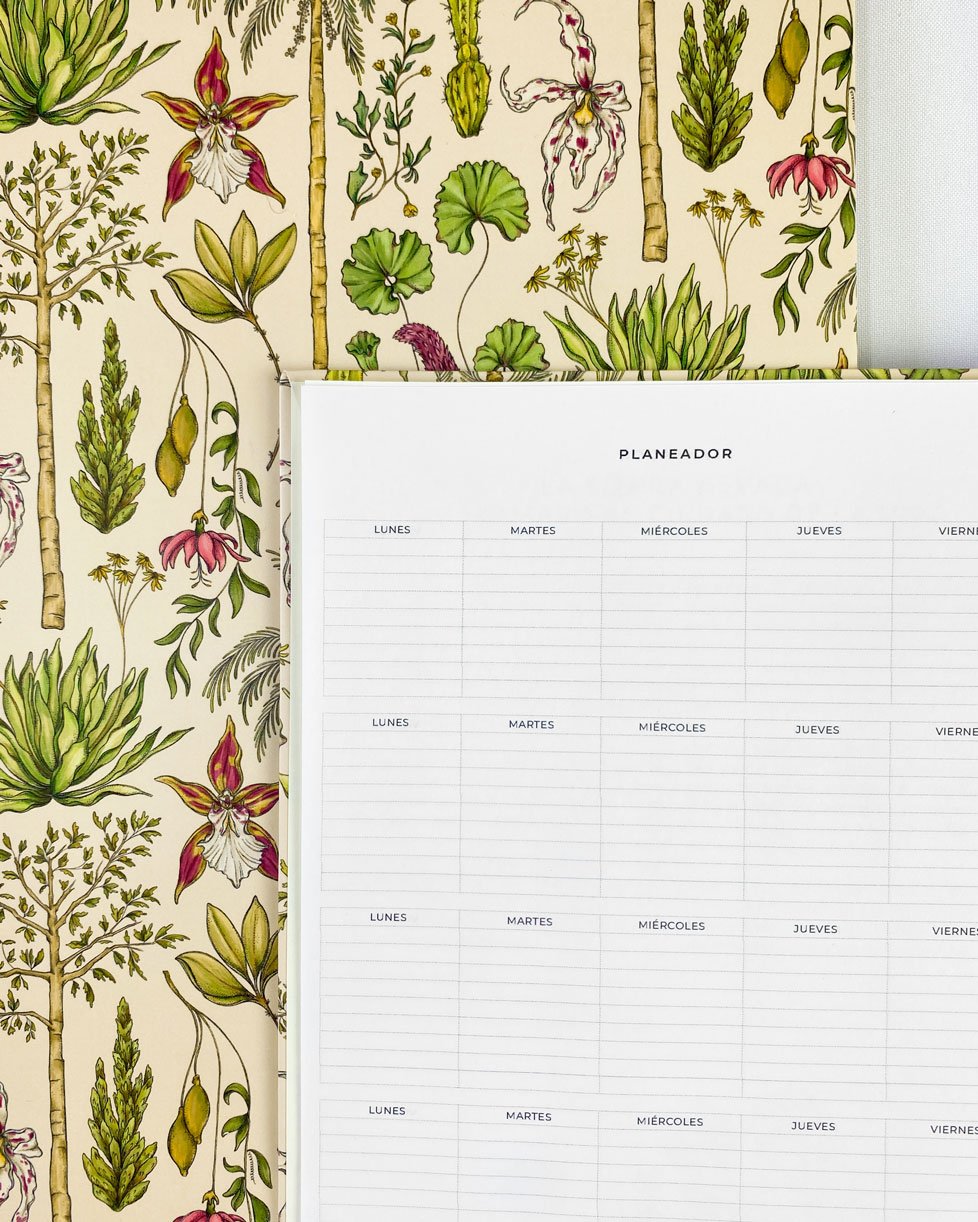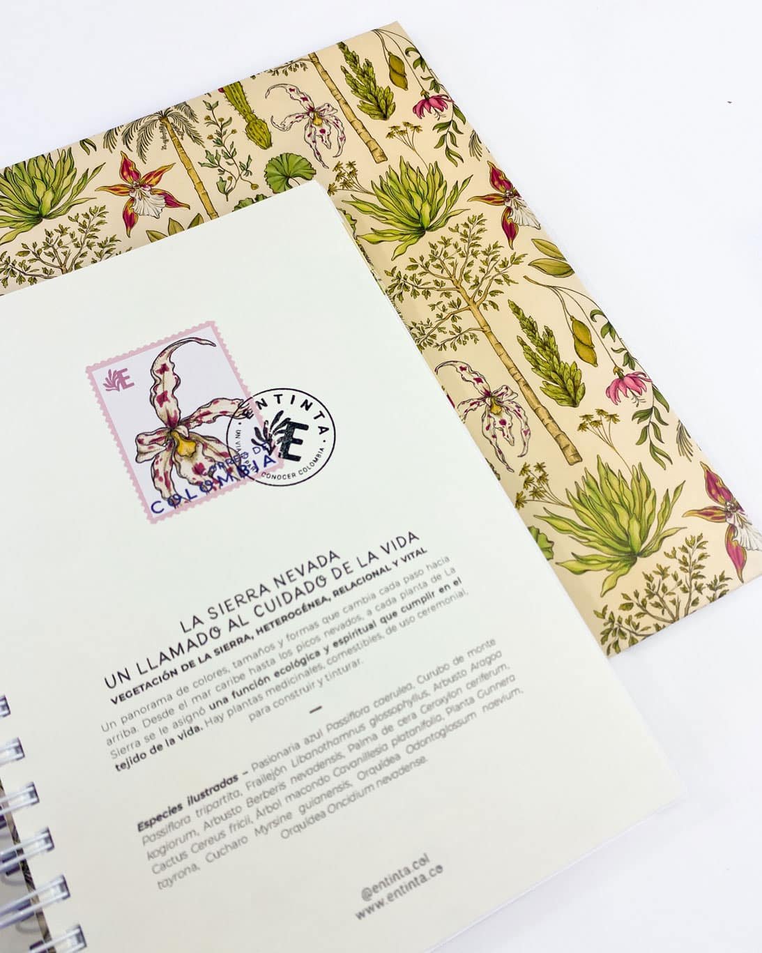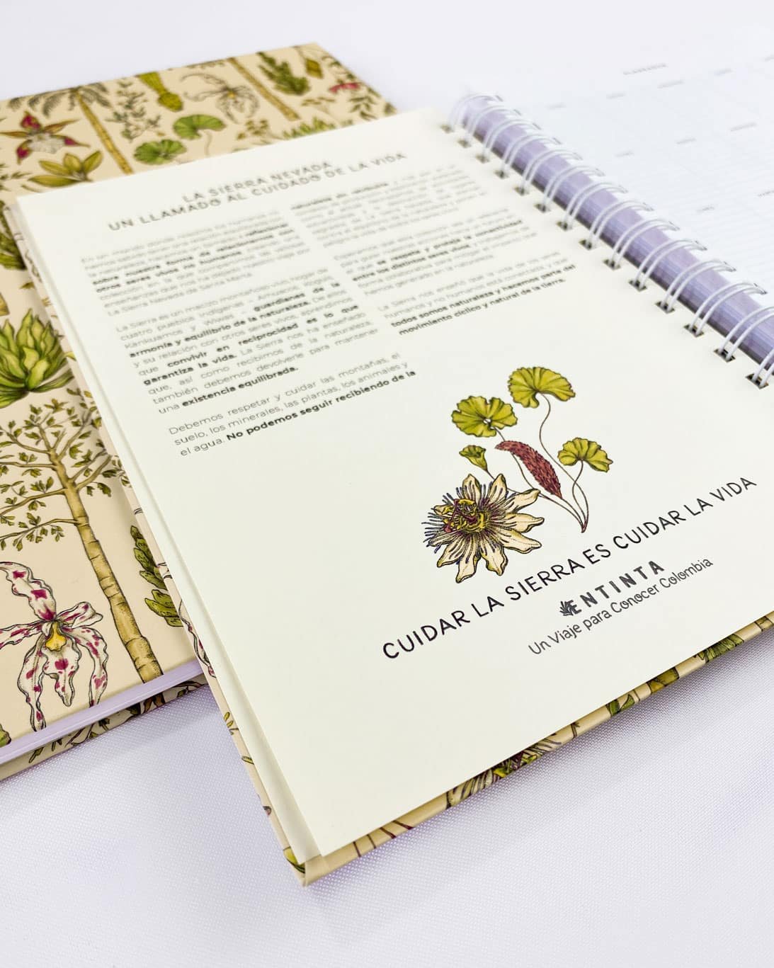 Cuaderno 4 materias de 160 hojas con nuestro estampado “Vegetación de La Sierra, heterogénea, relacional y vital – Un panorama de colores, tamaños y formas que cambia cada paso hacia arriba. Desde el mar caribe hasta los picos nevados, a cada planta de La Sierra se le asignó una función ecológica y espiritual que cumplir en el tejido de la vida. Hay plantas medicinales, comestibles, de uso ceremonial, para construir y tinturar.”.