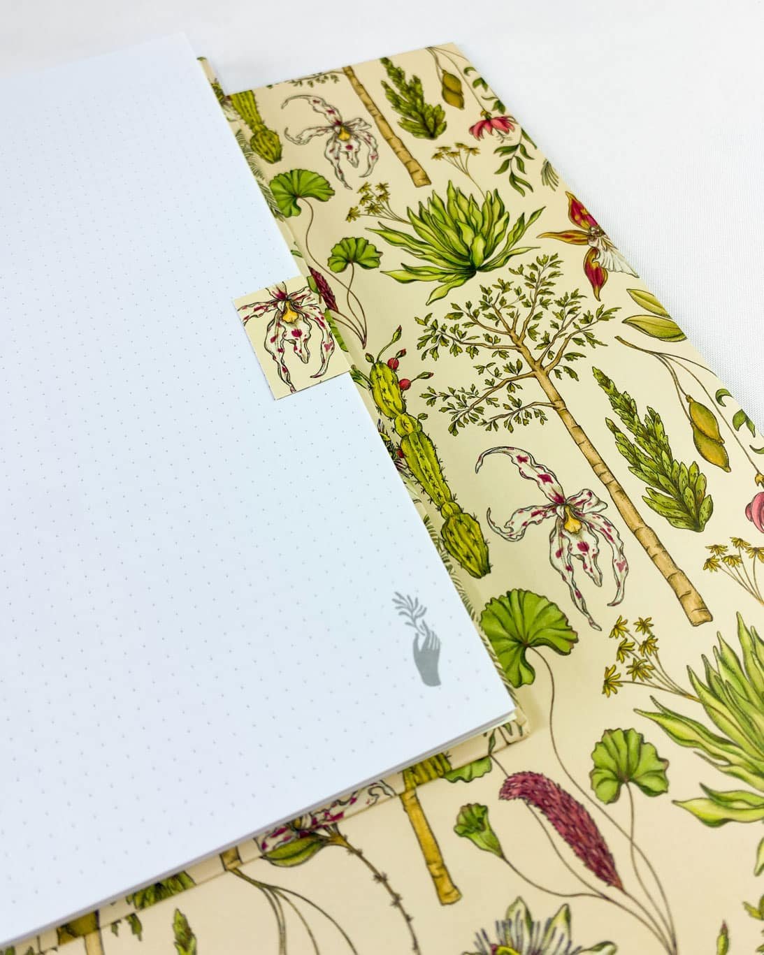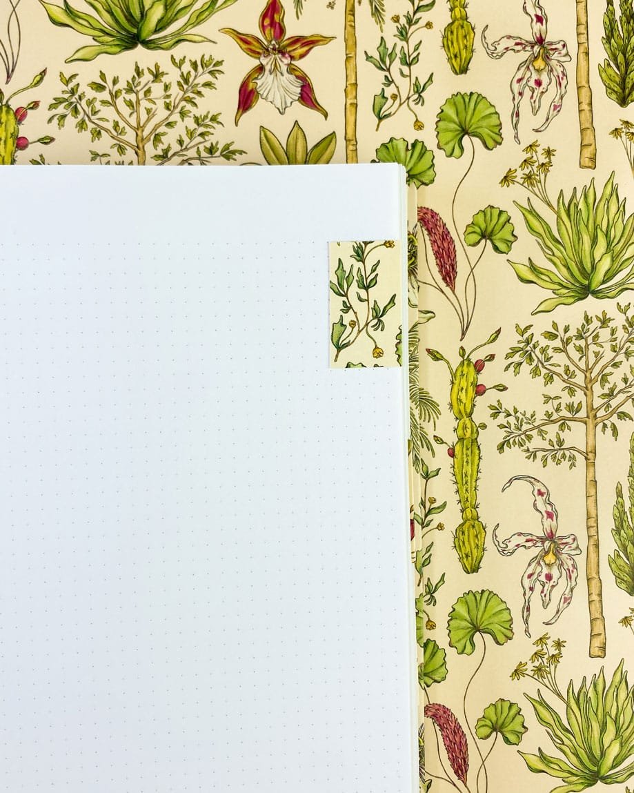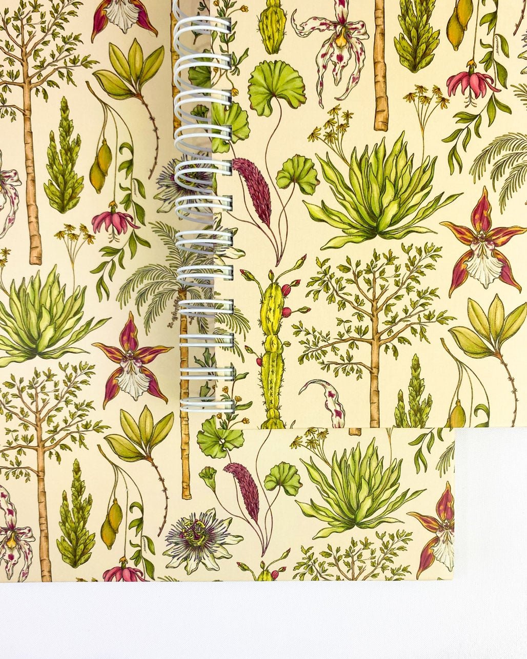 Cuaderno 4 materias de 160 hojas con nuestro estampado “Vegetación de La Sierra, heterogénea, relacional y vital – Un panorama de colores, tamaños y formas que cambia cada paso hacia arriba. Desde el mar caribe hasta los picos nevados, a cada planta de La Sierra se le asignó una función ecológica y espiritual que cumplir en el tejido de la vida. Hay plantas medicinales, comestibles, de uso ceremonial, para construir y tinturar.”.