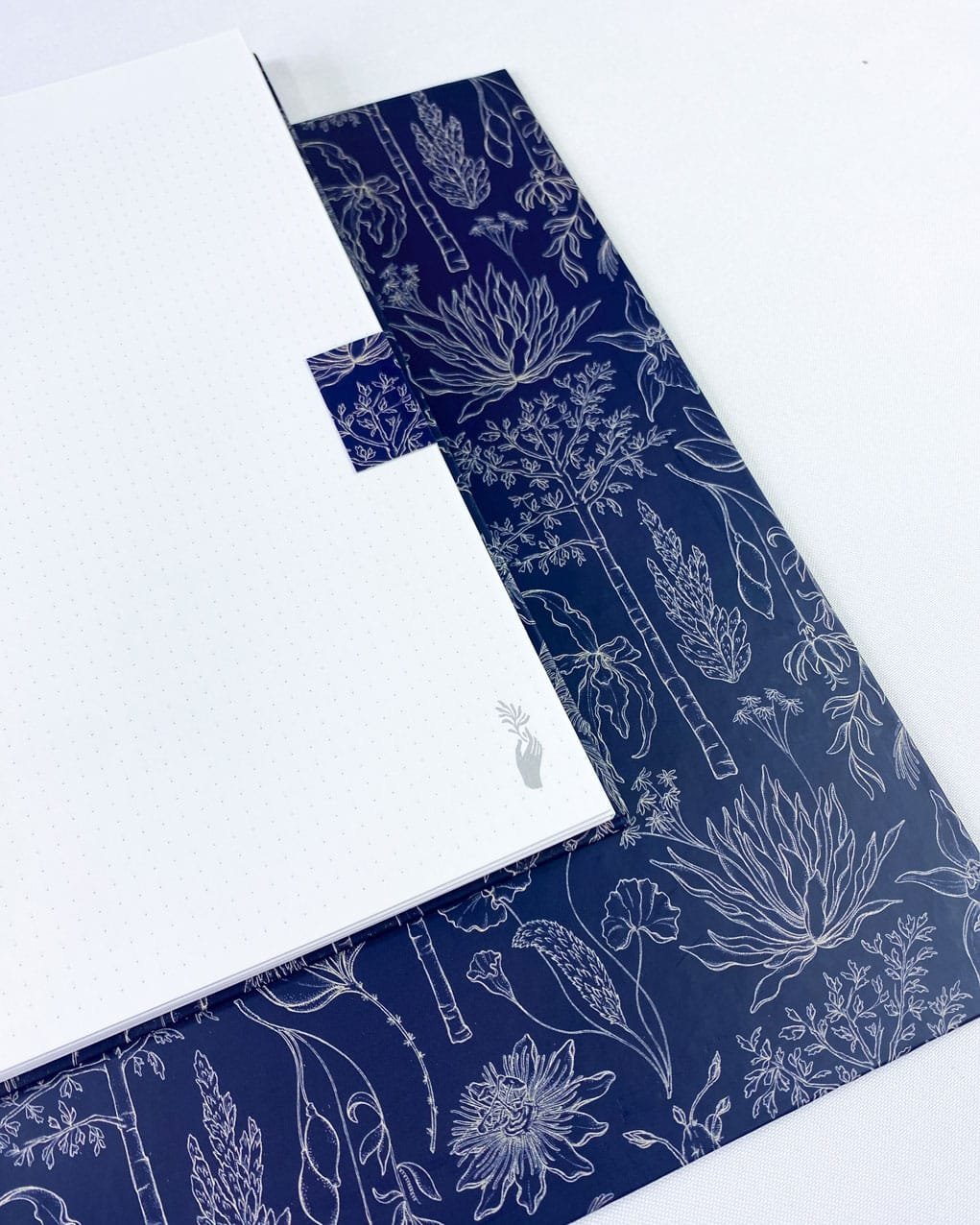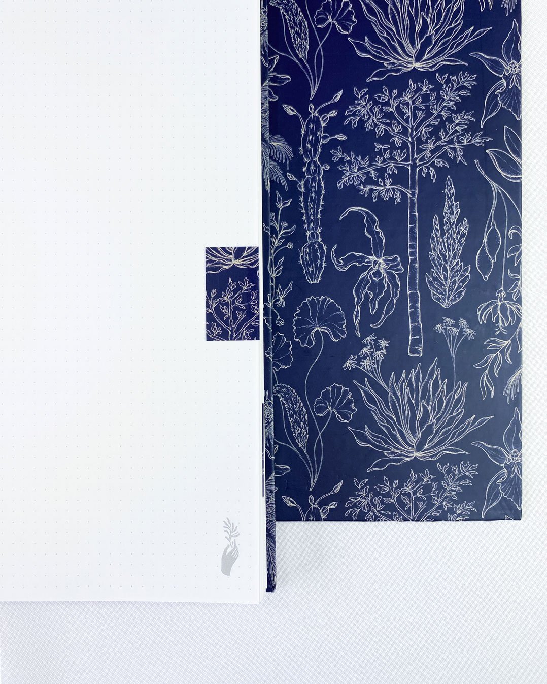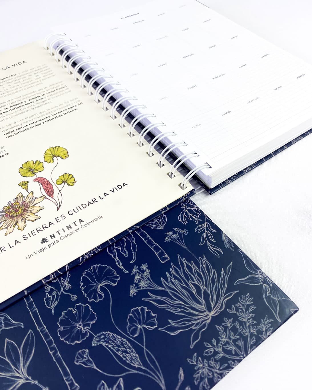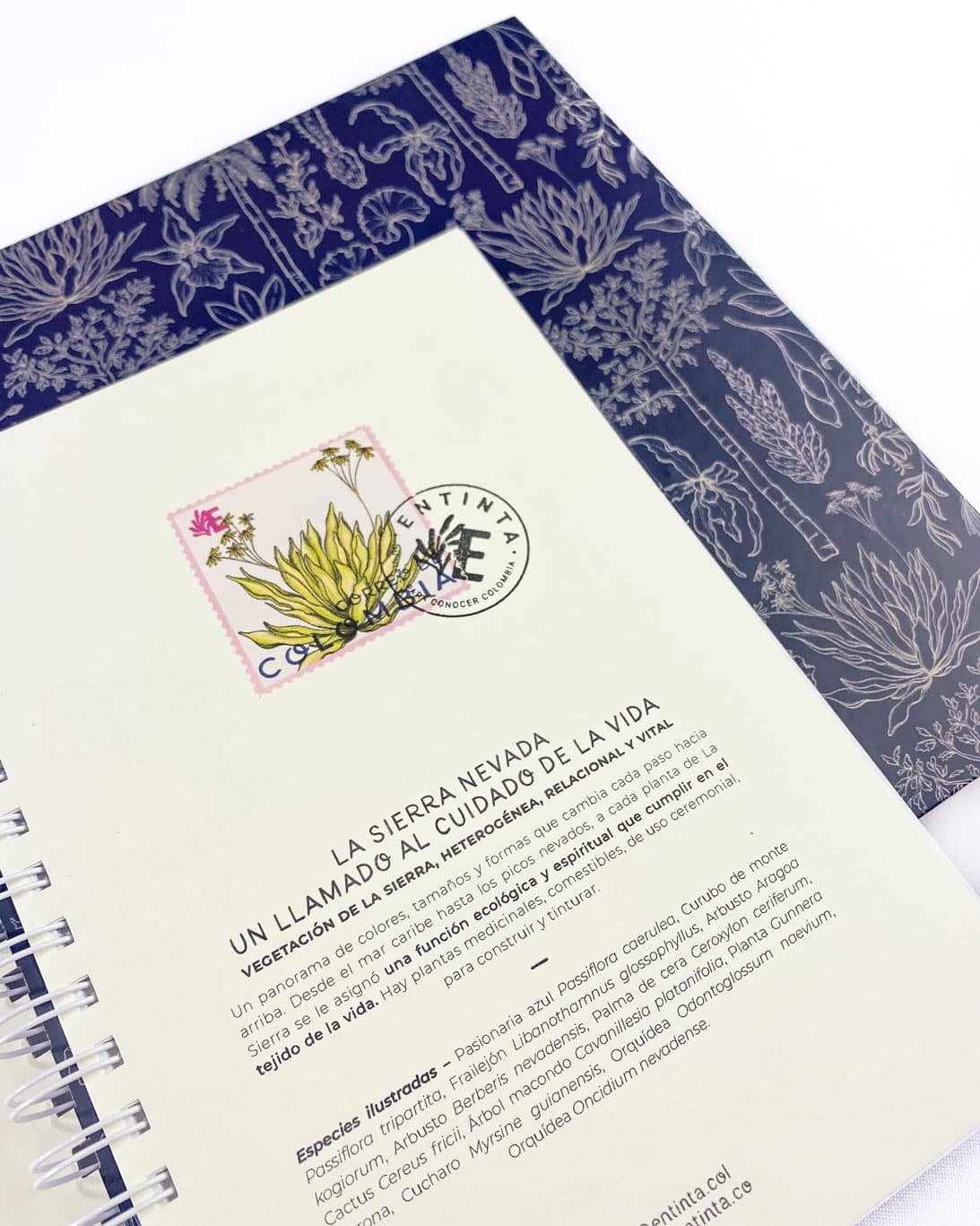 Cuaderno 4 materias de 160 hojas con nuestro estampado “Vegetación de La Sierra, heterogénea, relacional y vital – Un panorama de colores, tamaños y formas que cambia cada paso hacia arriba. Desde el mar caribe hasta los picos nevados, a cada planta de La Sierra se le asignó una función ecológica y espiritual que cumplir en el tejido de la vida. Hay plantas medicinales, comestibles, de uso ceremonial, para construir y tinturar.”.