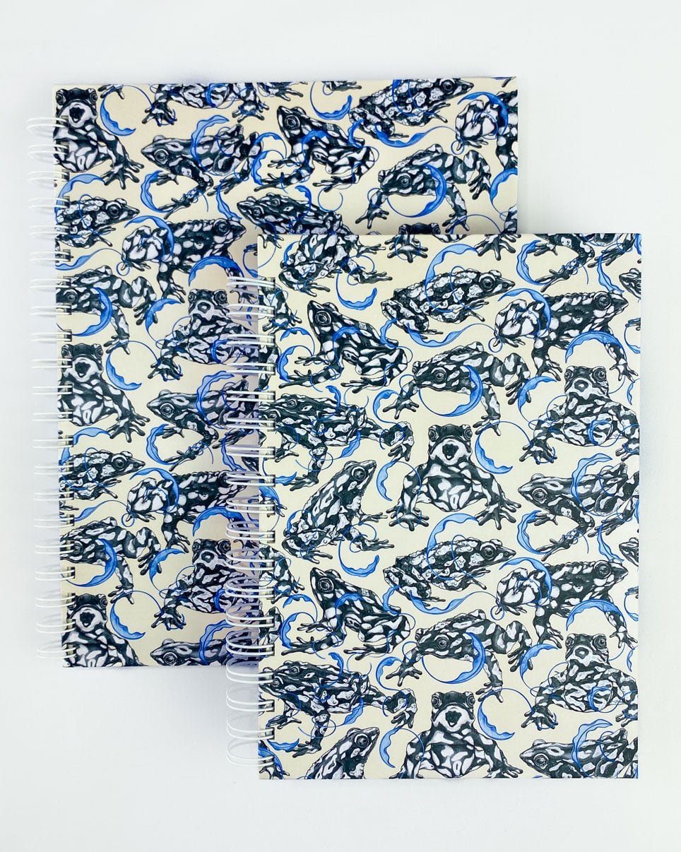 Cuaderno de 80 hojas con nuestro estampado “Arlequines de la Noche Estrellada, guardianas del Agua – Autoridades protectoras de La Sierra Nevada de Santa Marta, símbolo de fertilidad y salud del ecosistema. En coro le cantan a la madre agua y avisan que ya se puede sembrar el alimento..”.