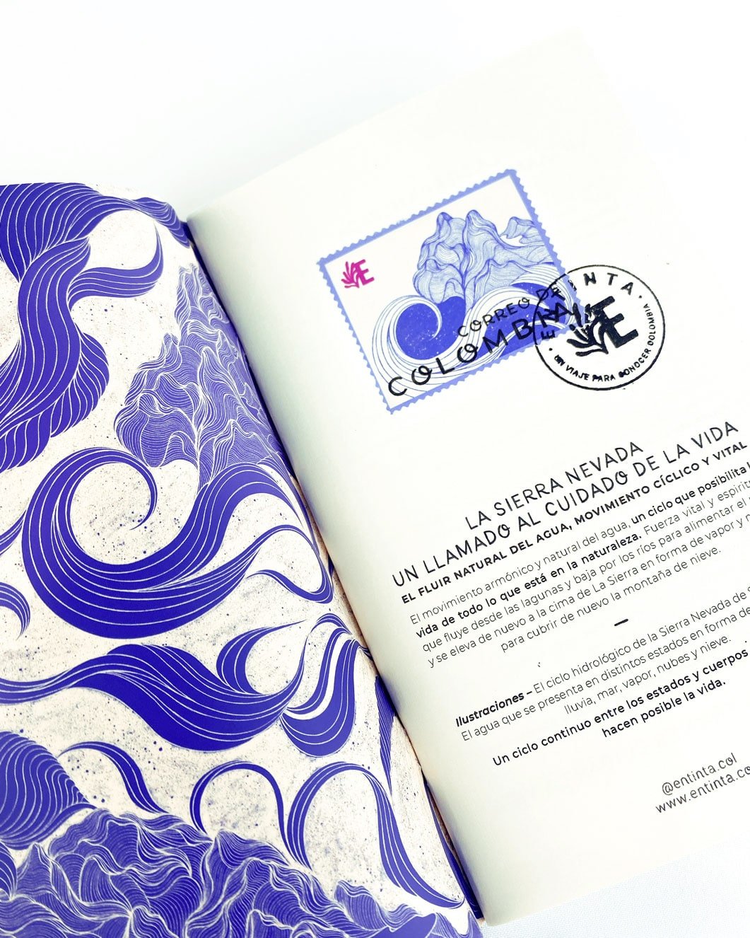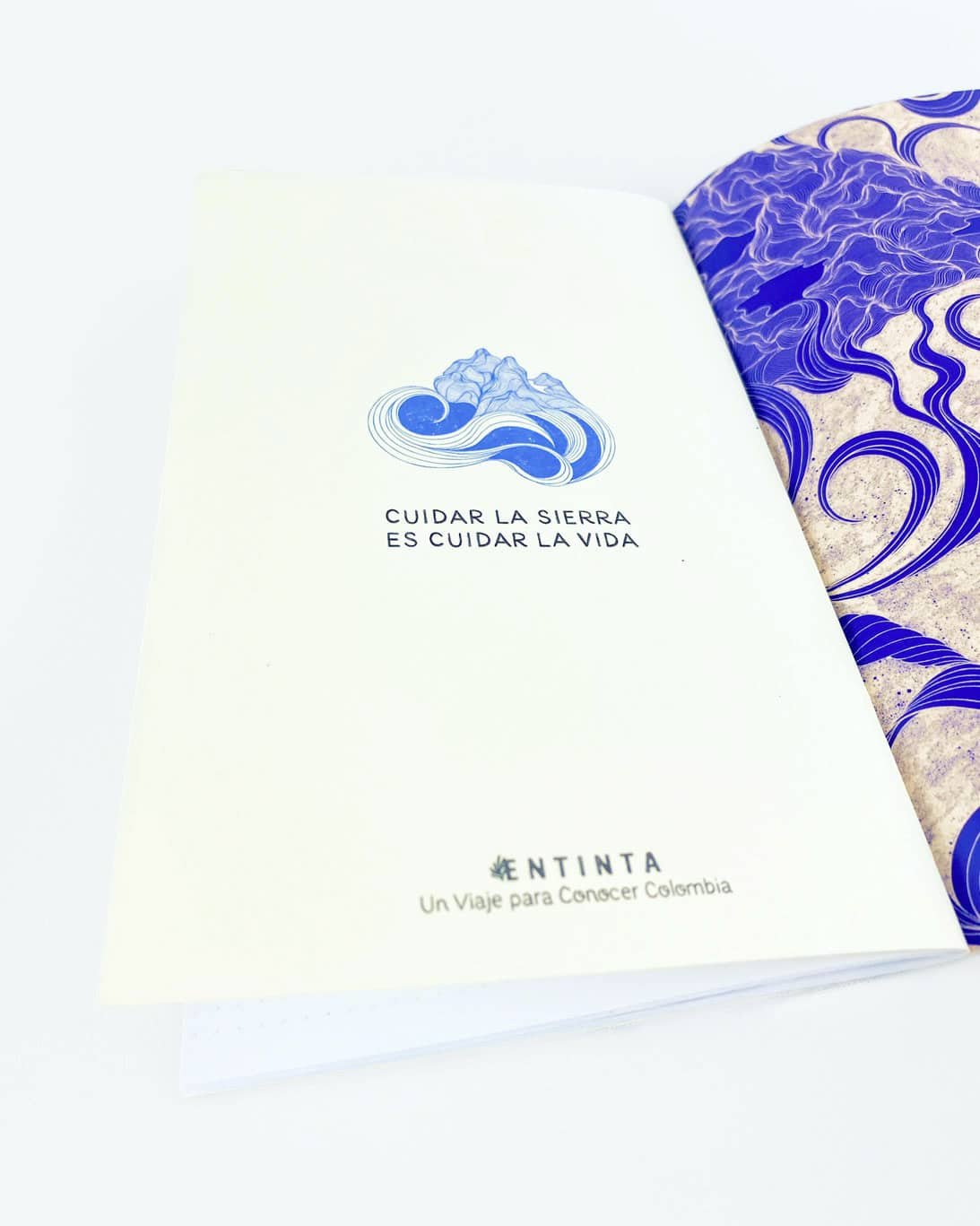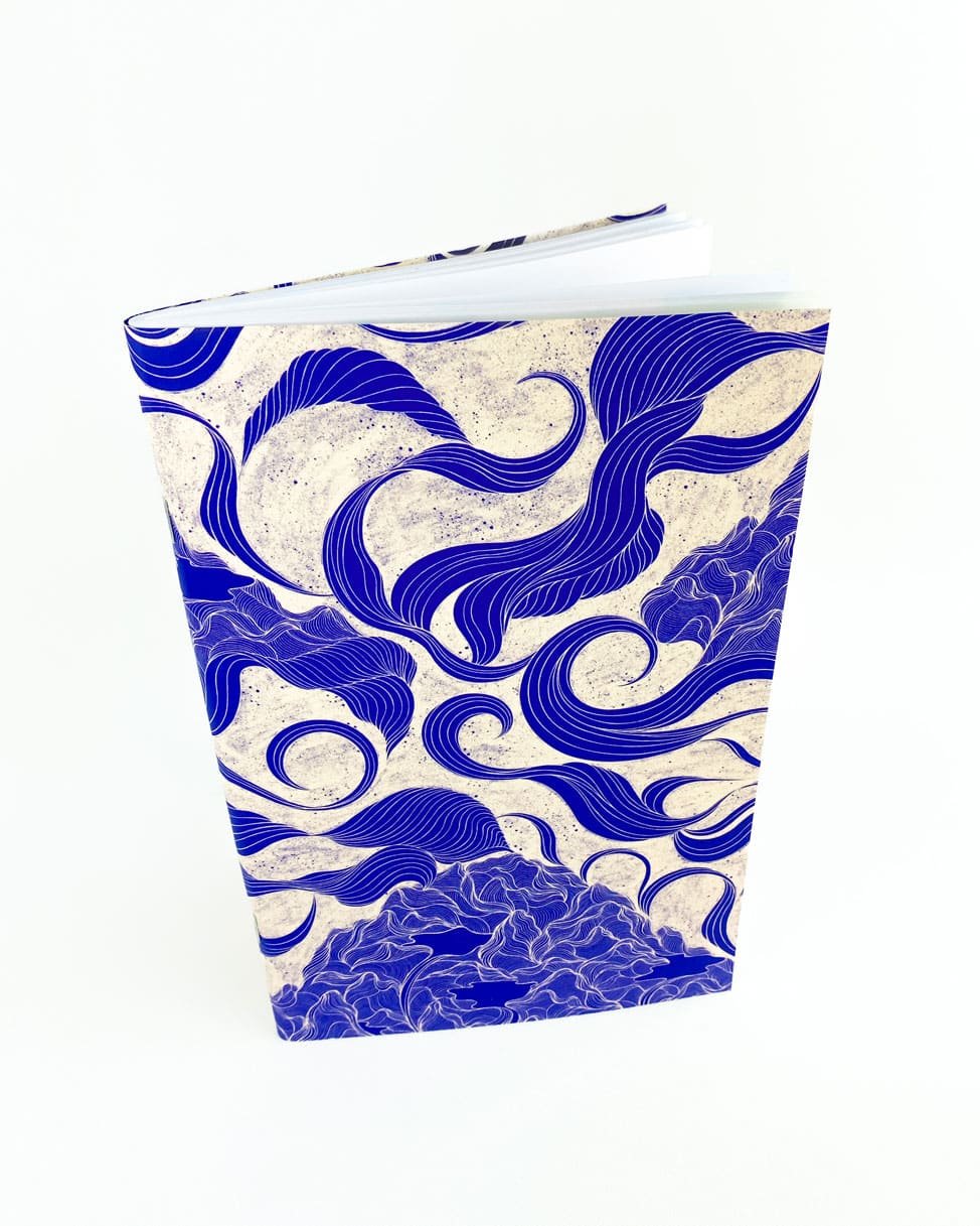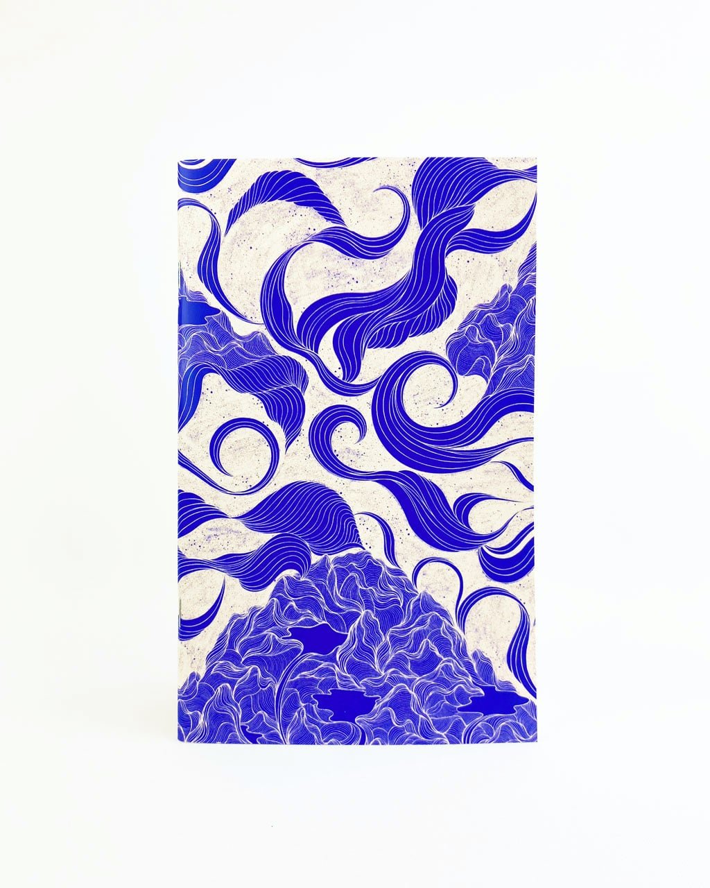 Cuaderno tamaño media carta con nuestro estampado  El Fluir natural del Agua, movimiento cíclico y vital  El movimiento armónico y natural del agua, un ciclo que posibilita la vida de todo lo que está en la naturaleza. Fuerza vital y espiritual que fluye desde las lagunas y baja por los ríos para alimentar el mar, y se eleva de nuevo a la cima de La Sierra en forma de vapor y nubes, para cubrir de nuevo la montaña de nieve.”