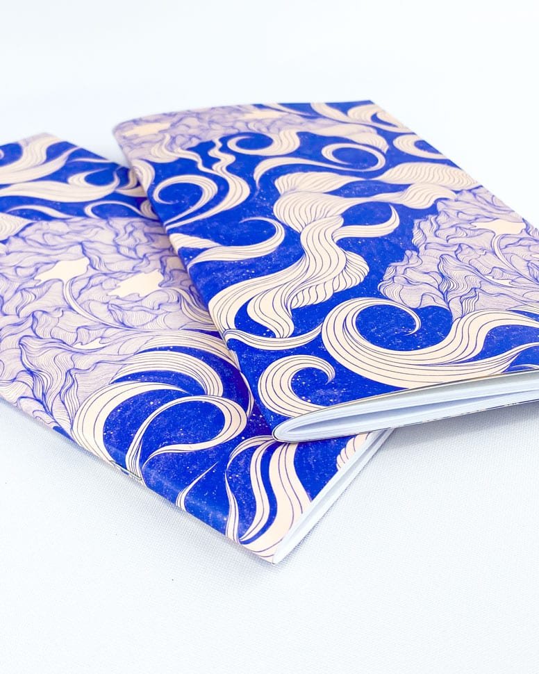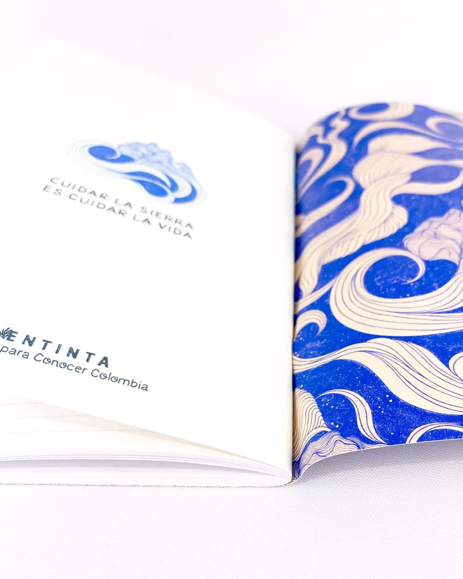 Cuaderno tamaño media carta con nuestro estampado  El Fluir natural del Agua, movimiento cíclico y vital  El movimiento armónico y natural del agua, un ciclo que posibilita la vida de todo lo que está en la naturaleza. Fuerza vital y espiritual que fluye desde las lagunas y baja por los ríos para alimentar el mar, y se eleva de nuevo a la cima de La Sierra en forma de vapor y nubes, para cubrir de nuevo la montaña de nieve.”