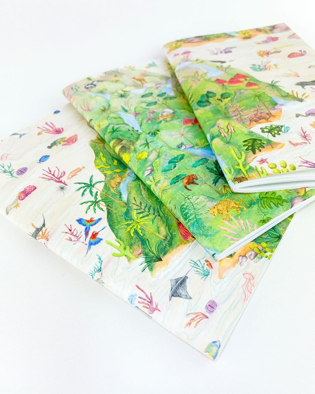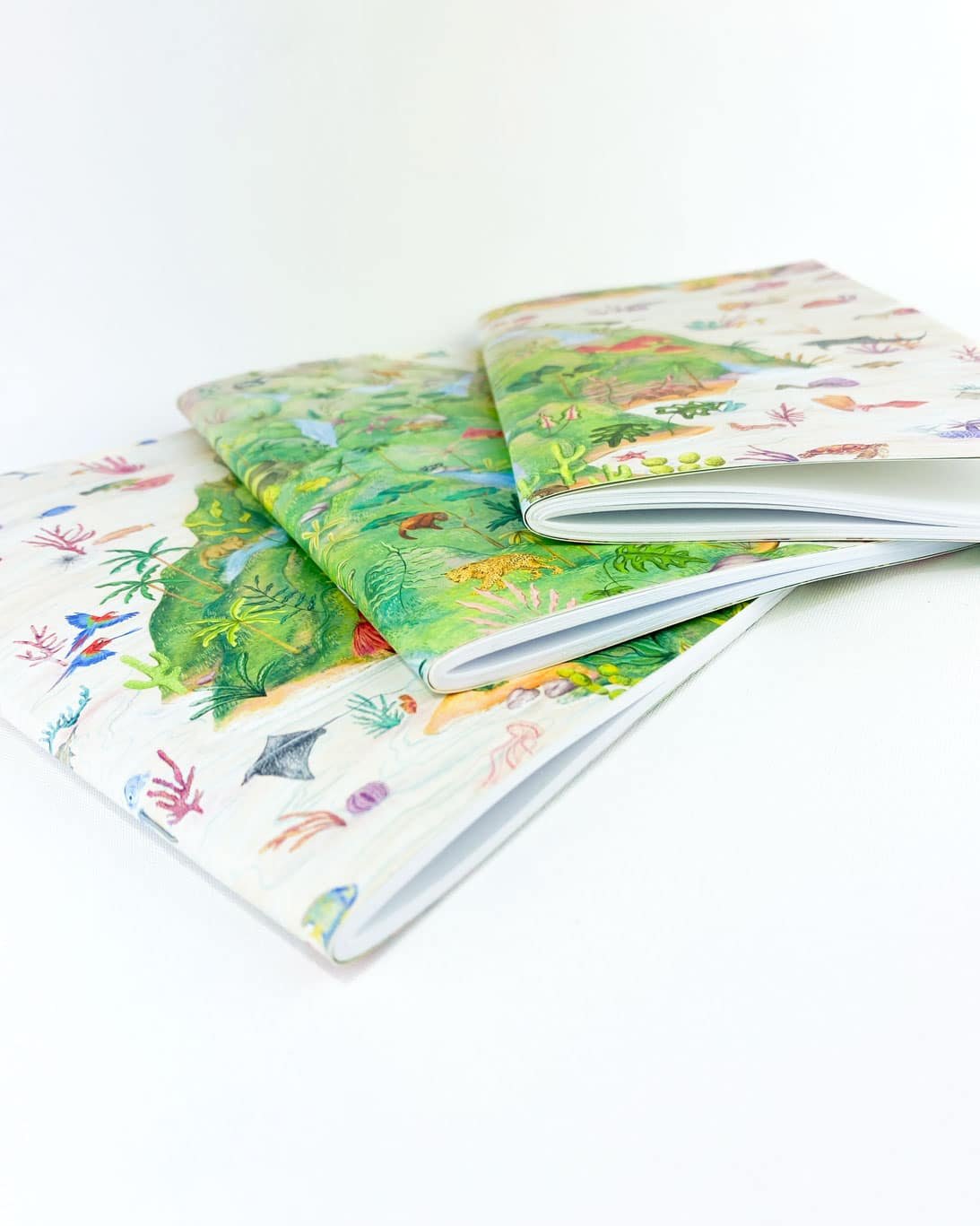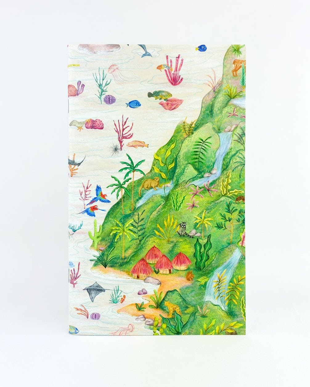 Cuaderno tamaño media carta con nuestro estampado  La Sierra Nevada, un ecosistema de vidas en conexión – De agudas pendientes y abarcando todos los pisos térmicos, La Sierra es un espacio de intercambio de vitalidad. Un escenario natural único que nos pone en manifiesto que el convivir en reciprocidad es lo que garantiza la vida.”
