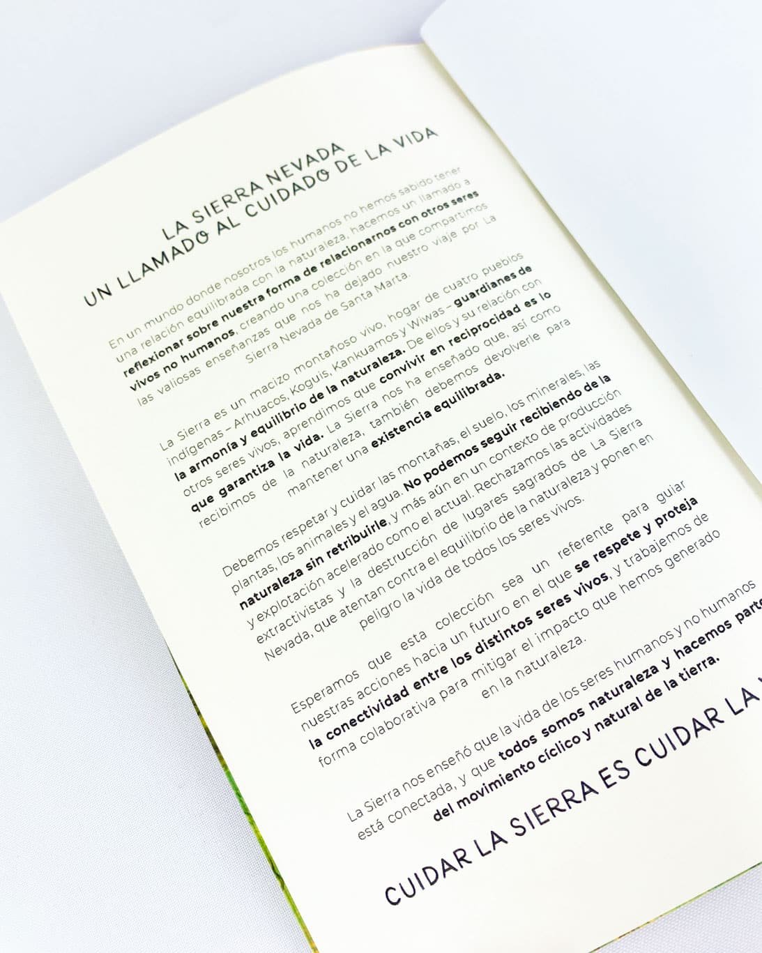 Un diseño inspirado en nuestro viaje a Ciudad Perdida en el departamento de Magdalena para la colección La Sierra Nevada, un llamado al cuidado de la Vida.