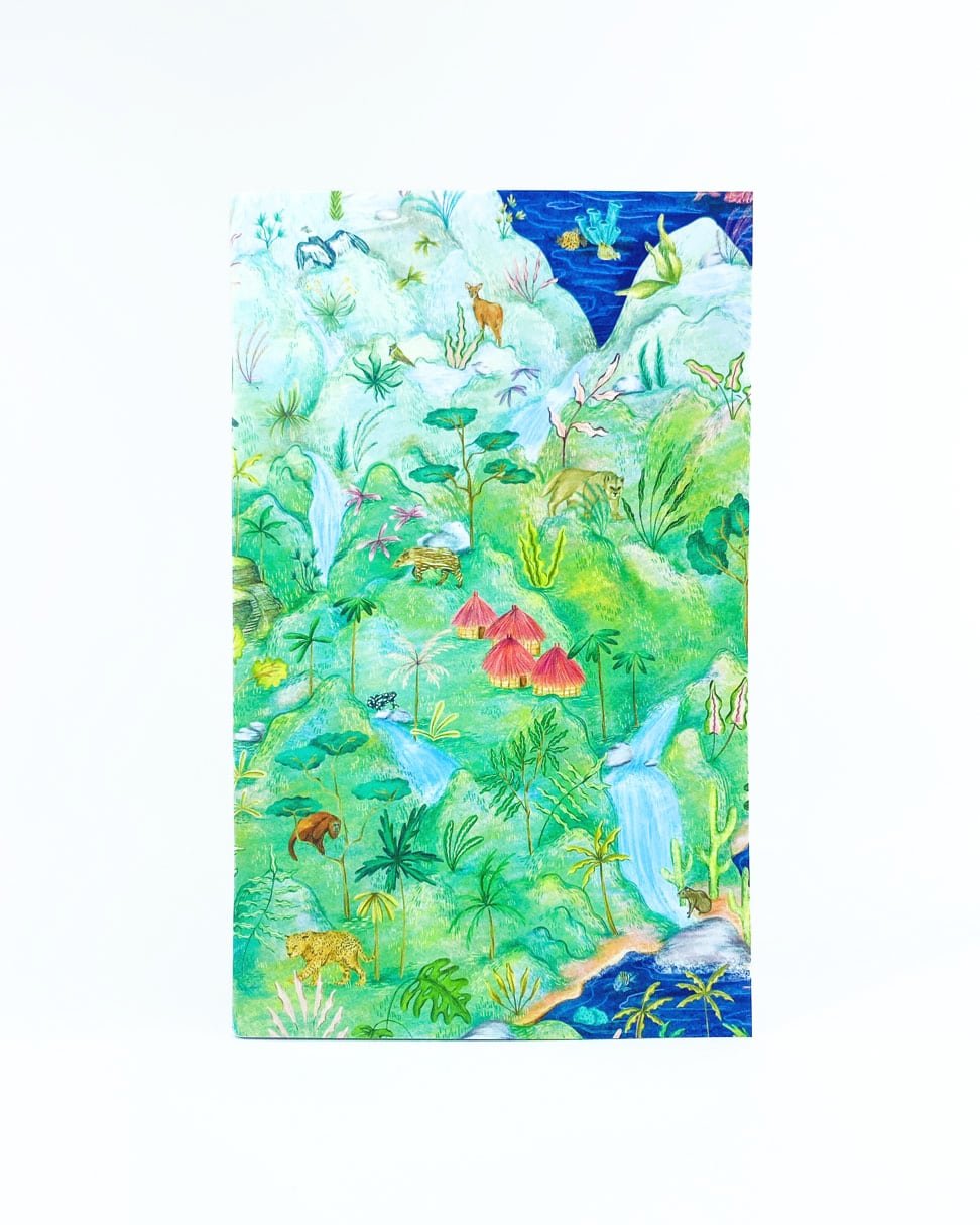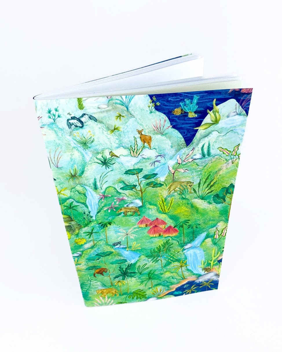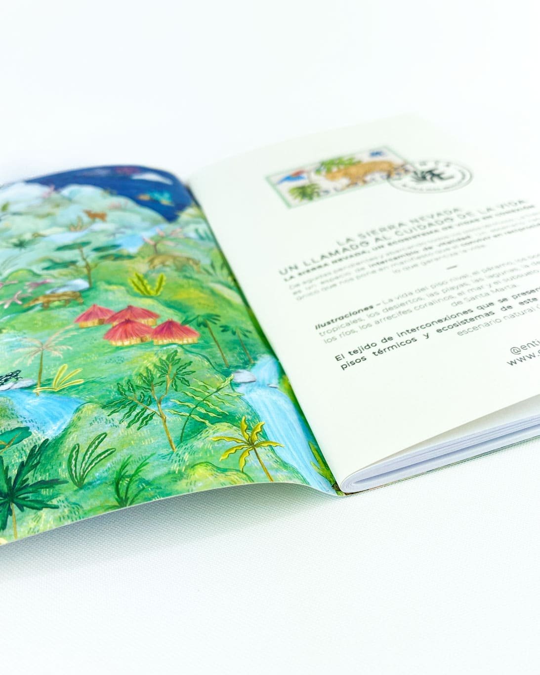 Cuaderno tamaño media carta con nuestro estampado  La Sierra Nevada, un ecosistema de vidas en conexión – De agudas pendientes y abarcando todos los pisos térmicos, La Sierra es un espacio de intercambio de vitalidad. Un escenario natural único que nos pone en manifiesto que el convivir en reciprocidad es lo que garantiza la vida.”