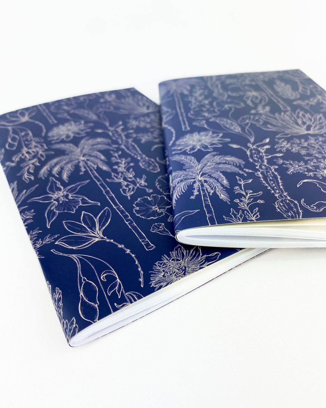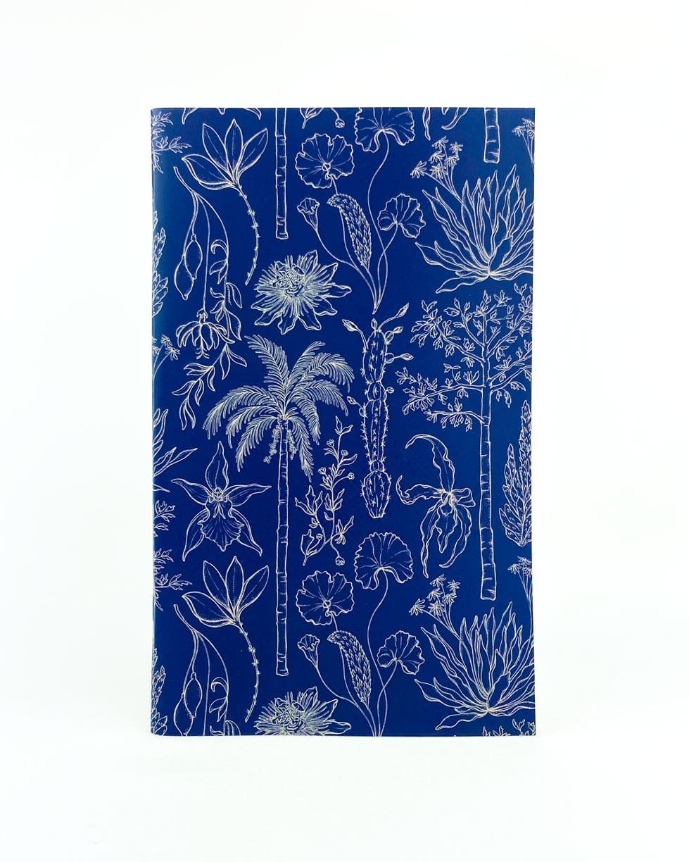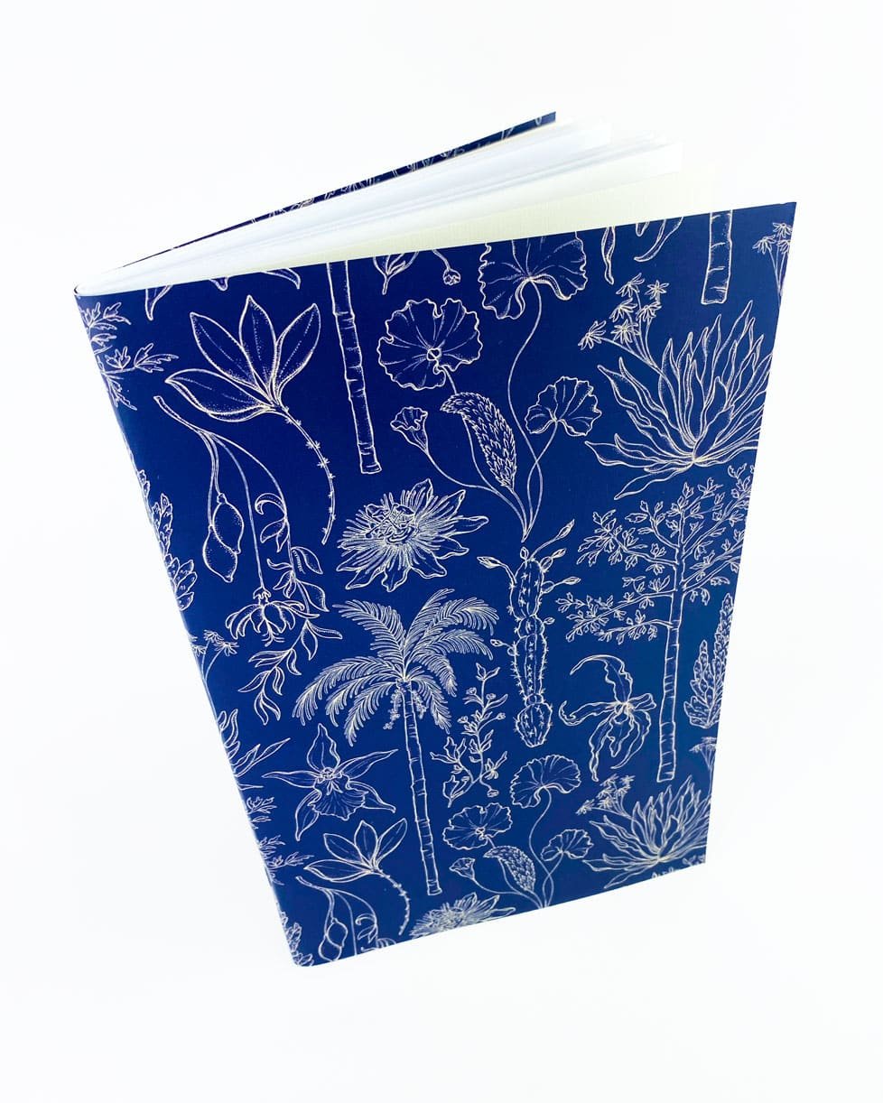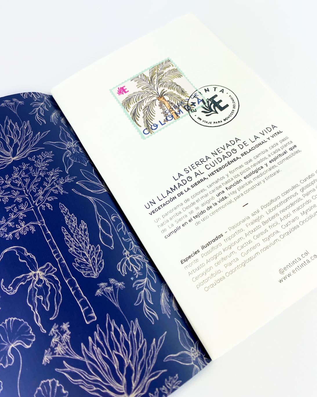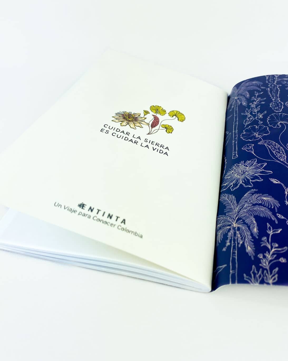 Cuaderno tamaño media carta con nuestro estampado “Vegetación de La Sierra, heterogénea, relacional y vital – Un panorama de colores, tamaños y formas que cambia cada paso hacia arriba. Desde el mar caribe hasta los picos nevados, a cada planta de La Sierra se le asignó una función ecológica y espiritual que cumplir en el tejido de la vida. Hay plantas medicinales, comestibles, de uso ceremonial, para construir y tinturar.”.