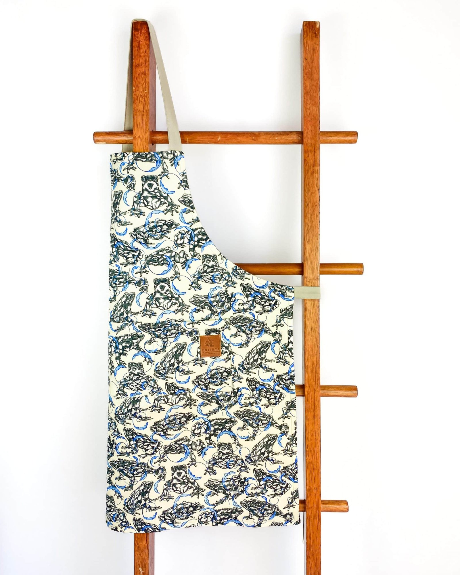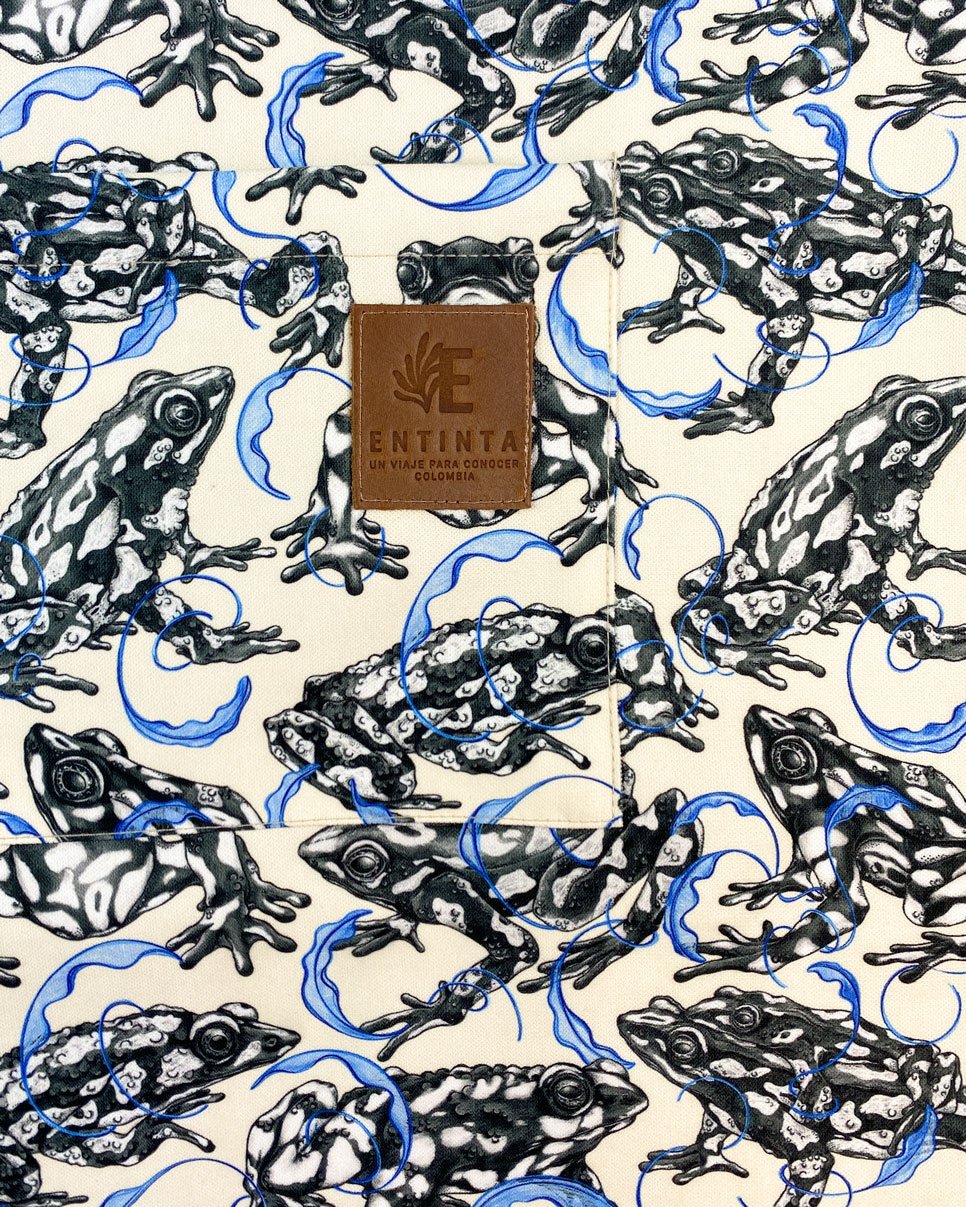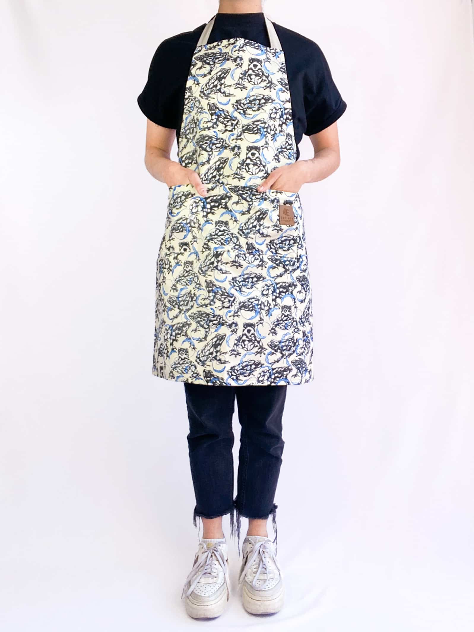 Delantal con nuestro estampado “Arlequines de la Noche Estrellada, guardianas del Agua – Autoridades protectoras de La Sierra Nevada de Santa Marta, símbolo de fertilidad y salud del ecosistema. En coro le cantan a la madre agua y avisan que ya se puede sembrar el alimento..”.