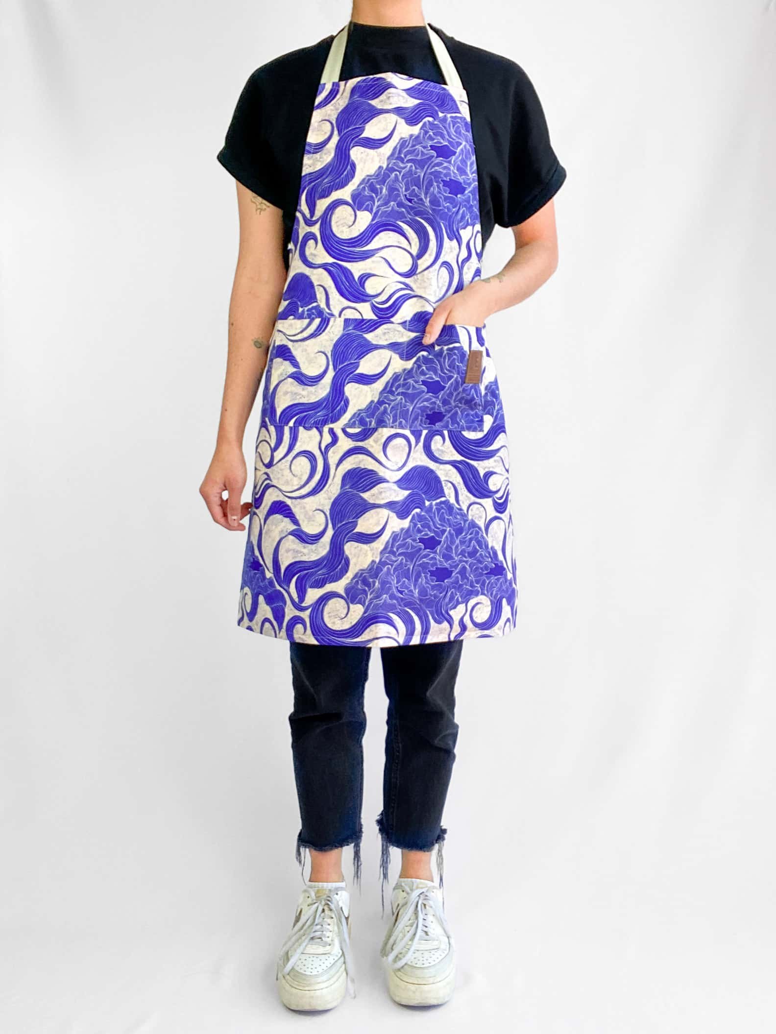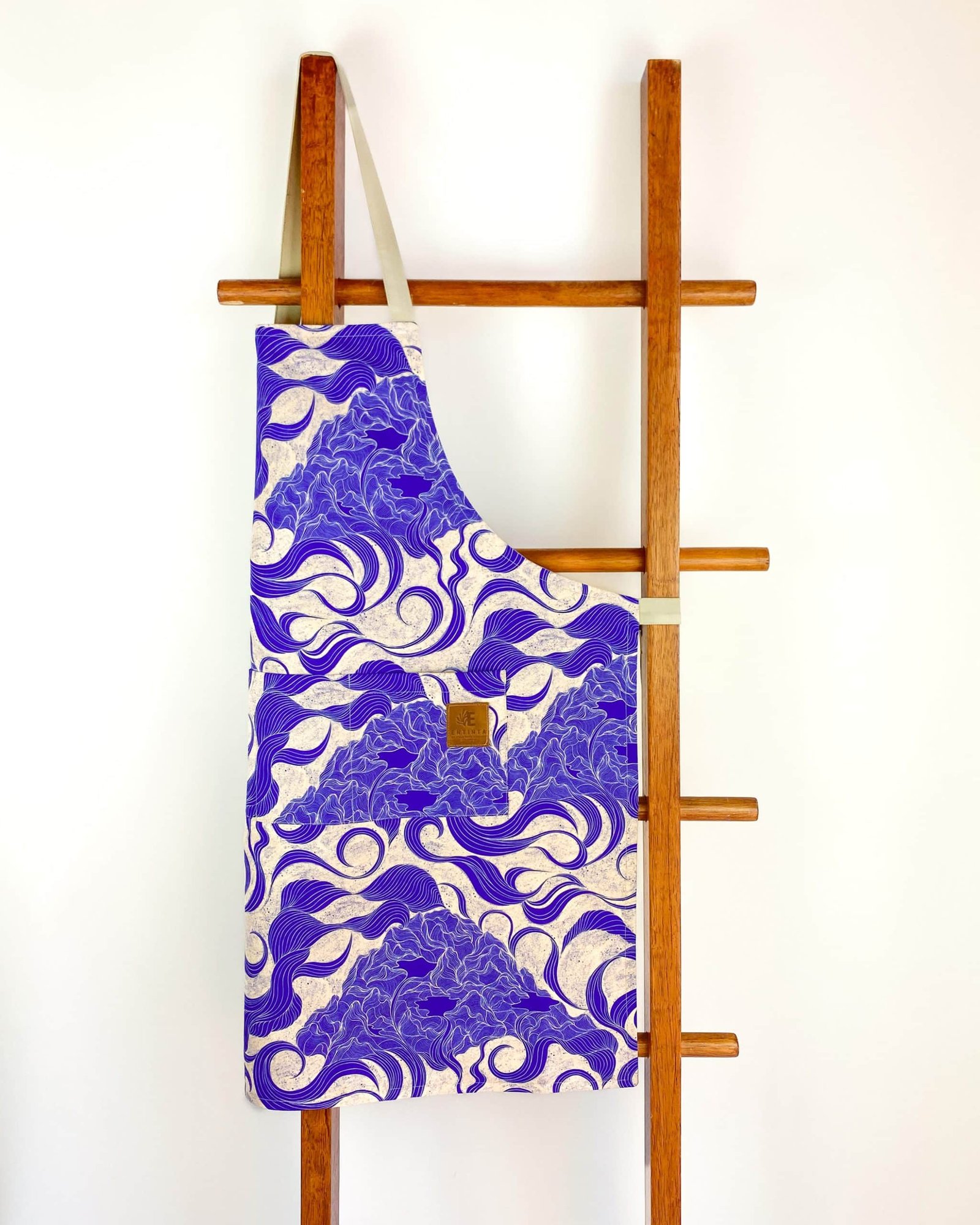 Delantal con nuestro estampado “El Fluir natural del Agua, movimiento cíclico y vital – El movimiento armónico y natural del agua, un ciclo que posibilita la vida de todo lo que está en la naturaleza. Fuerza vital y espiritual que fluye desde las lagunas y baja por los ríos para alimentar el mar, y se eleva de nuevo a la cima de La Sierra en forma de vapor y nubes, para cubrir de nuevo la montaña de nieve.”