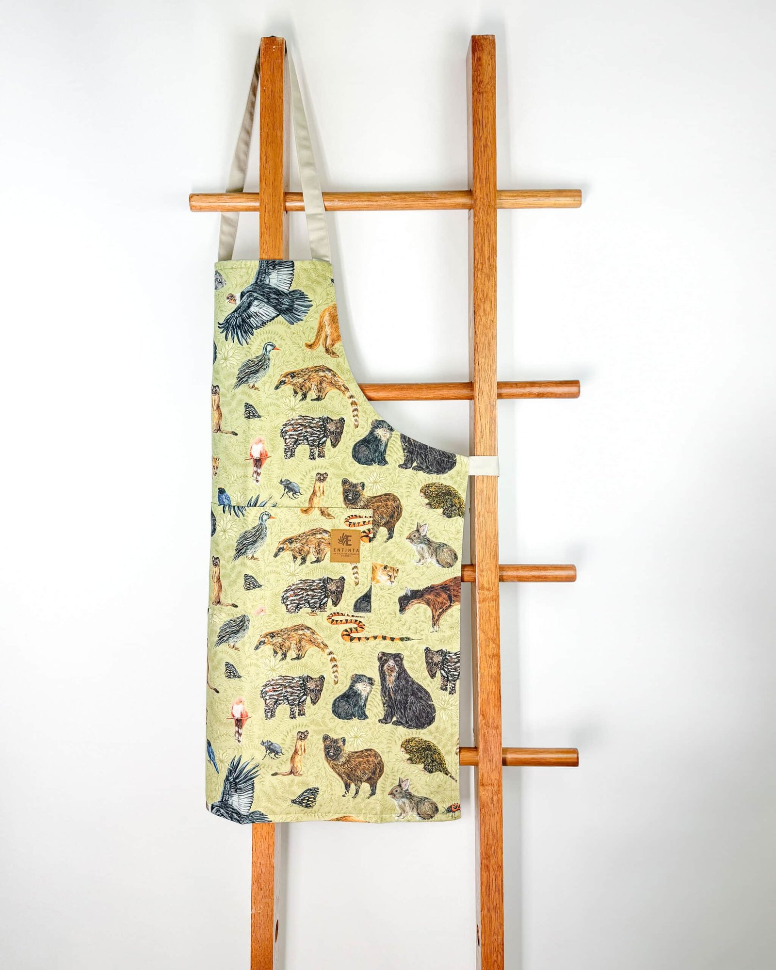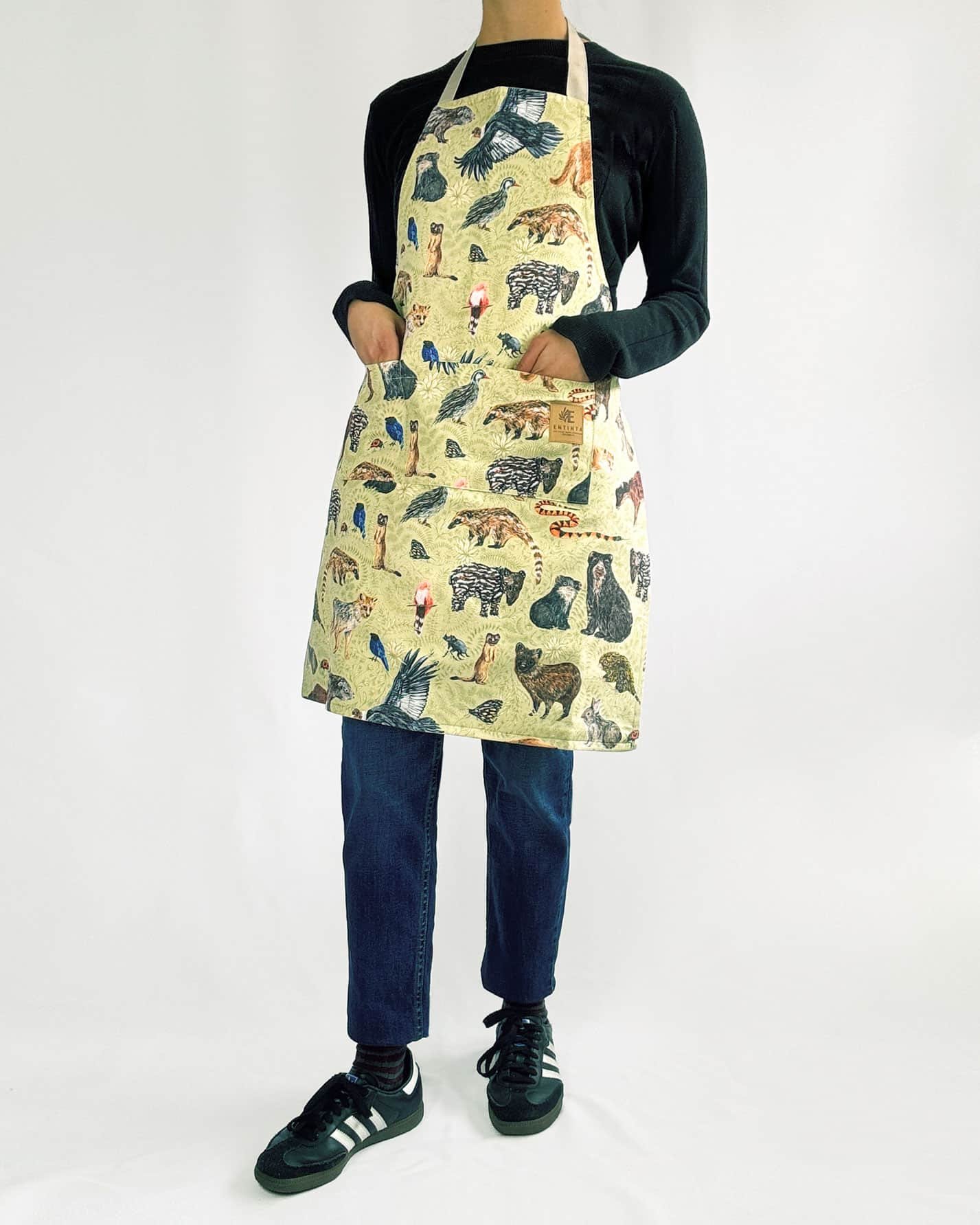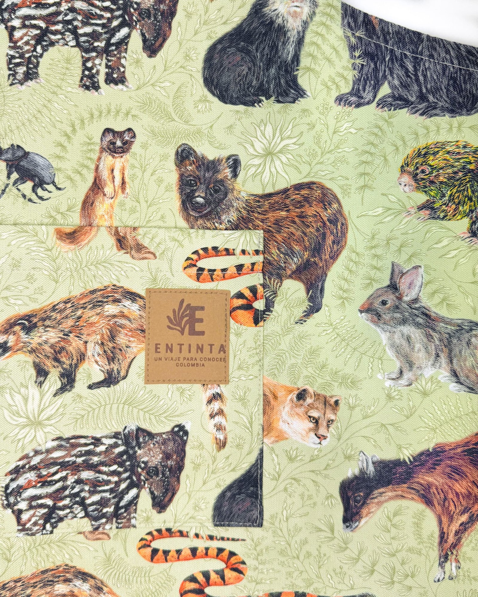 Delantal con nuestro estampado “Fauna Silvestre en las Montañas de Fuego – Seres de la naturaleza que habitan y protegen las montañas de Nariño. Cobijados por la fuerza de la montaña accionan en conjunto por el bienestar de la tierra y la red de vida que conforma el territorio.”