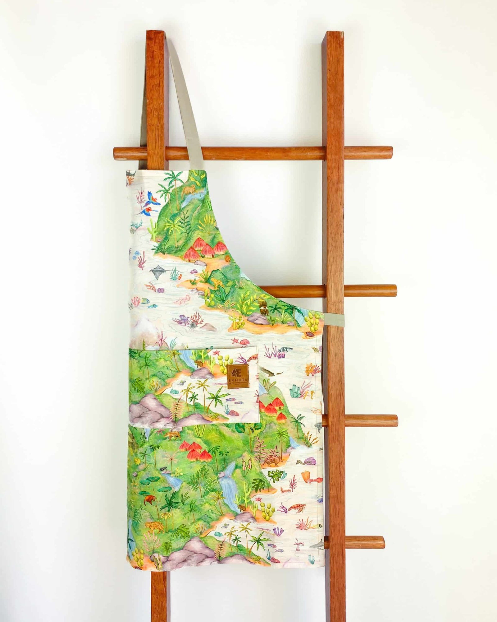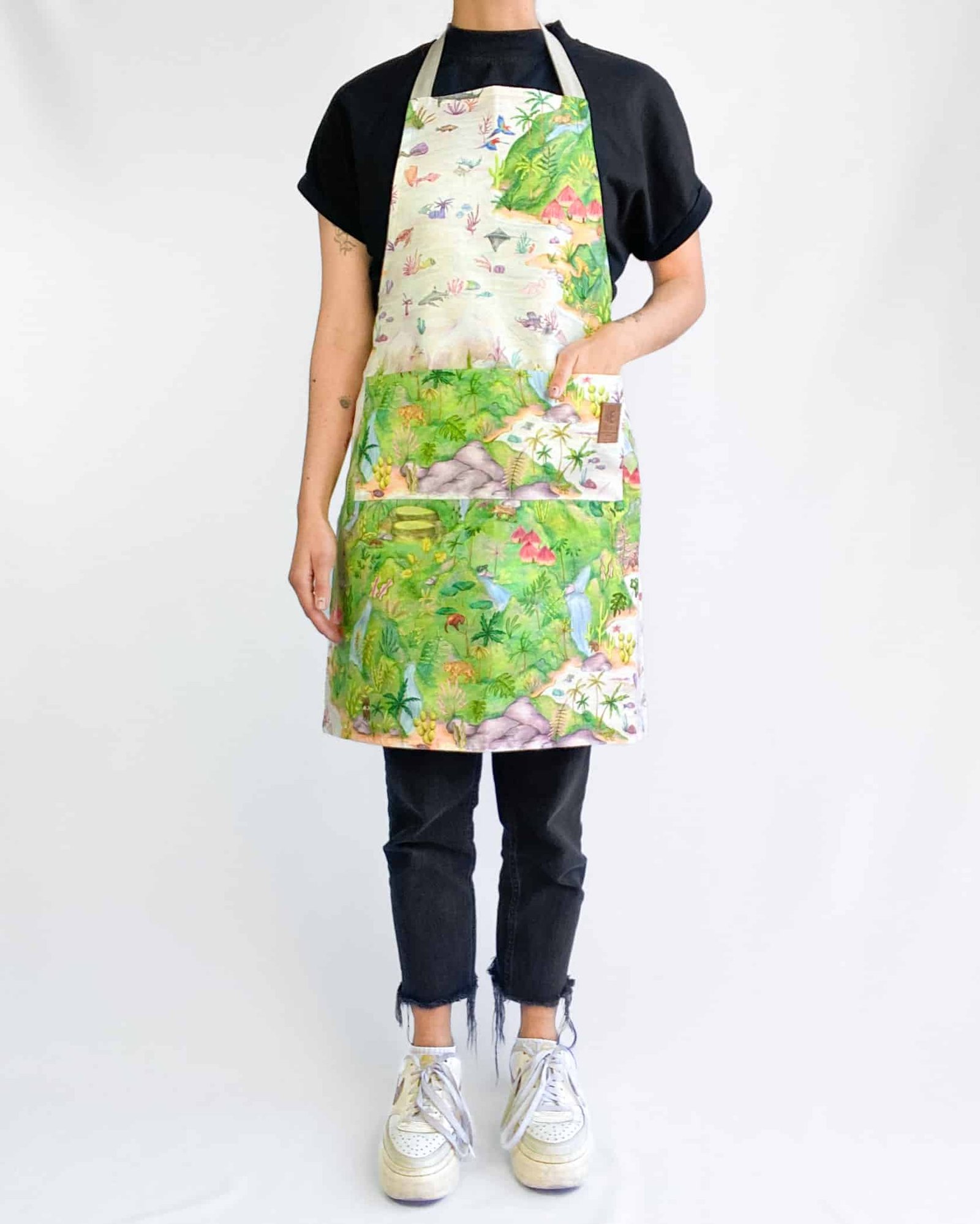 Delantal con nuestro estampado  La Sierra Nevada, un ecosistema de vidas en conexión – De agudas pendientes y abarcando todos los pisos térmicos, La Sierra es un espacio de intercambio de vitalidad. Un escenario natural único que nos pone en manifiesto que el convivir en reciprocidad es lo que garantiza la vida.”