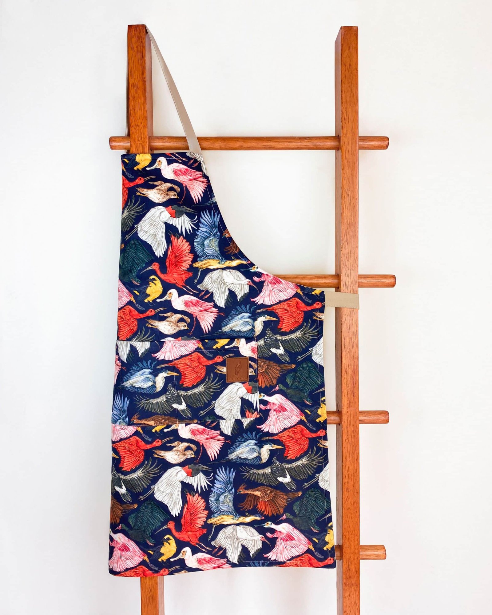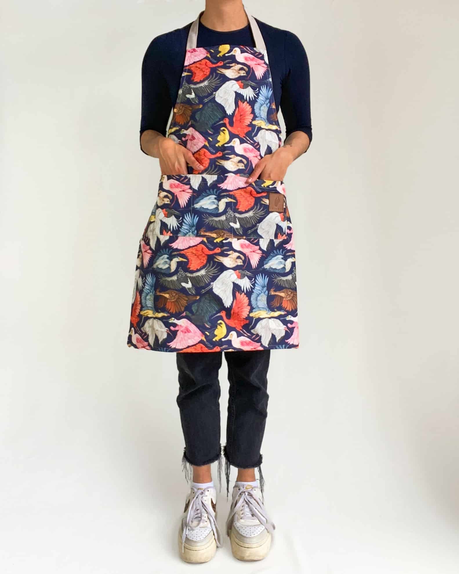 Delantal con nuestro estampado “Tierra de Aves, Diversidad de Vida y Color – Bandas de aves florecen el cielo de tonos infinitos con sus vistosos plumajes. Un espectáculo natural de color y diversidad que hace parte de la vida, cantos y cuentos del llano”.