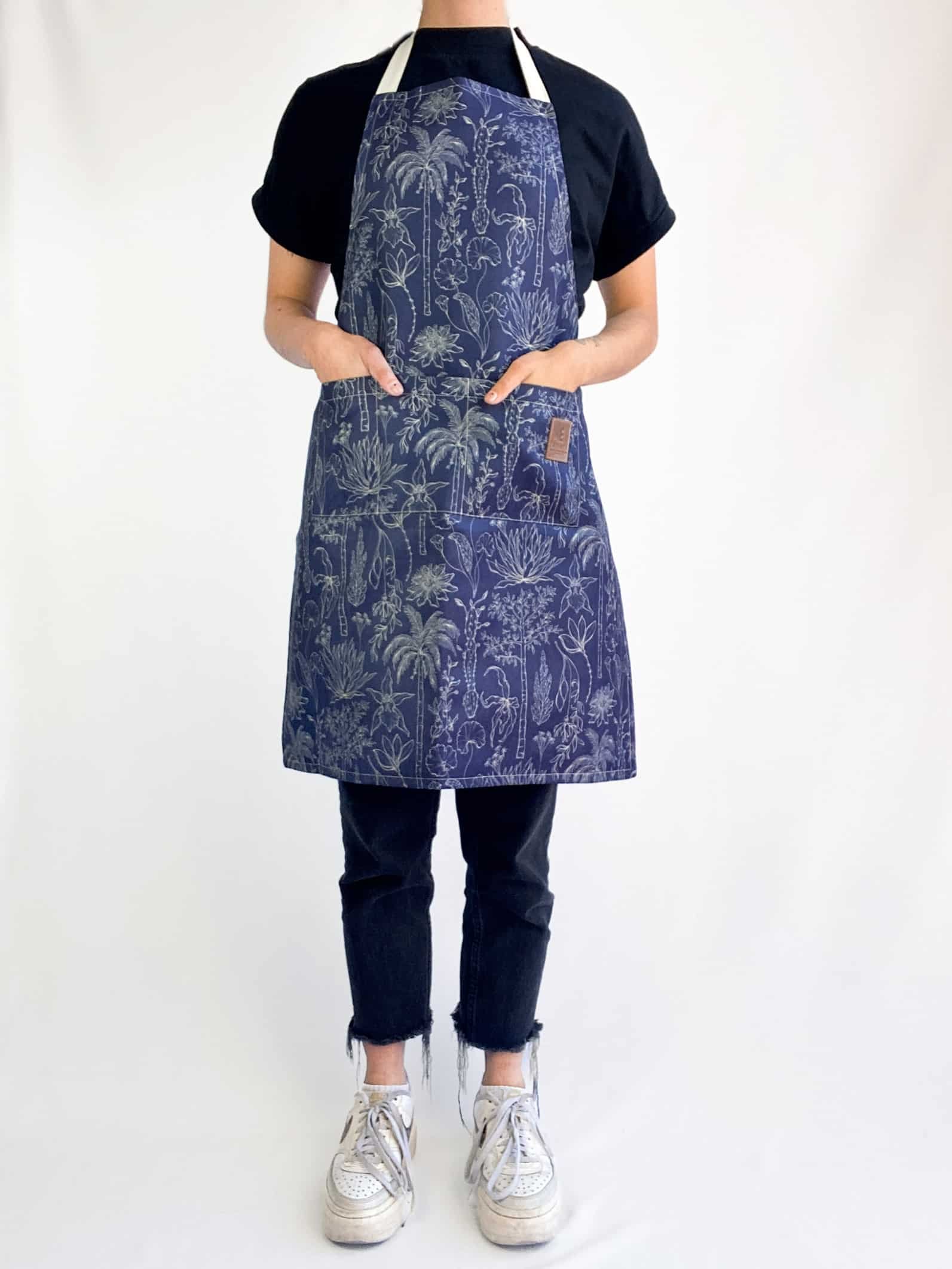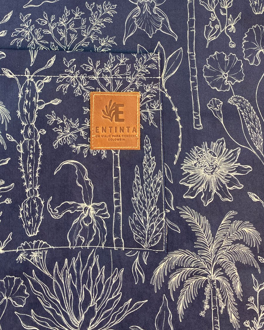 Delantal con nuestro estampado “Vegetación de La Sierra, heterogénea, relacional y vital – Un panorama de colores, tamaños y formas que cambia cada paso hacia arriba. Desde el mar caribe hasta los picos nevados, a cada planta de La Sierra se le asignó una función ecológica y espiritual que cumplir en el tejido de la vida. Hay plantas medicinales, comestibles, de uso ceremonial, para construir y tinturar.”.