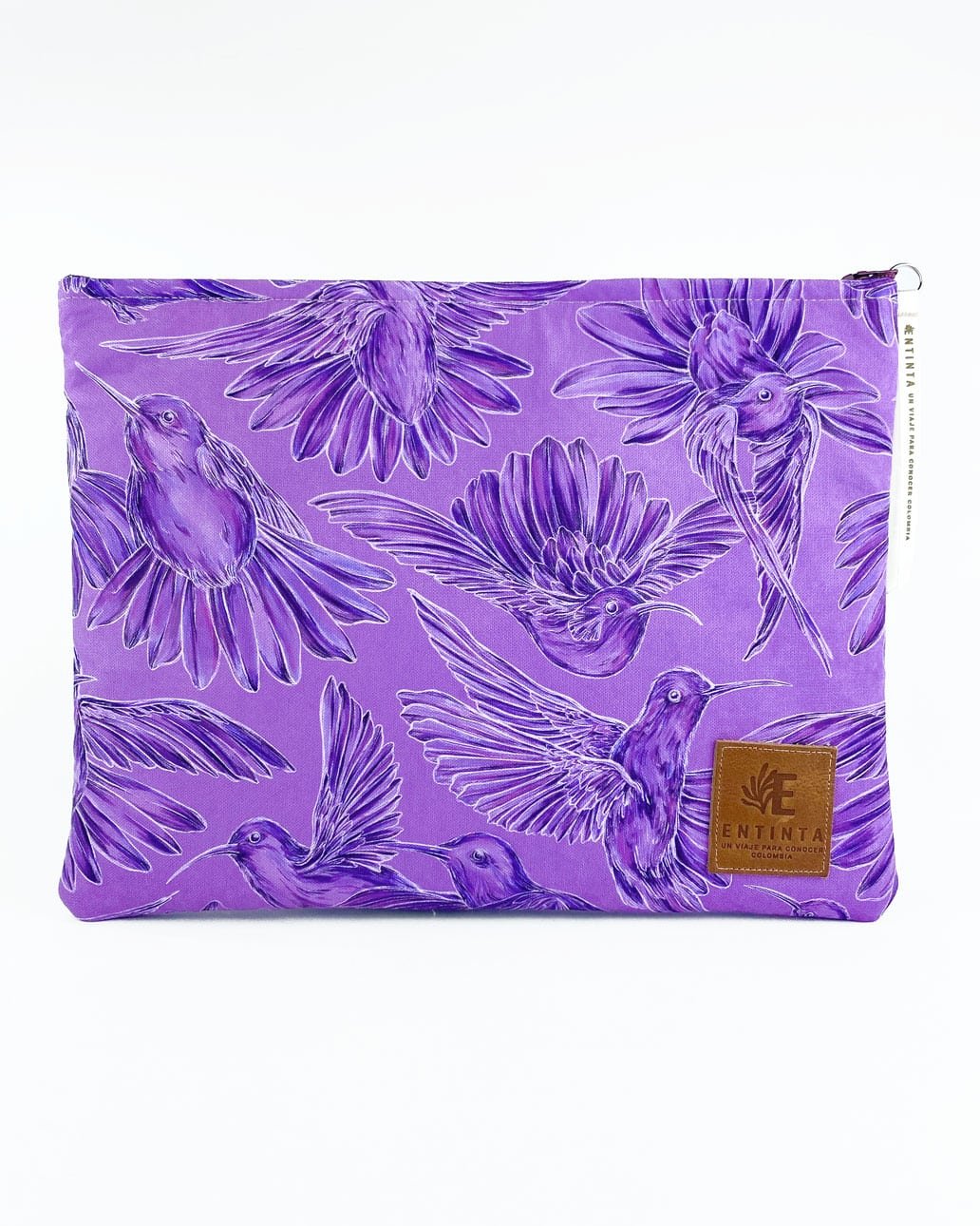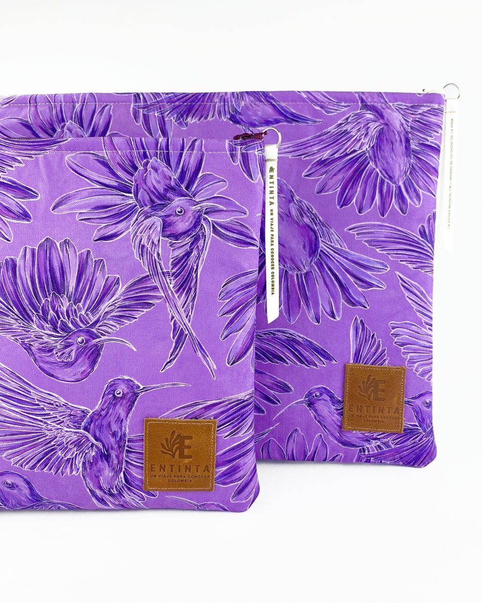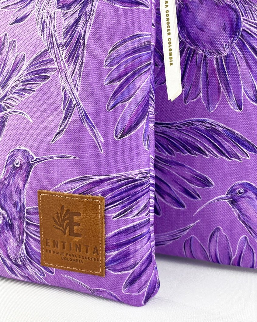Estuches para Tablet 11” y Portátil 13” con nuestro estampado “Colibríes, mensajeros del mundo natural y espiritual – Con sus alas desplegadas y plumajes vistosos los colibríes vuelan y bailan por La Sierra Nevada. Con sus cantos relatan los secretos de la montaña y propagan los mensajes de la naturaleza, pronosticando las lluvias y sequías, y anunciando los tiempos de siembra y cosecha.”