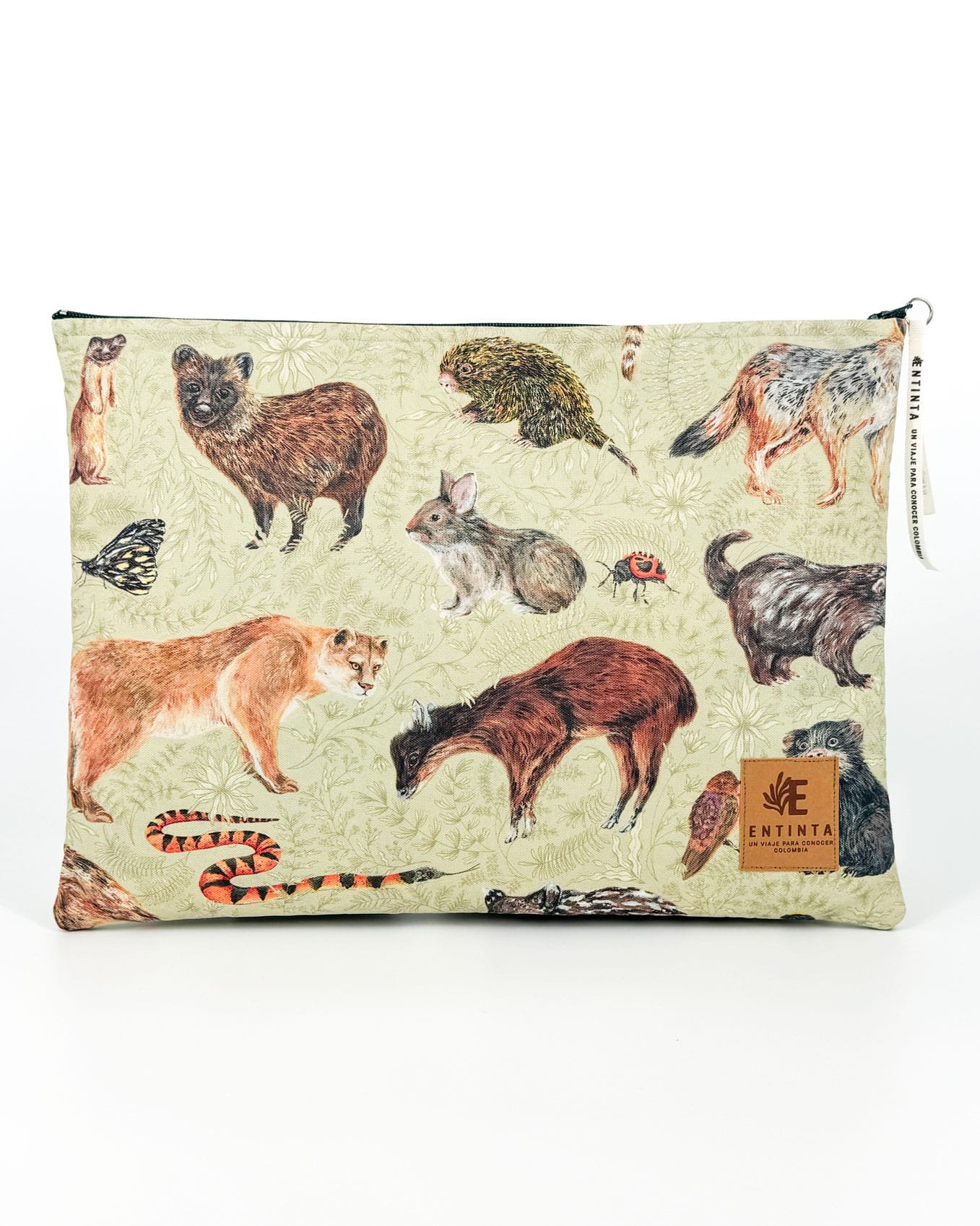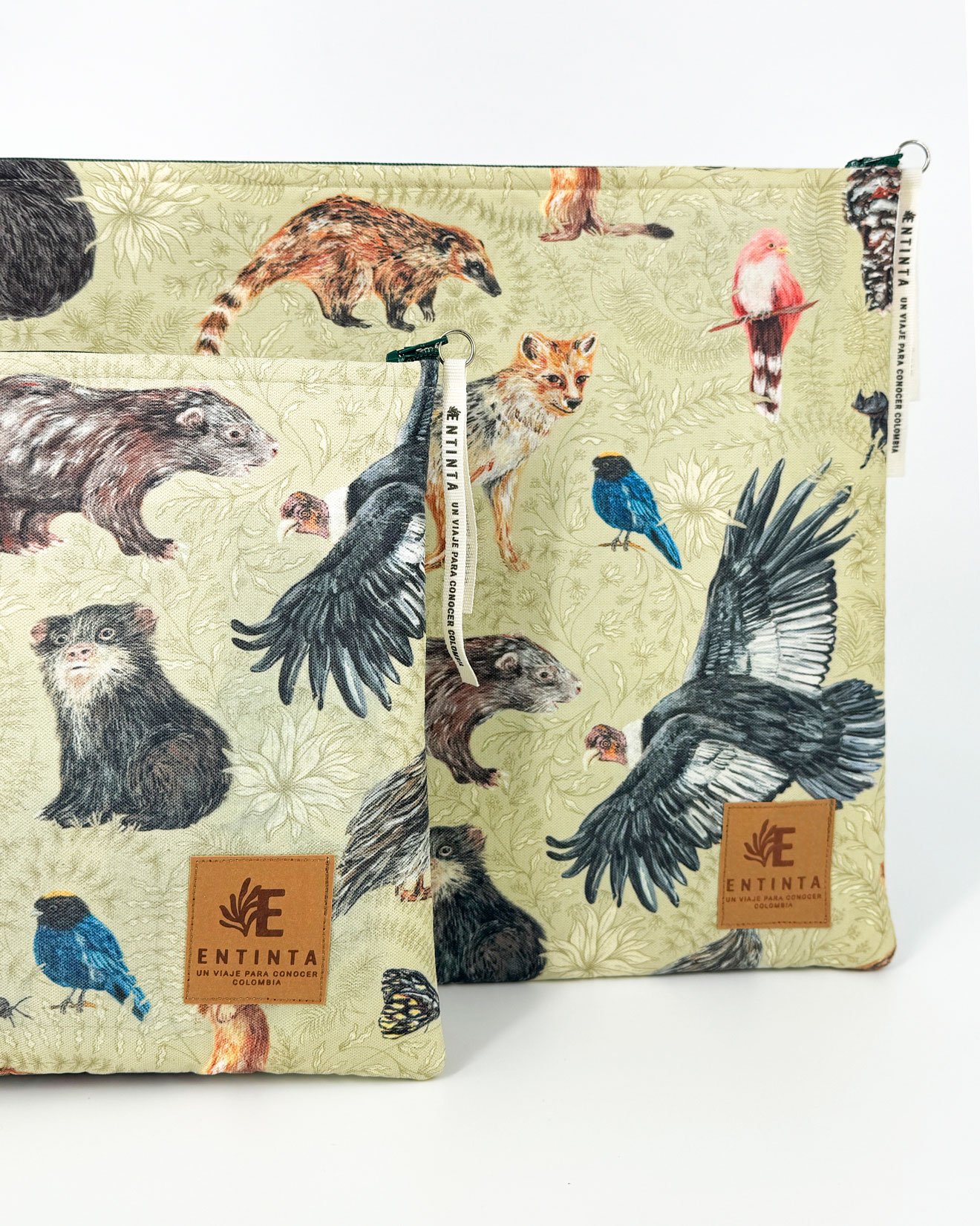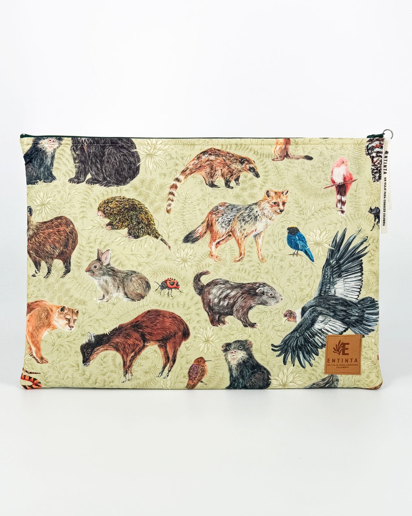 Estuches para Tablet 11” y Portátil 13”-15″ con nuestro estampado  “Fauna Silvestre en las Montañas de Fuego – Seres de la naturaleza que habitan y protegen las montañas de Nariño. Cobijados por la fuerza de la montaña accionan en conjunto por el bienestar de la tierra y la red de vida que conforma el territorio.”