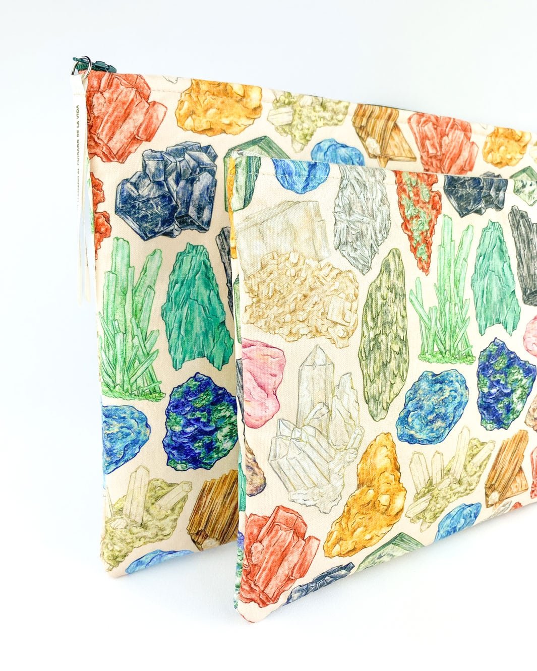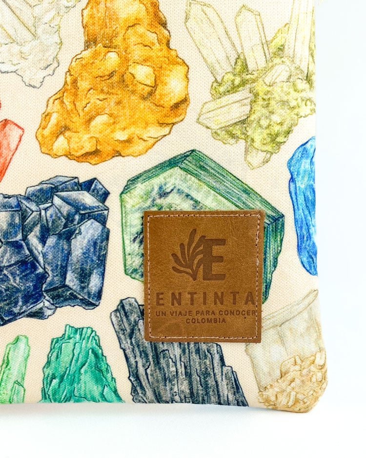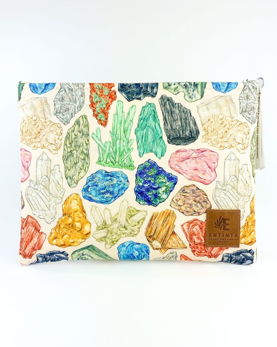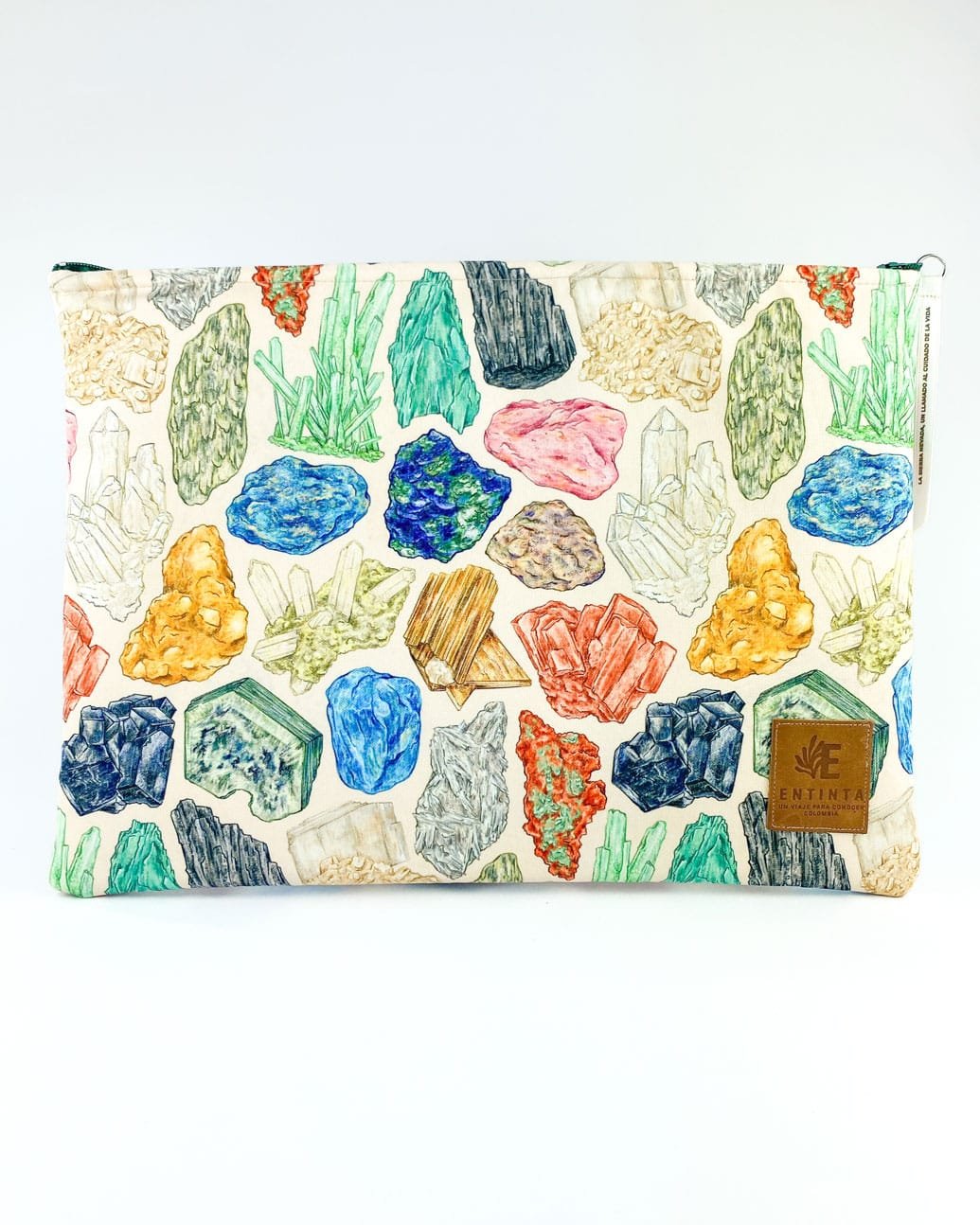 Estuches para Tablet 11” y Portátil 13” con nuestro estampado “Minerales, proveedores de vida y equilibrio – Encargados de proteger y equilibrar el suelo de La Sierra, los minerales proveen fuerza a la naturaleza que vive en el mar y la montaña. Cuando estos son alterados o se extraen de la tierra se debilita la vida de todos los seres de la naturaleza”.