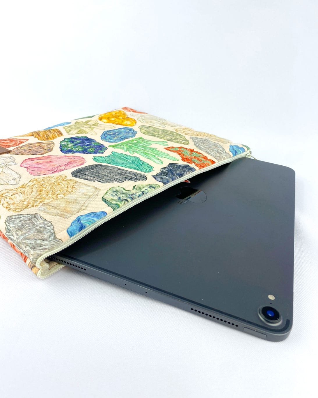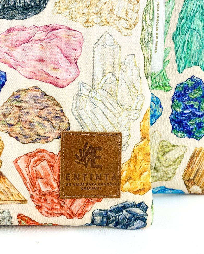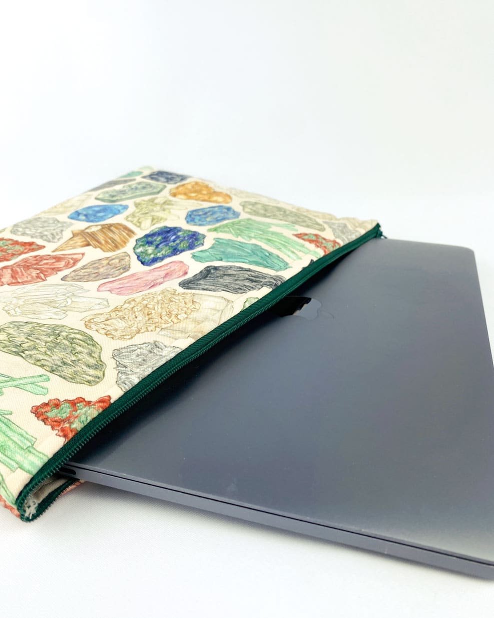 Estuches para Tablet 11” y Portátil 13” con nuestro estampado “Minerales, proveedores de vida y equilibrio – Encargados de proteger y equilibrar el suelo de La Sierra, los minerales proveen fuerza a la naturaleza que vive en el mar y la montaña. Cuando estos son alterados o se extraen de la tierra se debilita la vida de todos los seres de la naturaleza”.