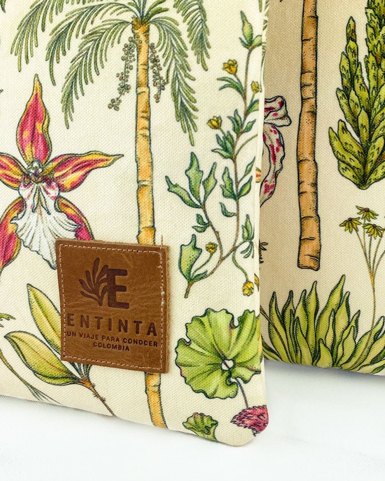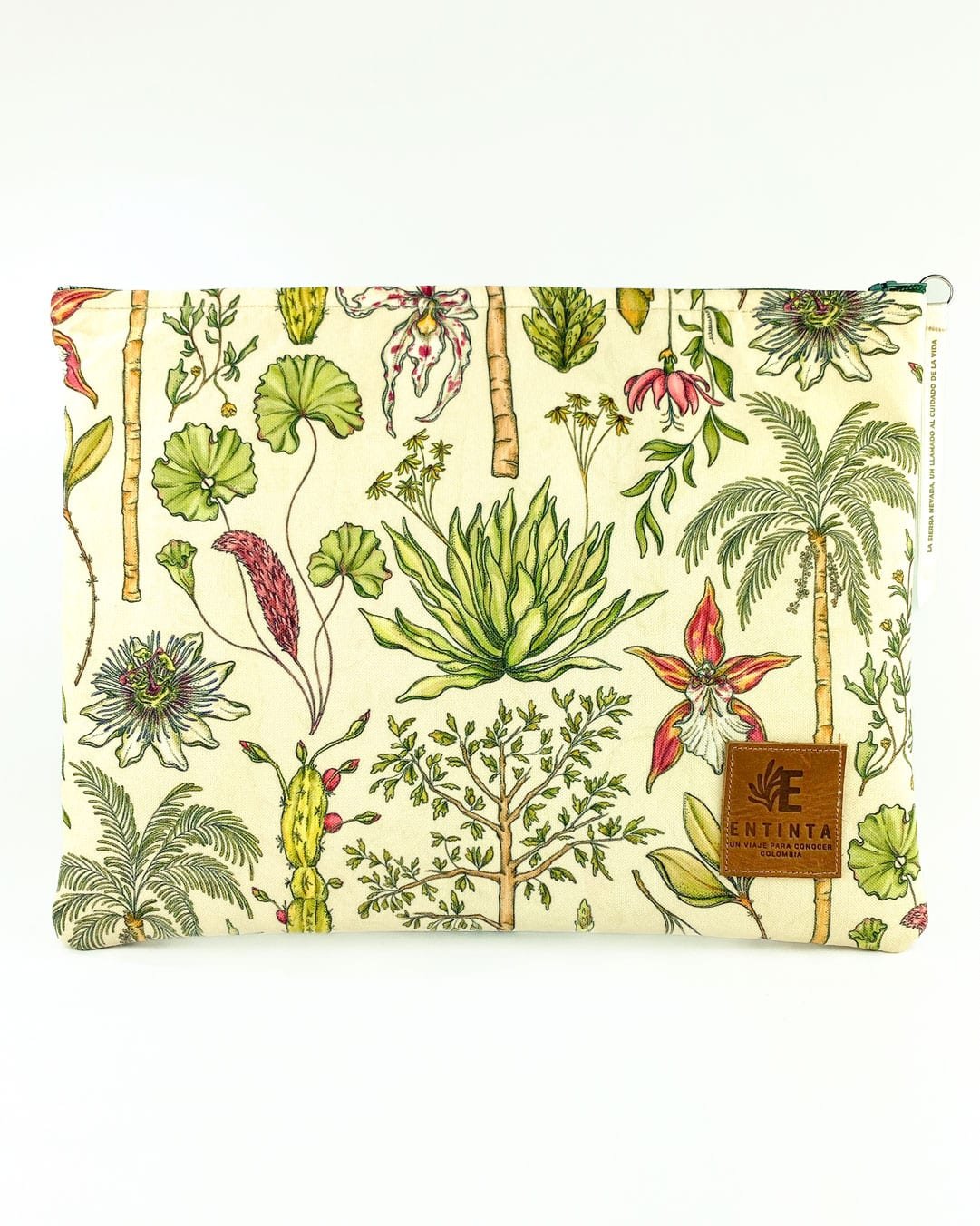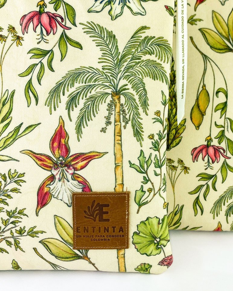 Estuches para Tablet 11” y Portátil 13” con nuestro estampado “Vegetación de La Sierra, heterogénea, relacional y vital – Un panorama de colores, tamaños y formas que cambia cada paso hacia arriba. Desde el mar caribe hasta los picos nevados, a cada planta de La Sierra se le asignó una función ecológica y espiritual que cumplir en el tejido de la vida. Hay plantas medicinales, comestibles, de uso ceremonial, para construir y tinturar.”.