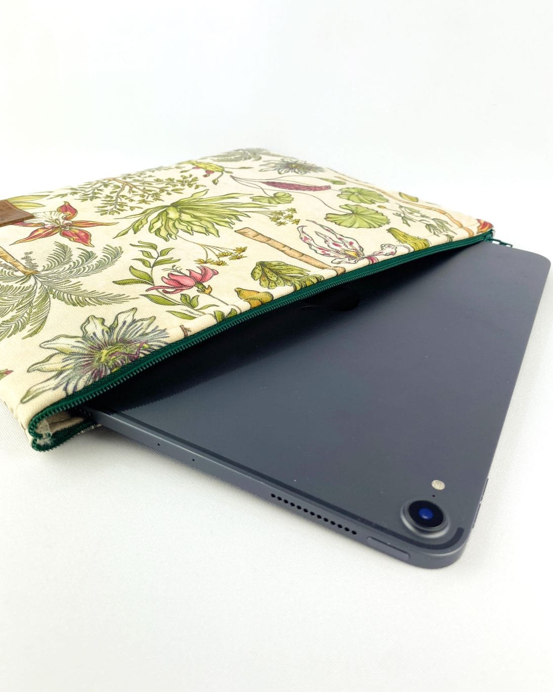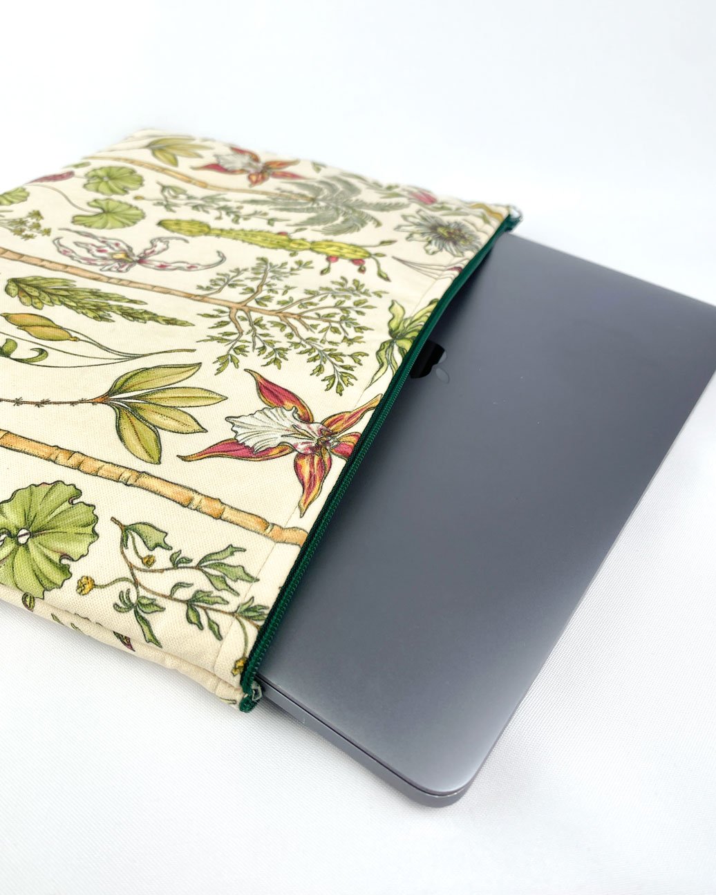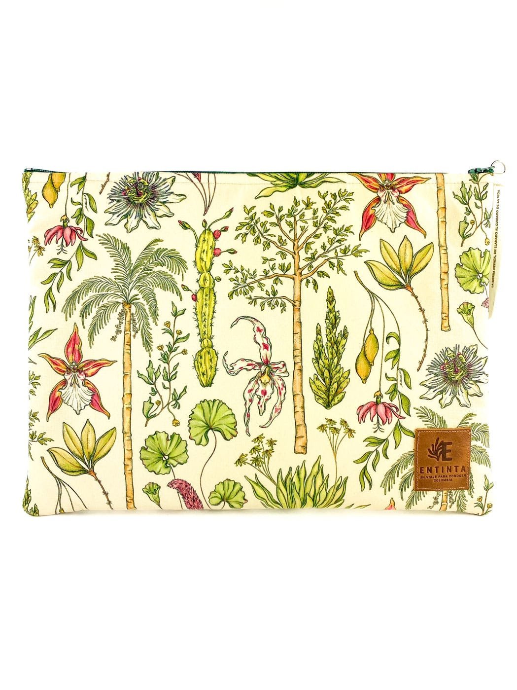 Estuches para Tablet 11” y Portátil 13” con nuestro estampado “Vegetación de La Sierra, heterogénea, relacional y vital – Un panorama de colores, tamaños y formas que cambia cada paso hacia arriba. Desde el mar caribe hasta los picos nevados, a cada planta de La Sierra se le asignó una función ecológica y espiritual que cumplir en el tejido de la vida. Hay plantas medicinales, comestibles, de uso ceremonial, para construir y tinturar.”.