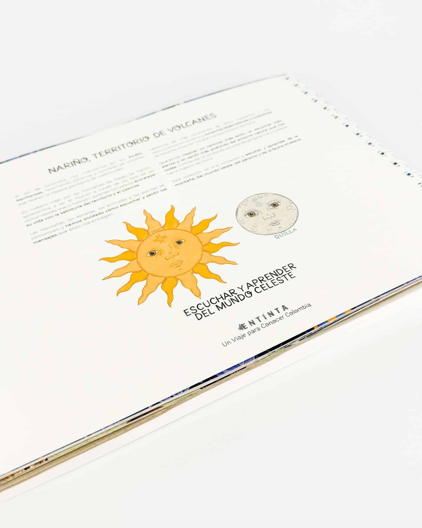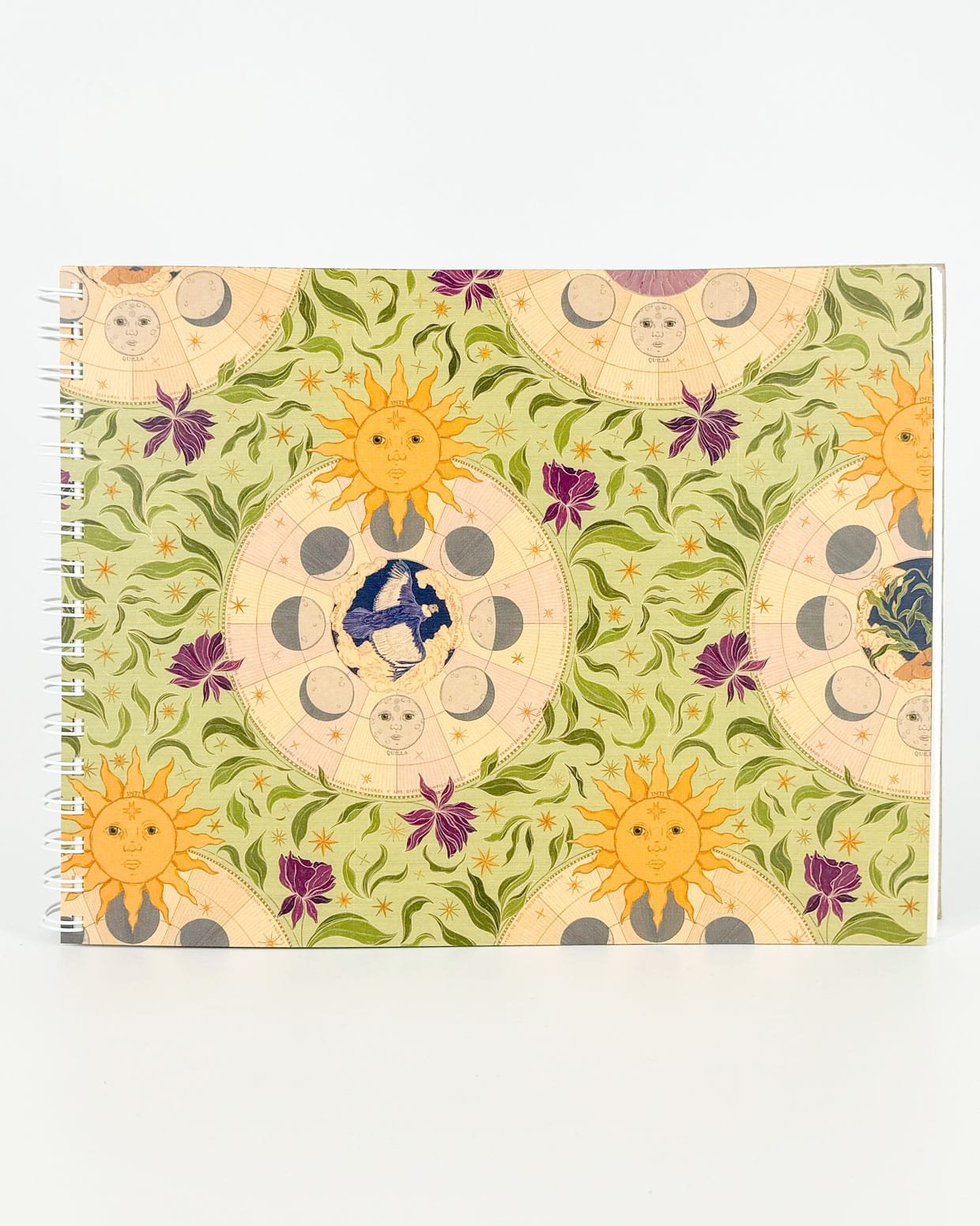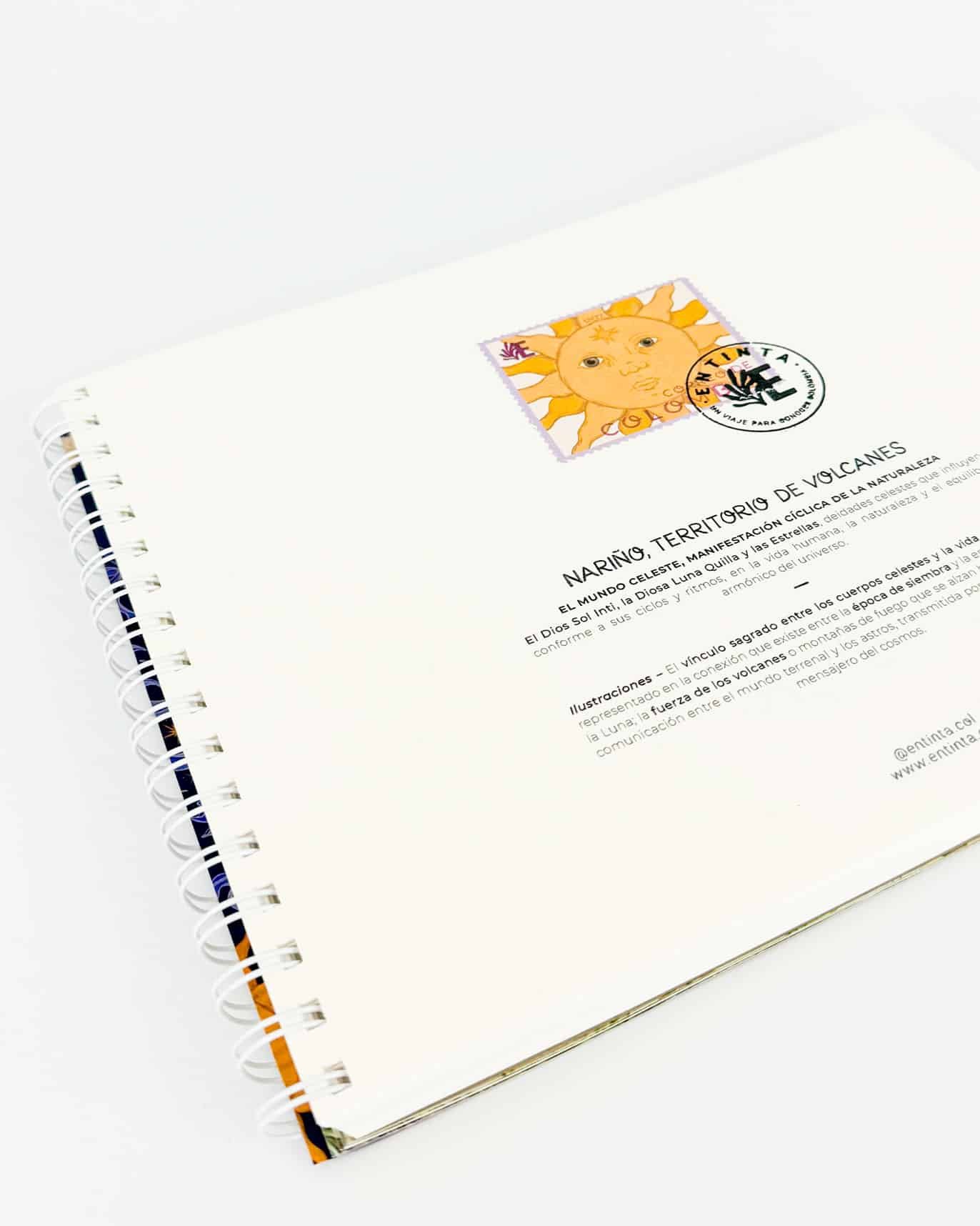 Libreta de dibujo tamaño carta con nuestro estampado “El Mundo Celeste, manifestación cíclica de la naturaleza – El Dios Sol Inti, la Diosa Luna Quilla y las Estrellas, deidades celestes que influyen, conforme a sus ciclos y ritmos, en la vida humana, la naturaleza y el equilibrio armónico del universo.”