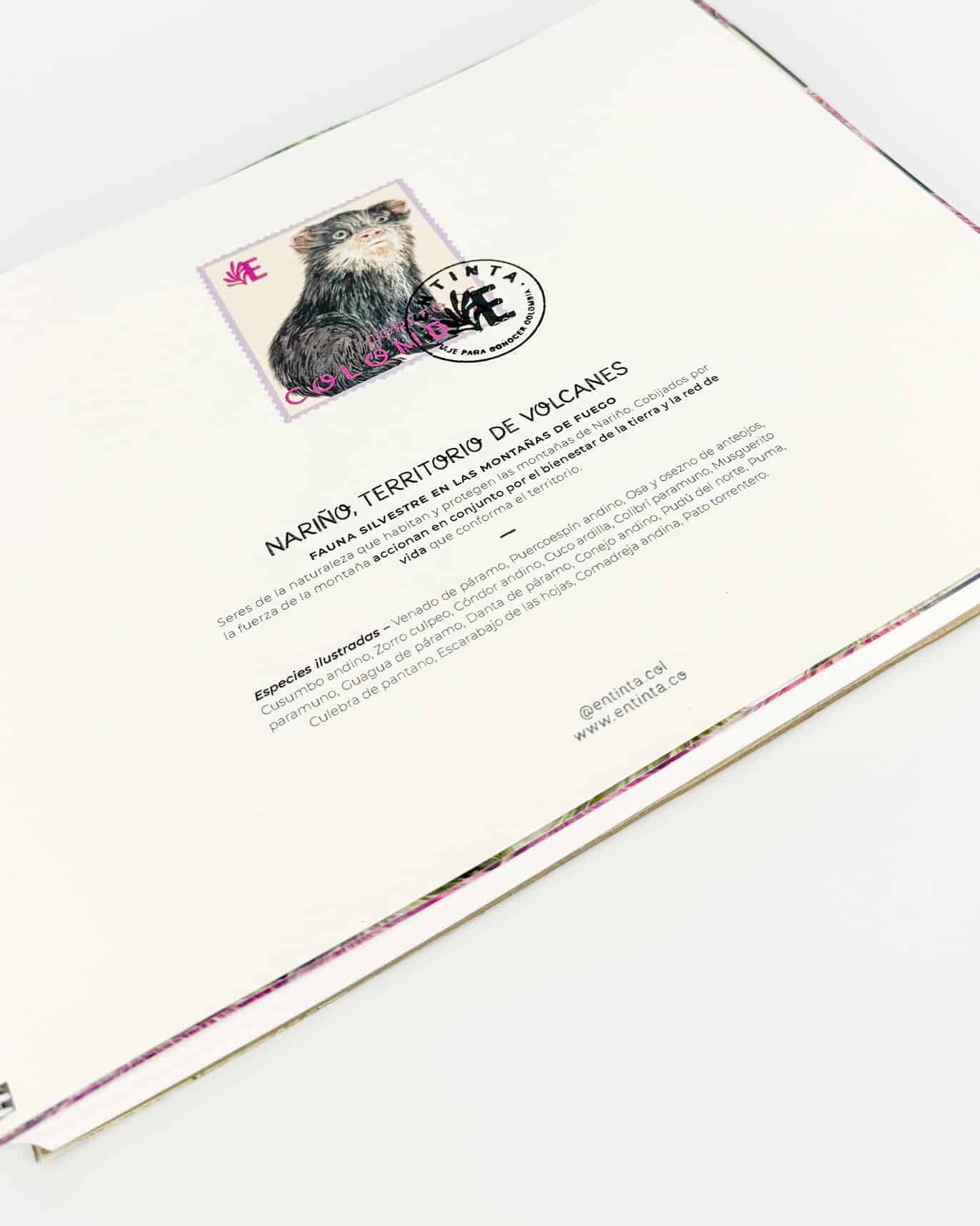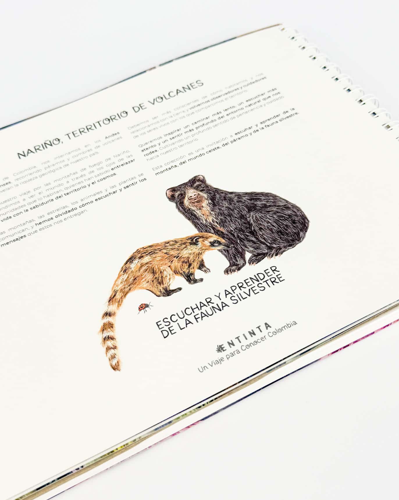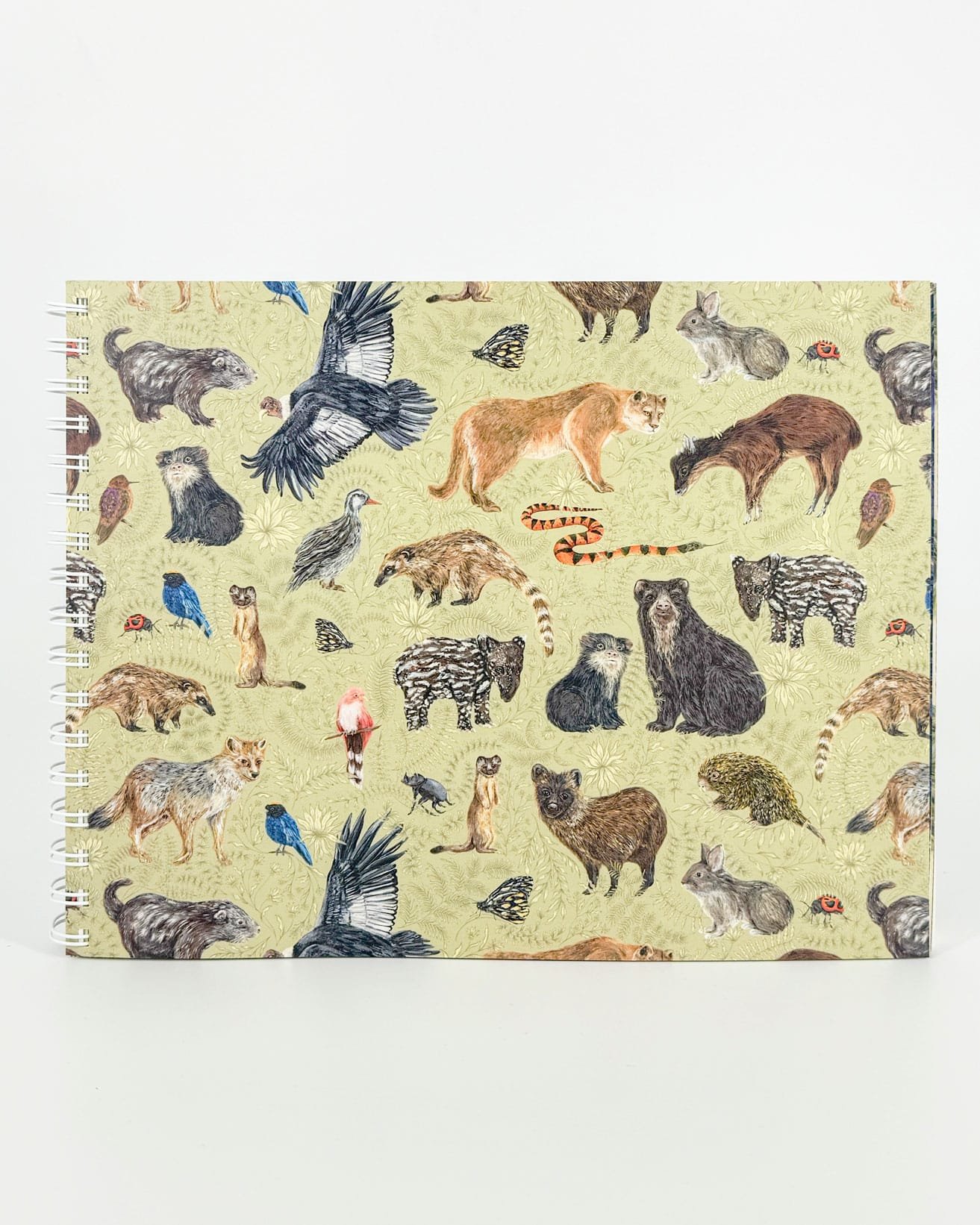 Libreta de dibujo tamaño carta con nuestro estampado  “Fauna Silvestre en las Montañas de Fuego – Seres de la naturaleza que habitan y protegen las montañas de Nariño. Cobijados por la fuerza de la montaña accionan en conjunto por el bienestar de la tierra y la red de vida que conforma el territorio.”