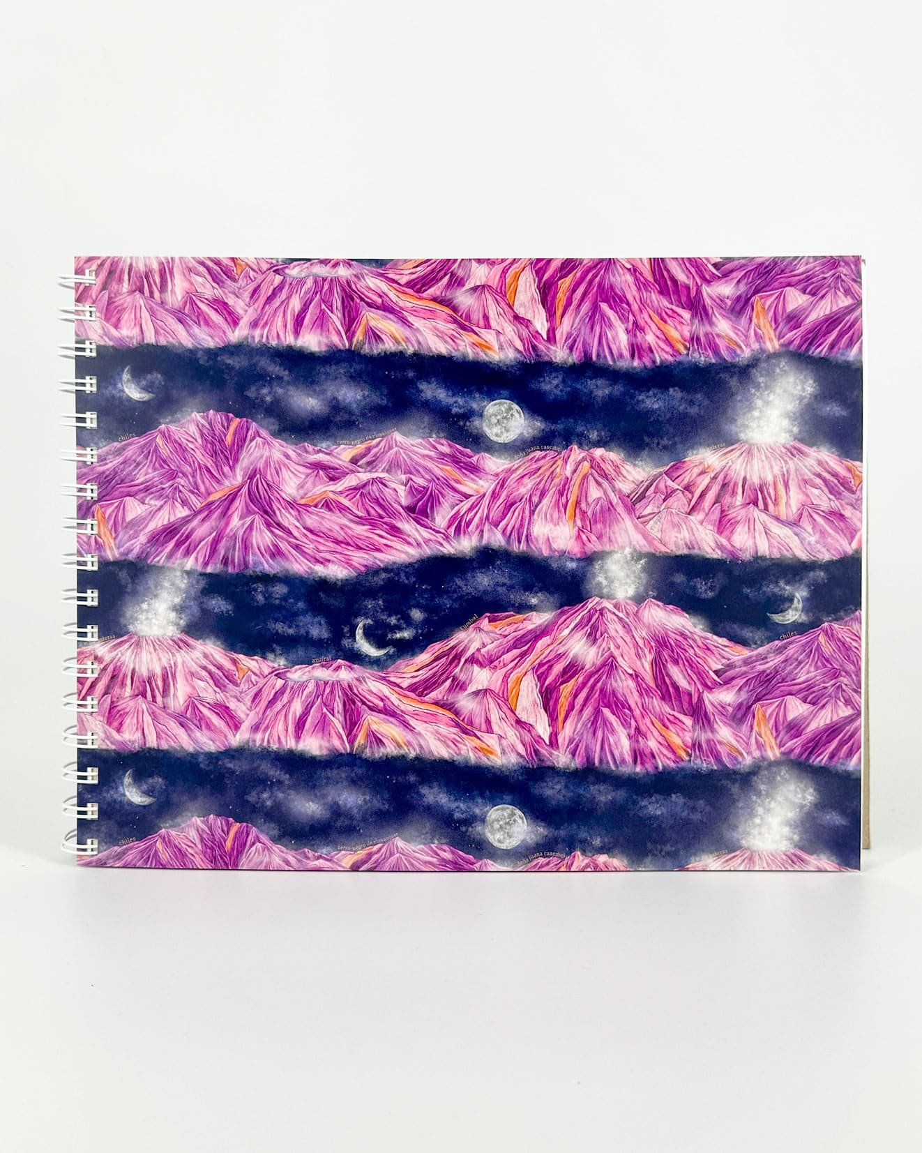 Libreta de dibujo tamaño carta con nuestro estampado “La Ruta del Fuego de Nariño – La geografía sagrada de Nariño se eleva con la imponencia de sus volcanes, montañas de fuego que ponen en manifiesto la fuerza de la naturaleza. Guardianes milenarios, símbolos de poder y fertilidad, lugar donde el territorio respira liberando su energía a través de cráteres.”