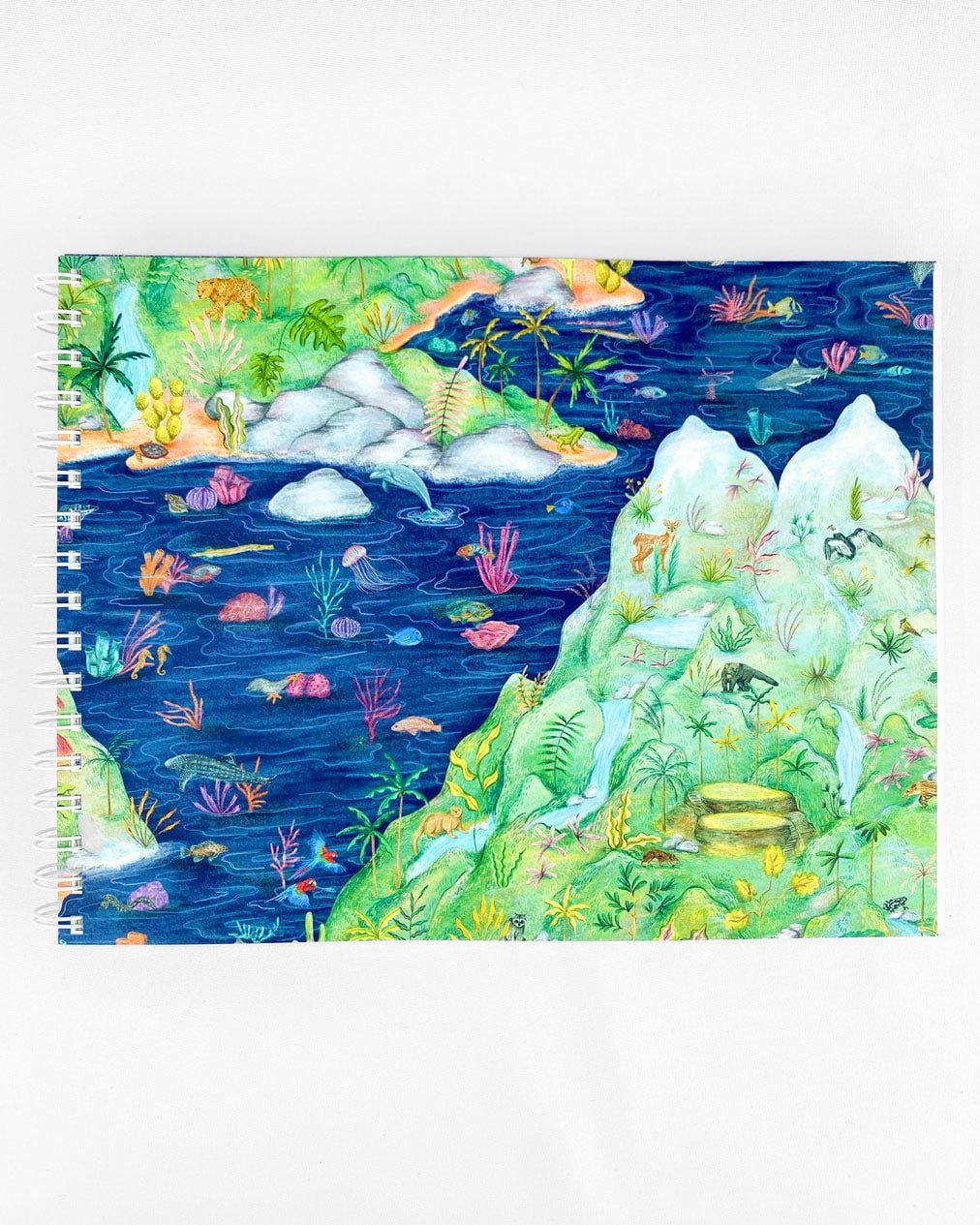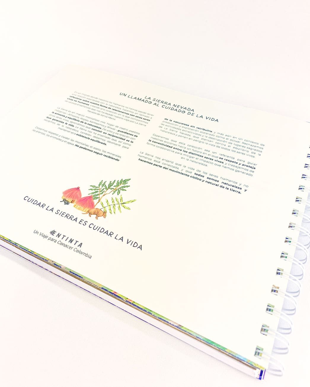 Libreta de dibujo tamaño carta con nuestro estampado “La Sierra Nevada, un ecosistema de vidas en conexión – De agudas pendientes y abarcando todos los pisos térmicos, La Sierra es un espacio de intercambio de vitalidad. Un escenario natural único que nos pone en manifiesto que el convivir en reciprocidad es lo que garantiza la vida.”