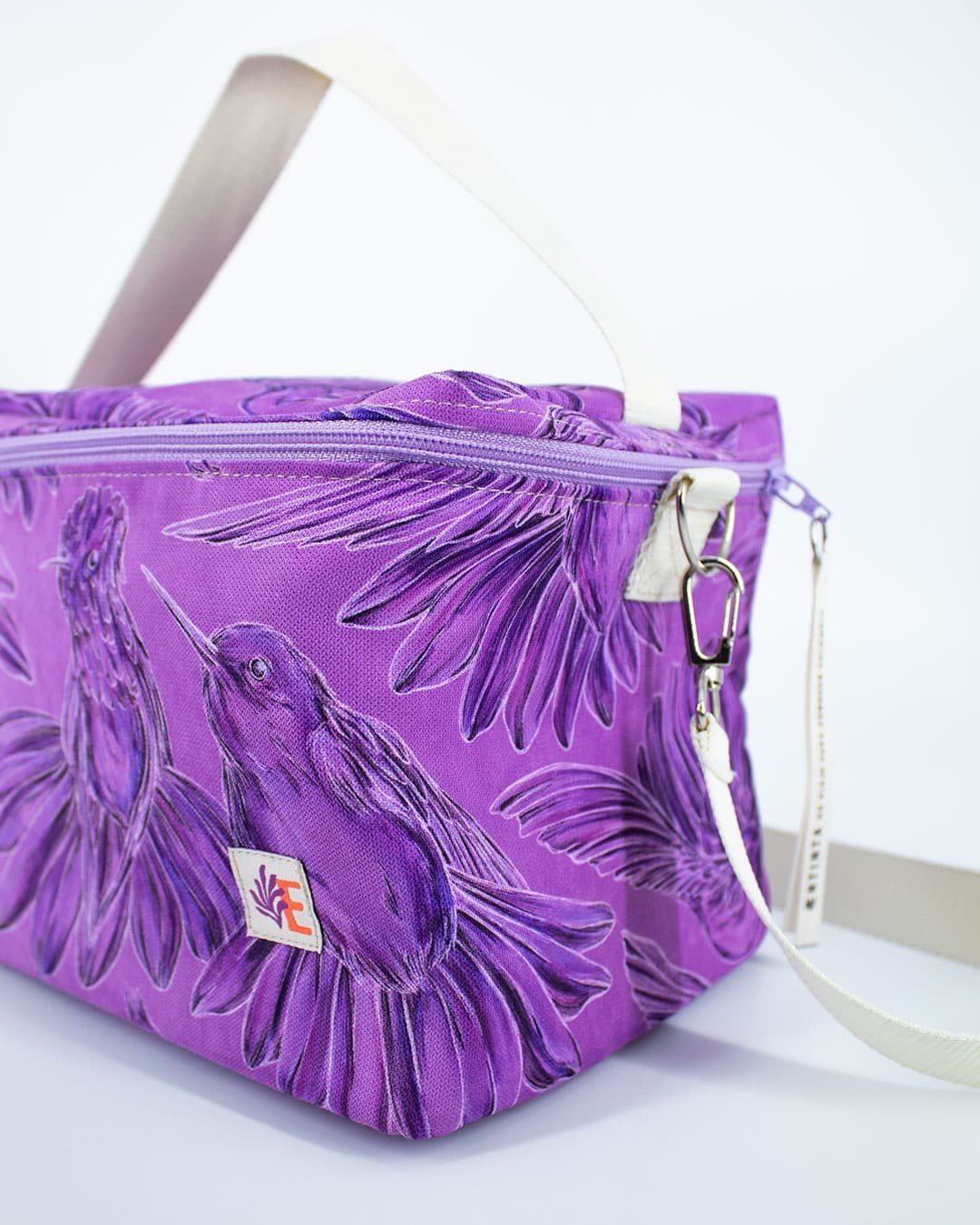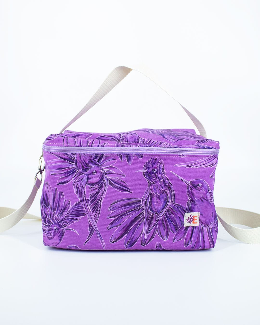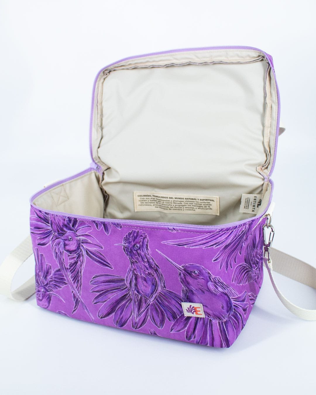 Lonchera con nuestro estampado “Colibríes, mensajeros del mundo natural y espiritual – Con sus alas desplegadas y plumajes vistosos los colibríes vuelan y bailan por La Sierra Nevada. Con sus cantos relatan los secretos de la montaña y propagan los mensajes de la naturaleza, pronosticando las lluvias y sequías, y anunciando los tiempos de siembra y cosecha.”