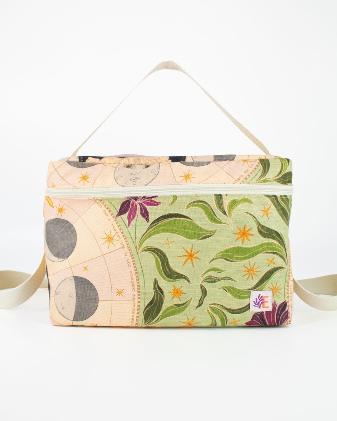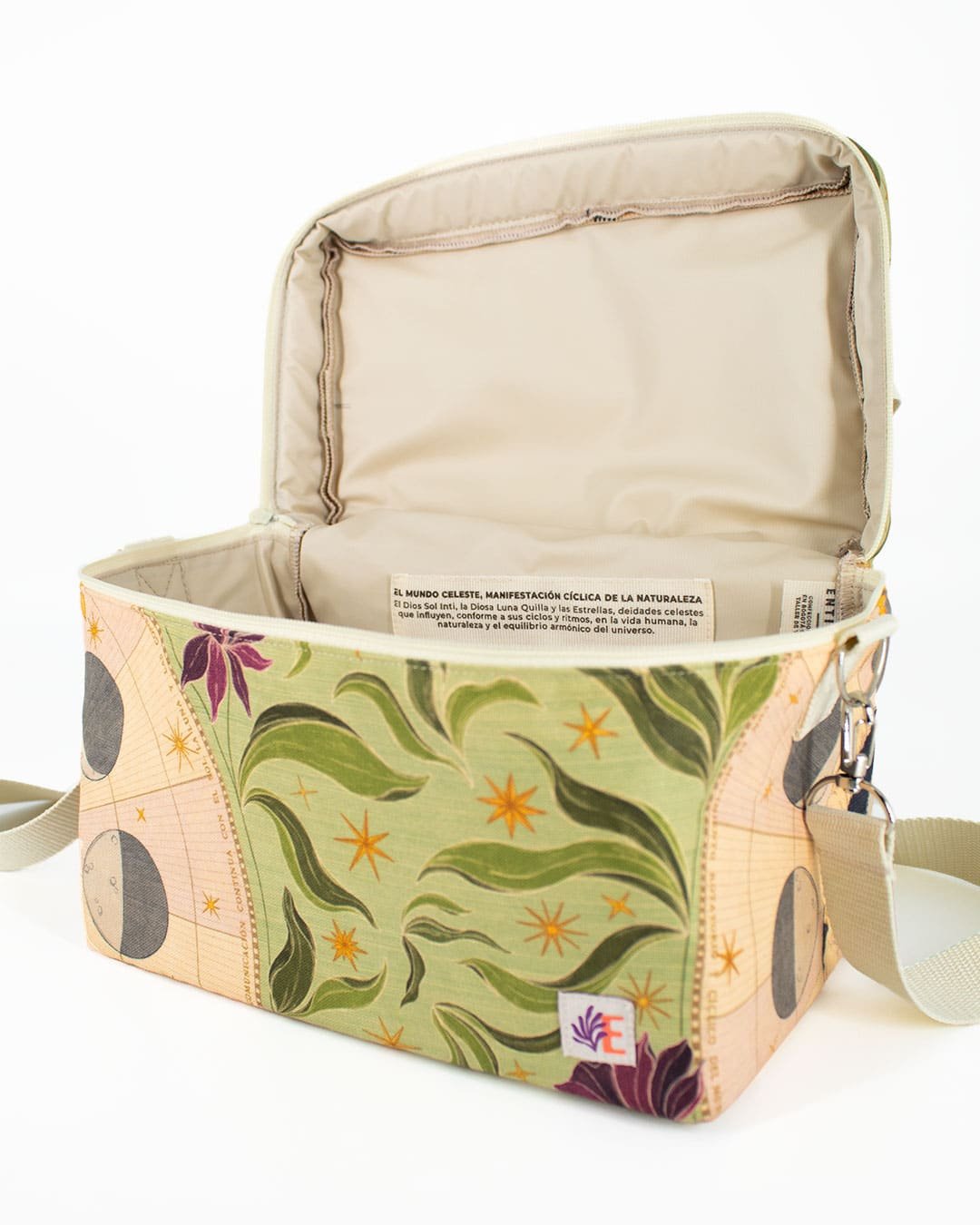 Lonchera con nuestro estampado “El Mundo Celeste, manifestación cíclica de la naturaleza – El Dios Sol Inti, la Diosa Luna Quilla y las Estrellas, deidades celestes que influyen, conforme a sus ciclos y ritmos, en la vida humana, la naturaleza y el equilibrio armónico del universo.”