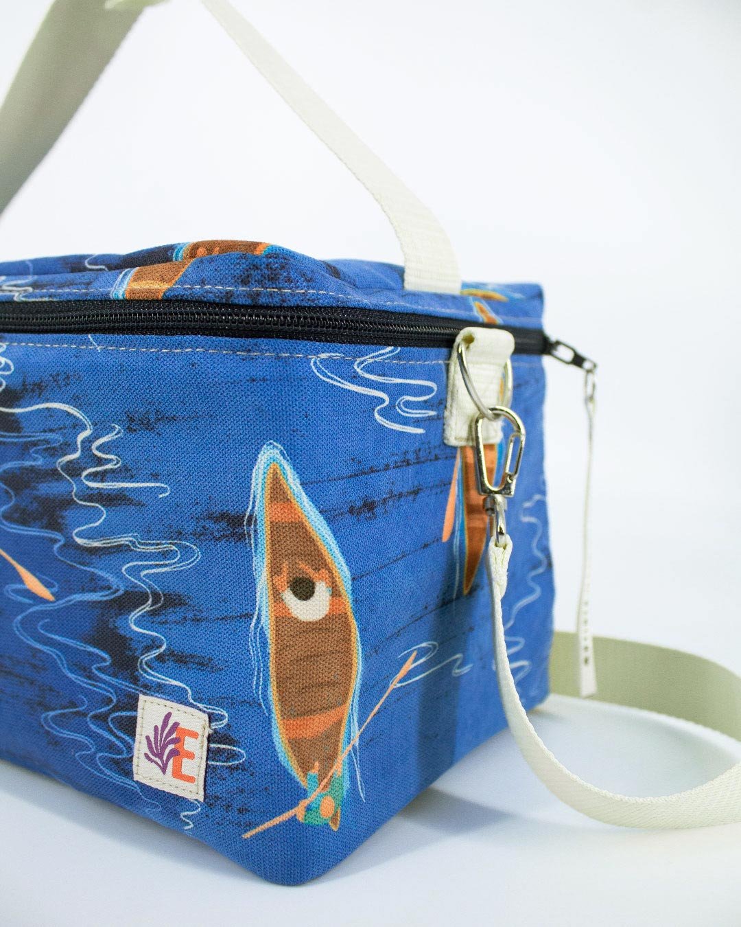 Lonchera con nuestro estampado “La Estrella Fluvial de Inírida – En canoas avanzan a remo los indígenas, atravesando aguas de colores diversos creadas por la confluencia de los ríos Inírida, Guaviare y Atabapo”.