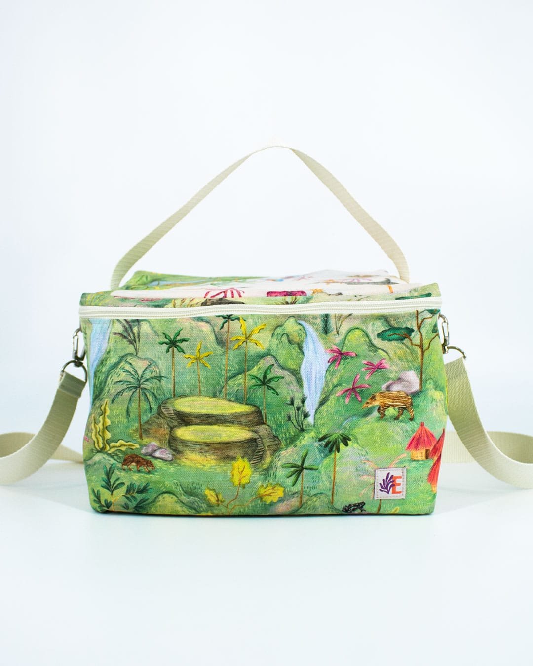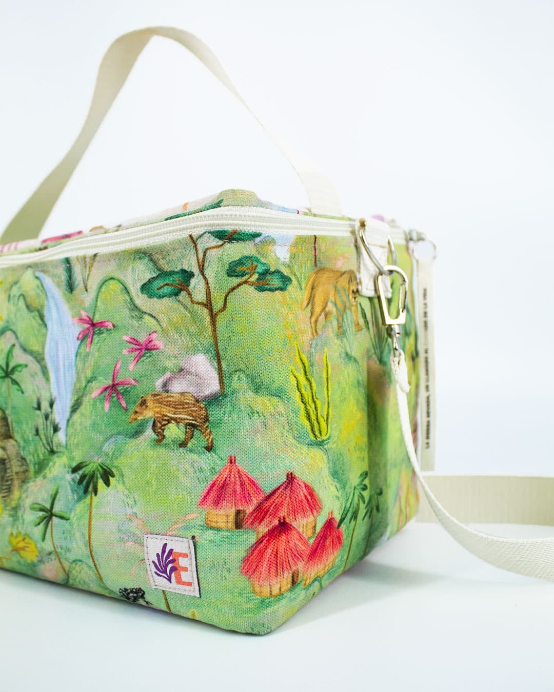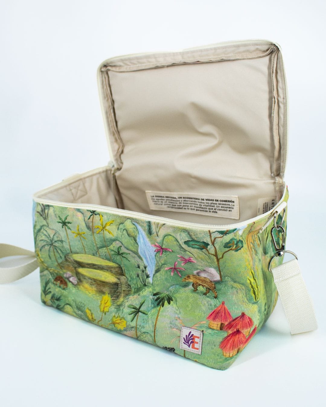 Lonchera con nuestro estampado “La Sierra Nevada, un ecosistema de vidas en conexión – De agudas pendientes y abarcando todos los pisos térmicos, La Sierra es un espacio de intercambio de vitalidad. Un escenario natural único que nos pone en manifiesto que el convivir en reciprocidad es lo que garantiza la vida.”