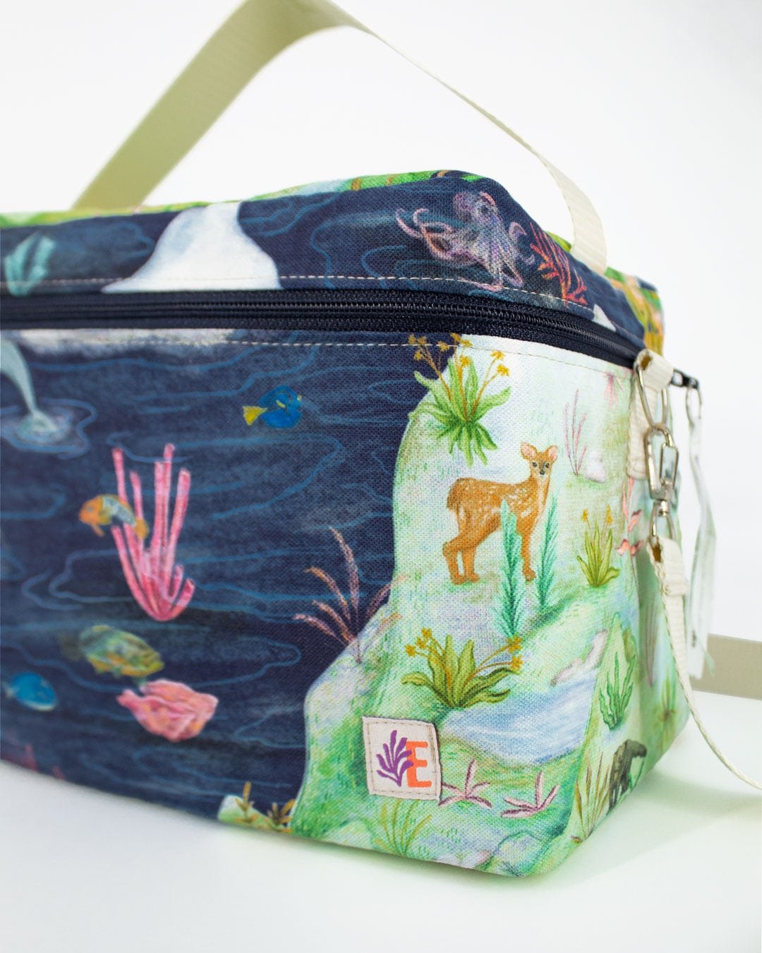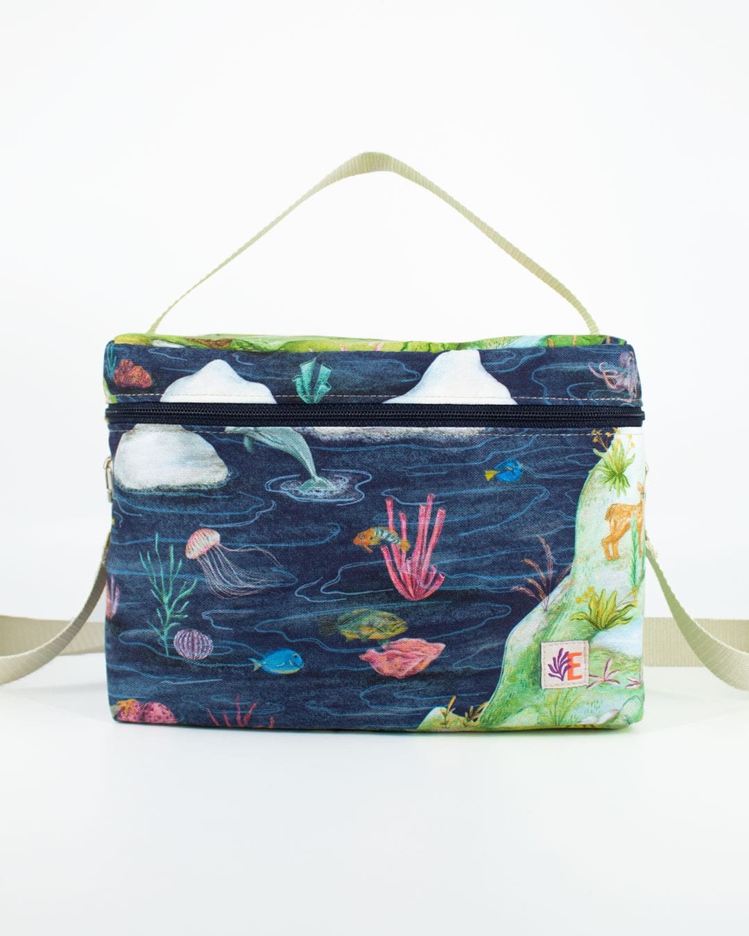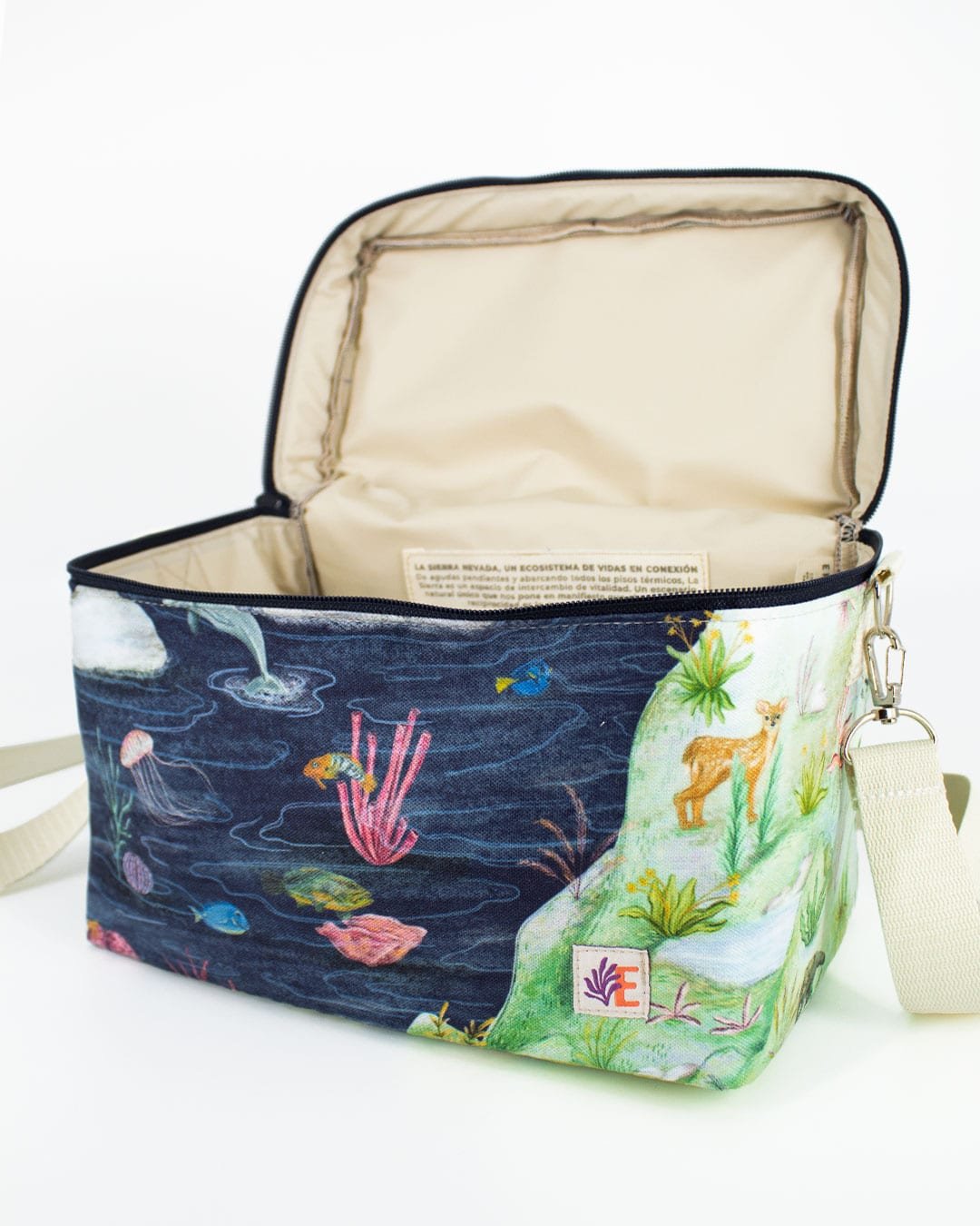 Lonchera con nuestro estampado “La Sierra Nevada, un ecosistema de vidas en conexión – De agudas pendientes y abarcando todos los pisos térmicos, La Sierra es un espacio de intercambio de vitalidad. Un escenario natural único que nos pone en manifiesto que el convivir en reciprocidad es lo que garantiza la vida.”