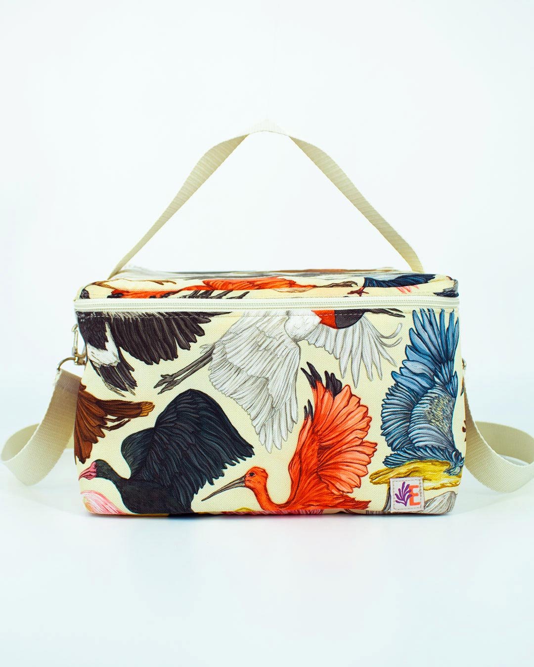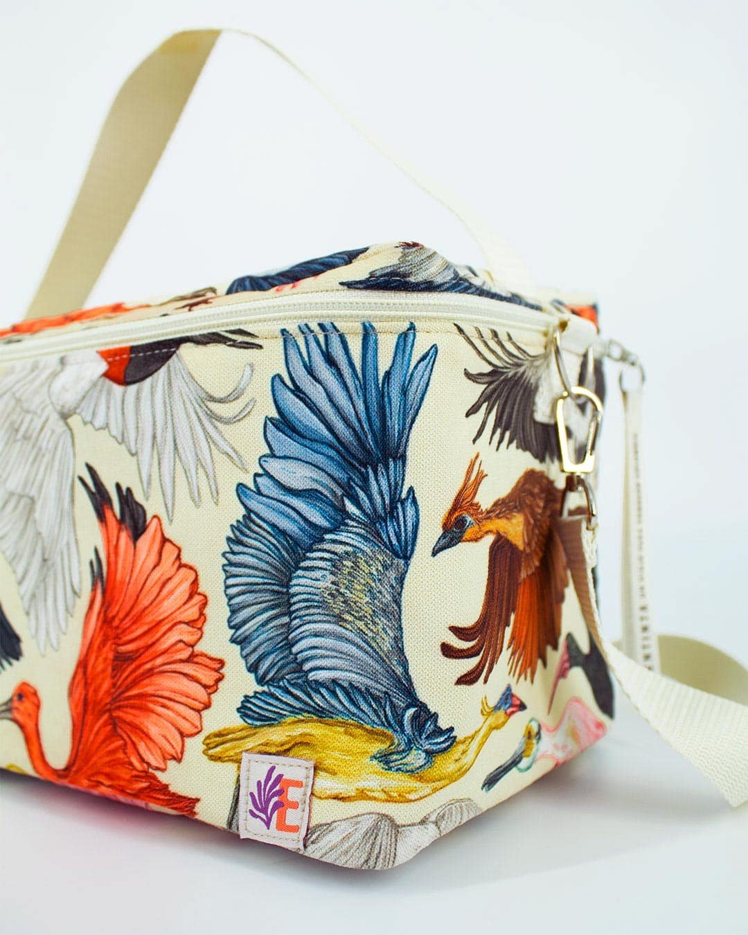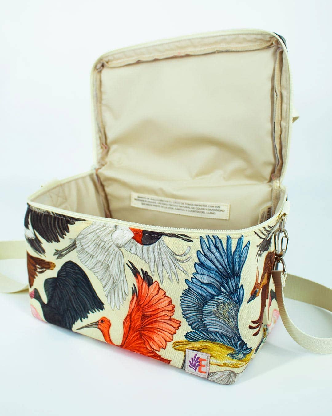 Lonchera con nuestro estampado Tierra de Aves, Diversidad de Vida y Color – Bandas de aves florecen el cielo de tonos infinitos con sus vistosos plumajes. Un espectáculo natural de color y diversidad que hace parte de la vida, cantos y cuentos del llano”.