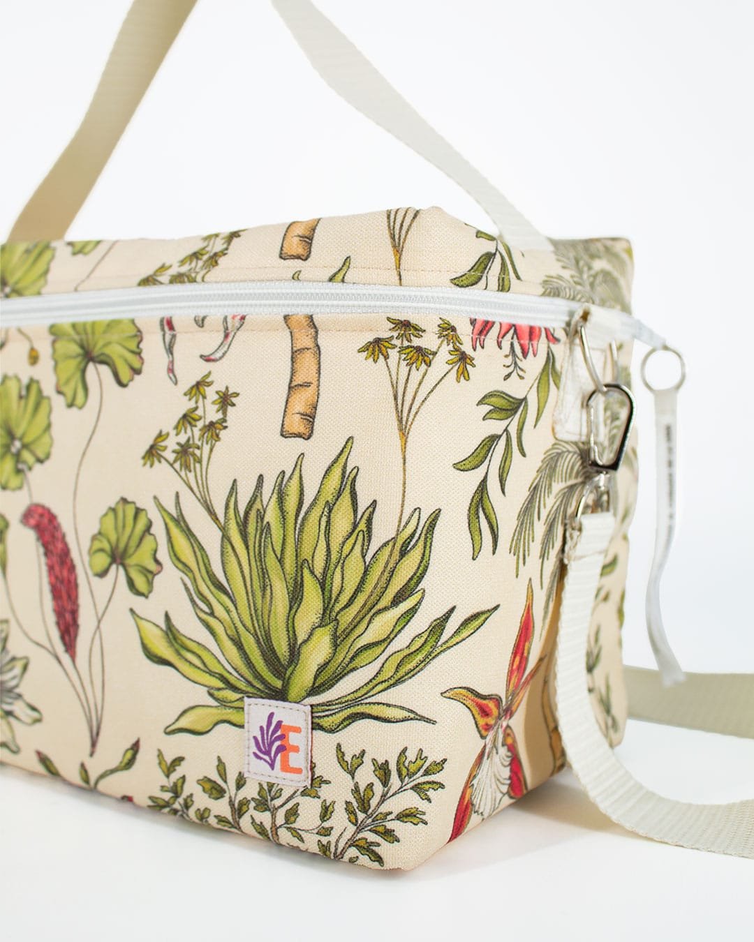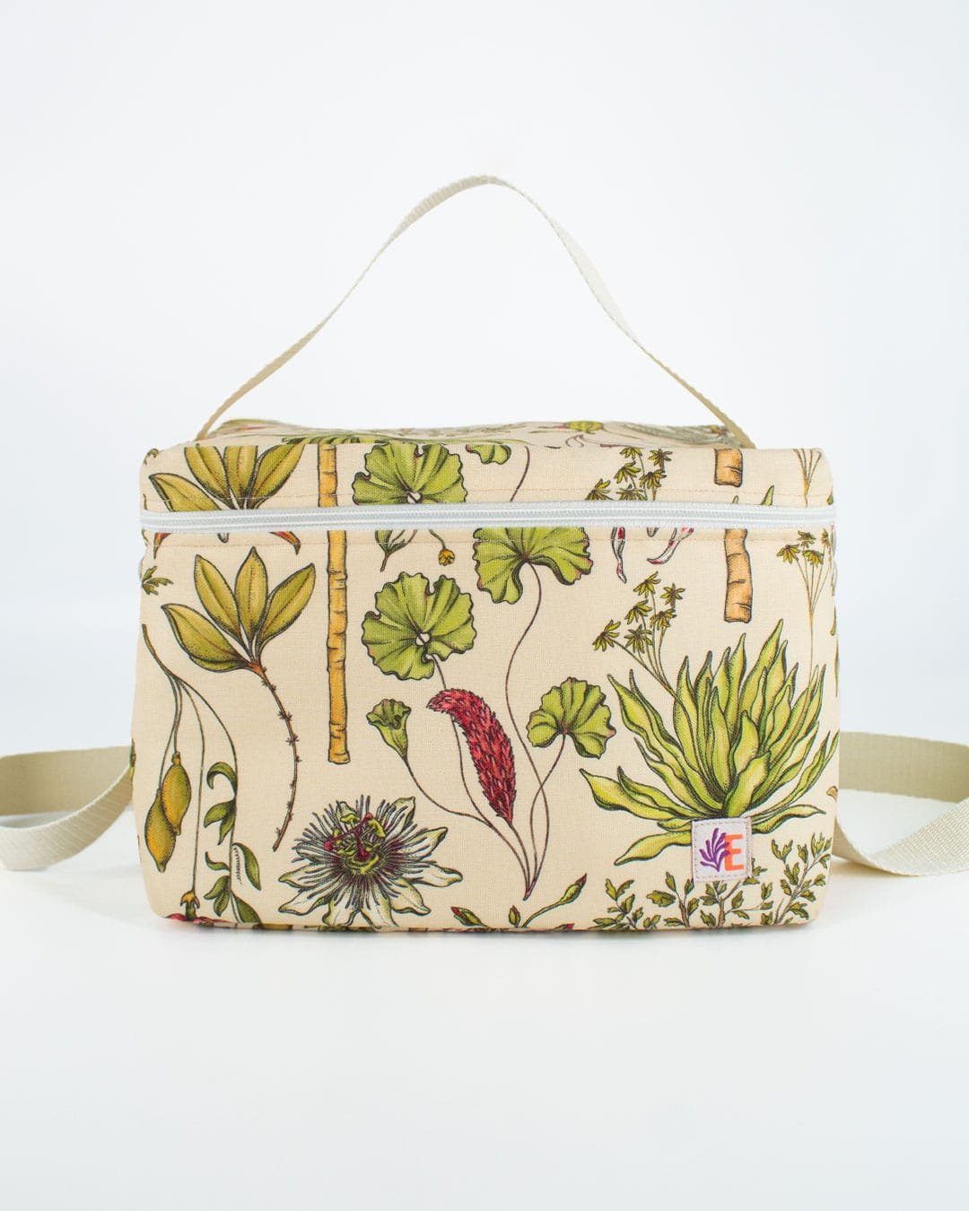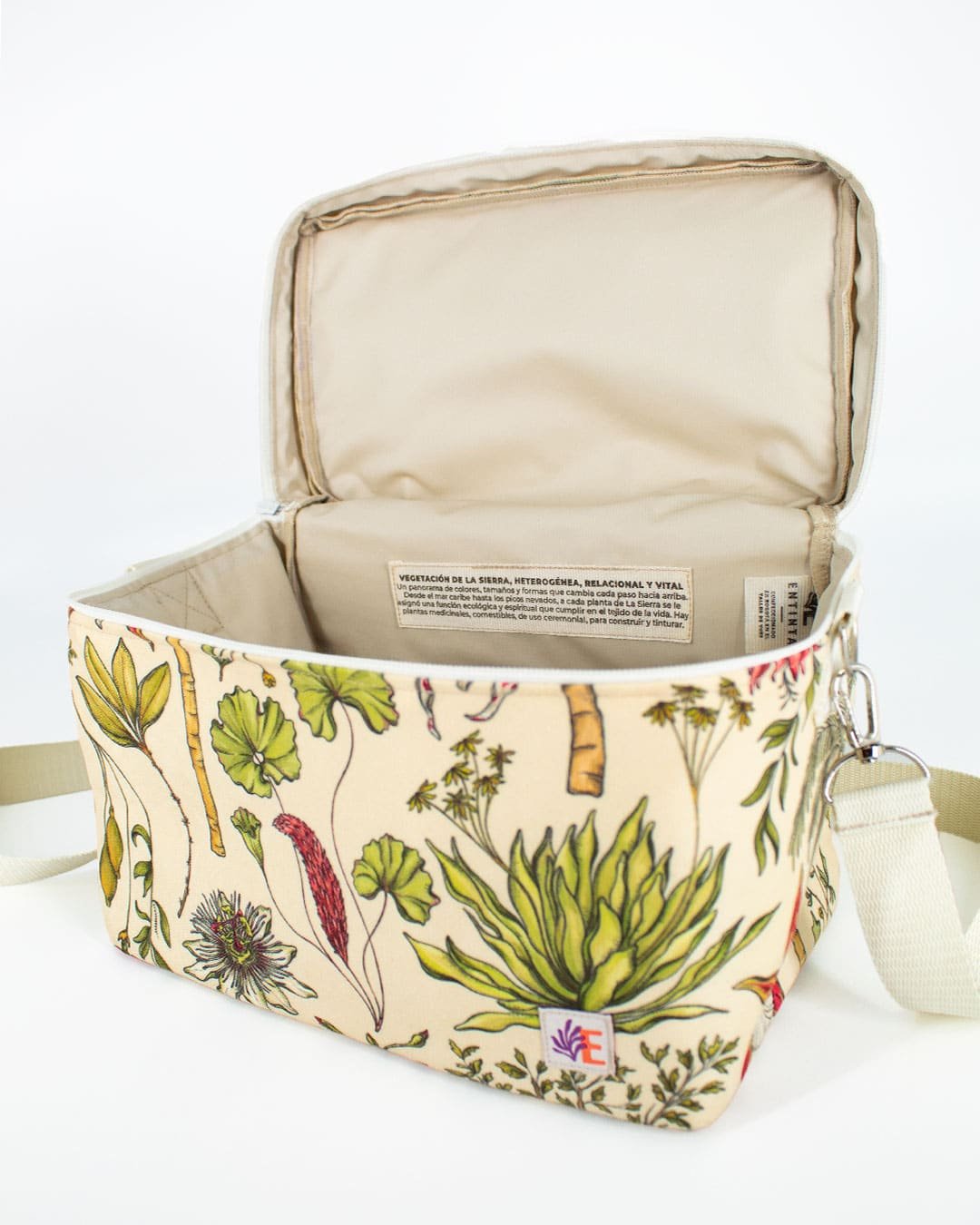 Lonchera con nuestro estampado “Vegetación de La Sierra, heterogénea, relacional y vital – Un panorama de colores, tamaños y formas que cambia cada paso hacia arriba. Desde el mar caribe hasta los picos nevados, a cada planta de La Sierra se le asignó una función ecológica y espiritual que cumplir en el tejido de la vida. Hay plantas medicinales, comestibles, de uso ceremonial, para construir y tinturar.”.