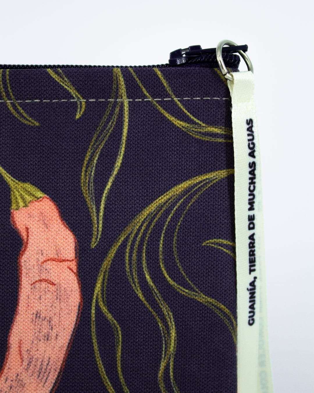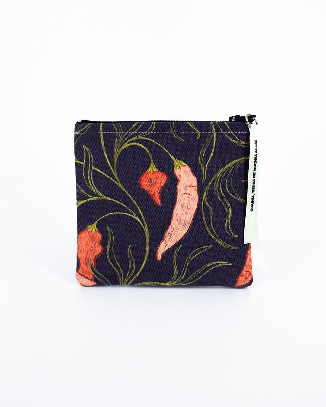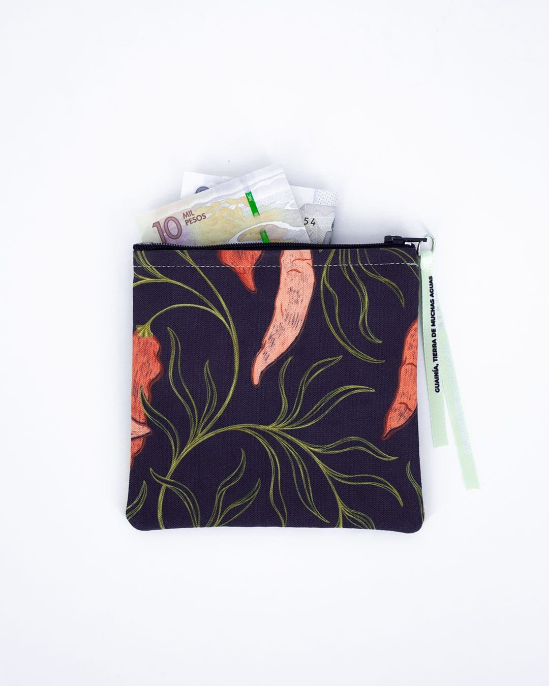 Monedero con nuestro estampado “Ají, Alimento Espiritual – Sembrado en las chagras, un sistema de cultivo indígena, el ají es una planta sagrada que cumple un papel alimenticio y espiritual en las comunidades”.