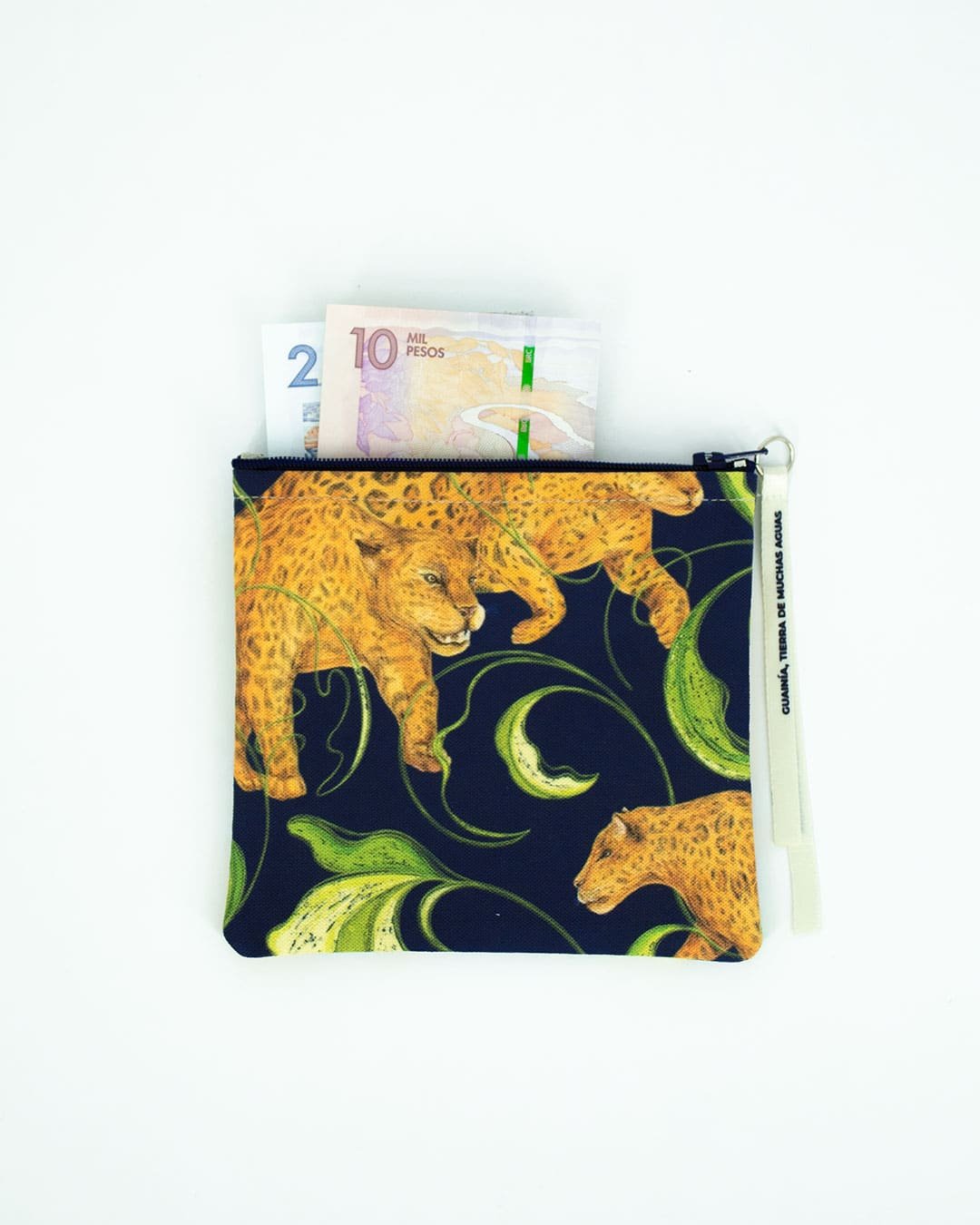 Monedero con nuestro estampado “Hogar del Jaguar, Naturaleza Salvaje –Guardian y protector de la naturaleza inmensa y salvaje, camina el jaguar libre por las infinitas sabanas del llano. Un hábitat donde convive con otros animales, manteniendo el equilibrio y dinámica natural del ecosistema”.